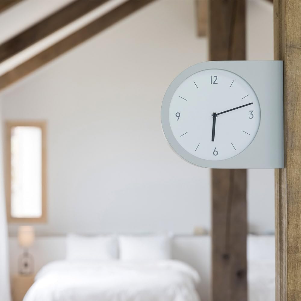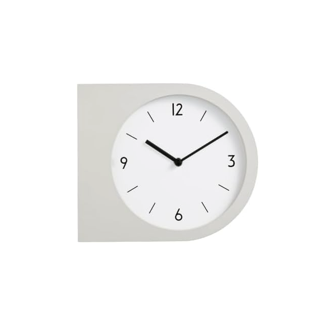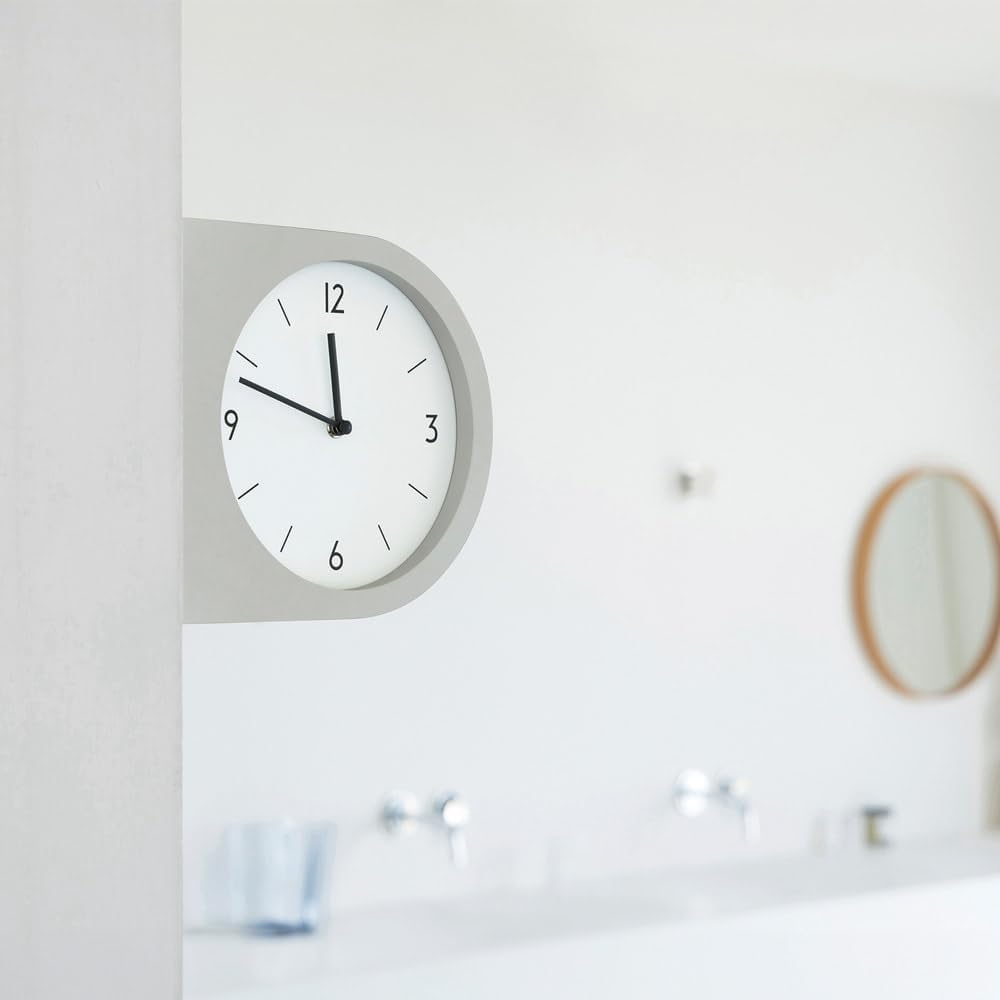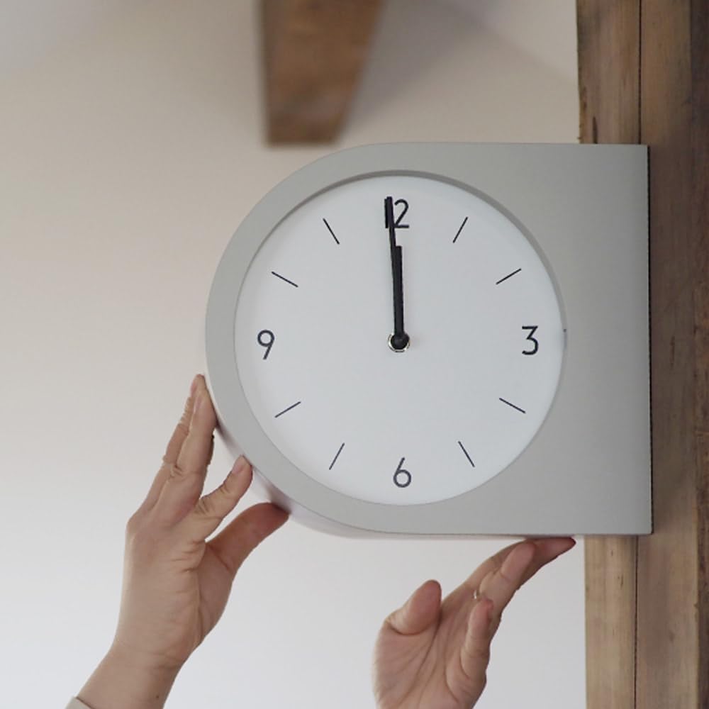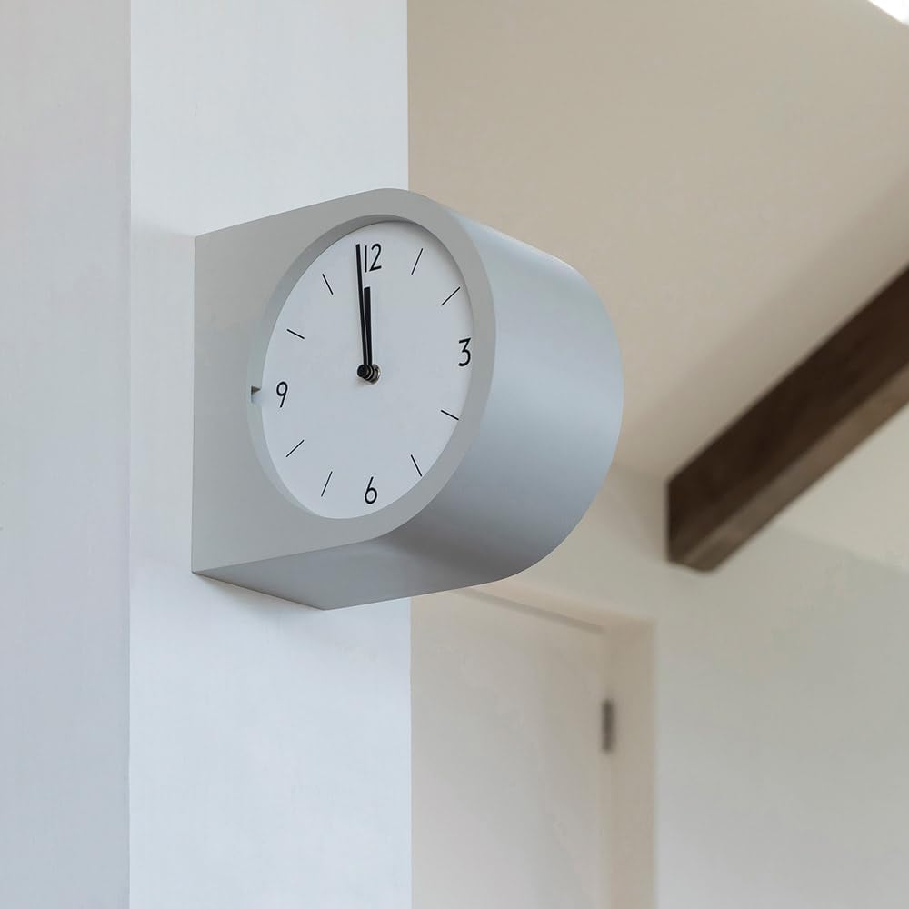 暮らしに馴染むをコンセプトにスタートした両面時計です。立方体に近い厚みのあるミニマルなフォルムは設置すると壁や柱から突き出たようなユニークさがあり存在感抜群です。サイズ感を抑えたことで大げさにならず、半円を描くアールがどこかかわいらしい印象にも。無駄のないフォルムに合わせて文字盤デザインやカラーリングも極力シンプルにまとめました。