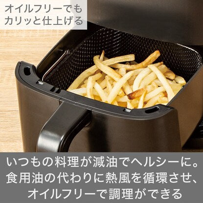いつもの料理が減油でヘルシーに。食用油の 替わりに熱風を循環させ、オイルフリーで調理が できる。
