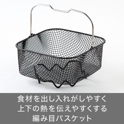 食材の出し入れがしやすく上下の熱を伝える編み目バスケット