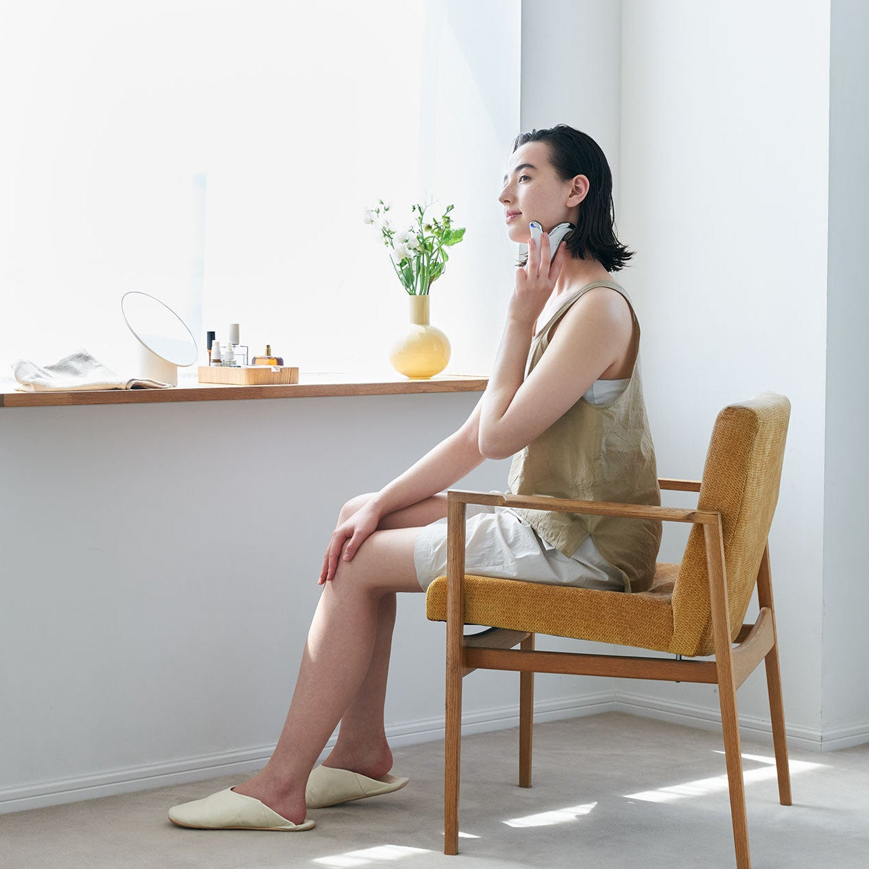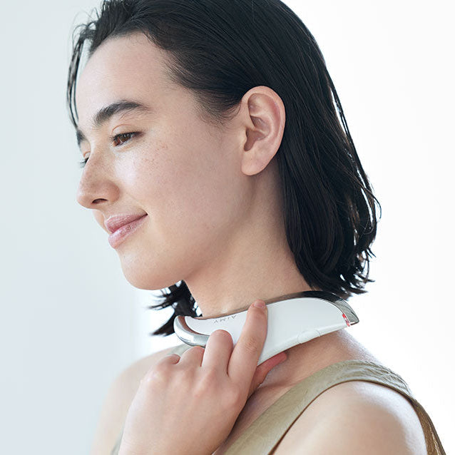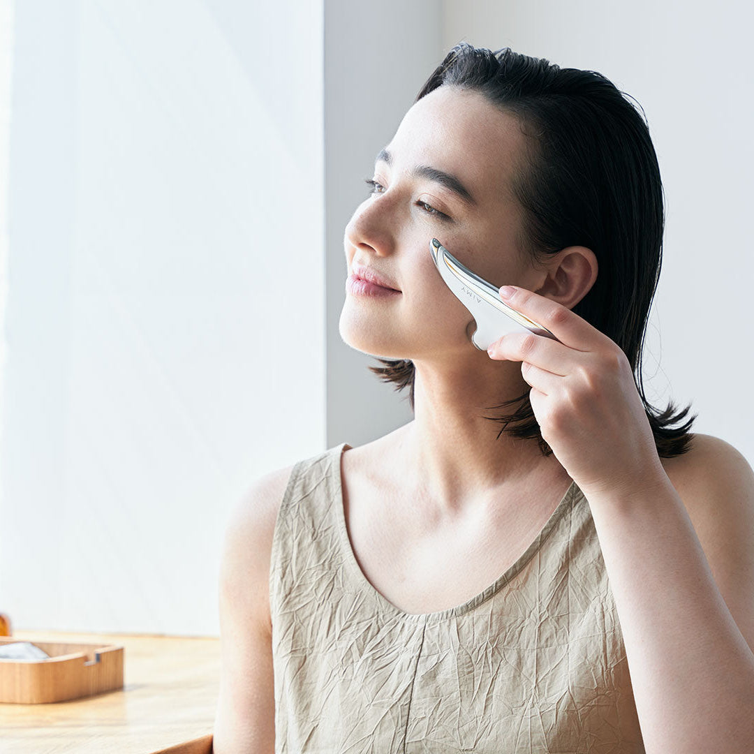 フェイスもボディも同時にめぐりケア 肌の上でプレートをすべらせ、顔や全身のめぐりを促す温感カッサ。ヒーターで肌を温め、マイクロカレントで電気刺激を与えることで 無理なく心地よく全身の筋肉にアプローチします。片手で握って動かしやすい、コンパクトサイズのオリジナルフォルム。フェイスラインやほうれい線のケア、首すじやデコルテまで、4つの曲線が肌にフィットし、毎日の顔周りケアを効率よく行えます。突起を利用して軽い力で指圧マッサージ つかむ、伸ばす、押す、流す、4つの動作でトータルケアを実現。 突起部分を押し当てることで、全身のマッサージも可能です。