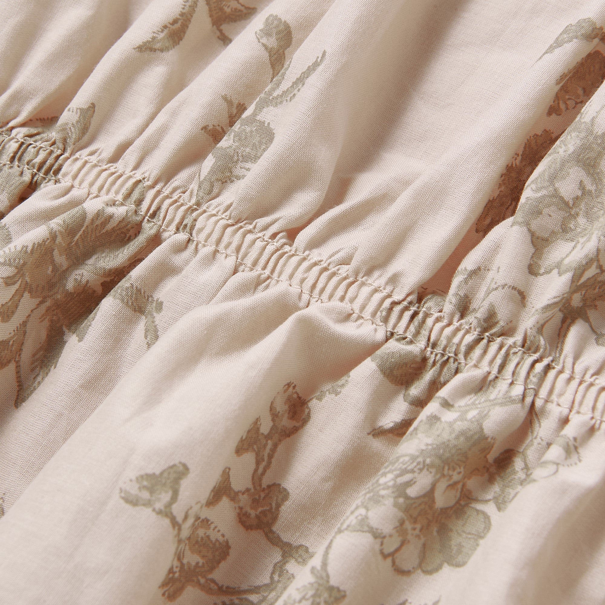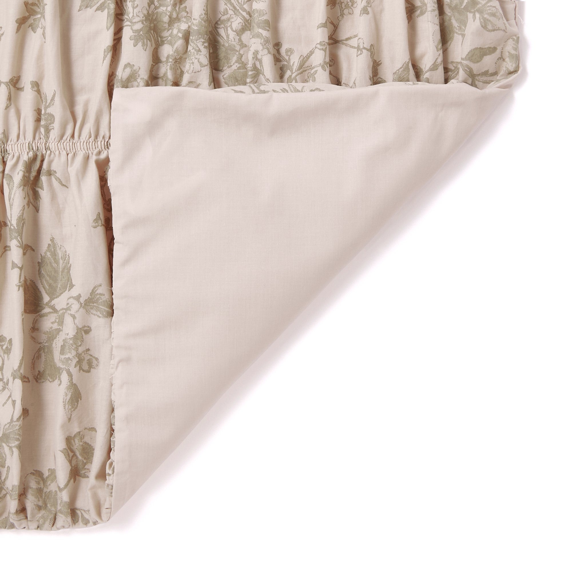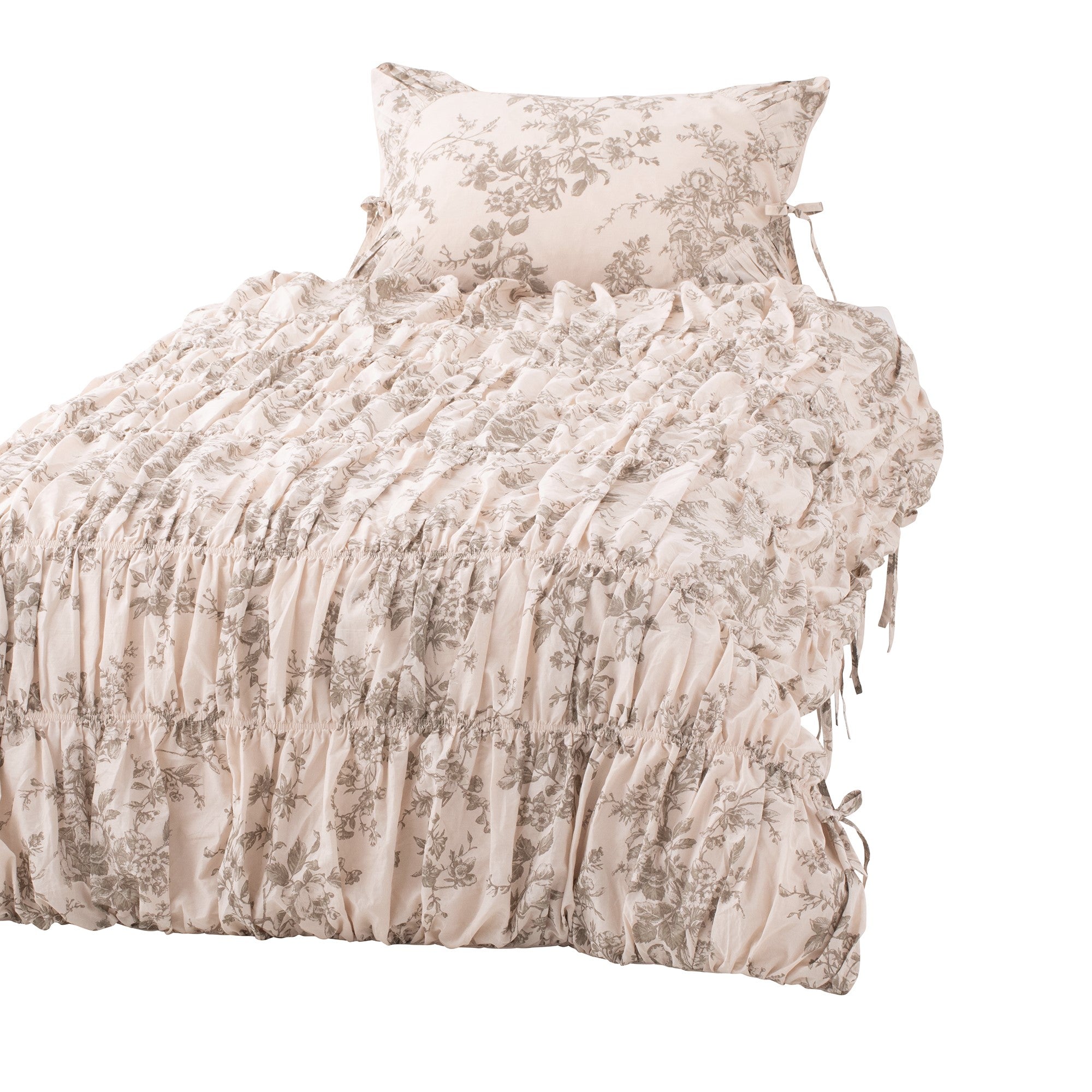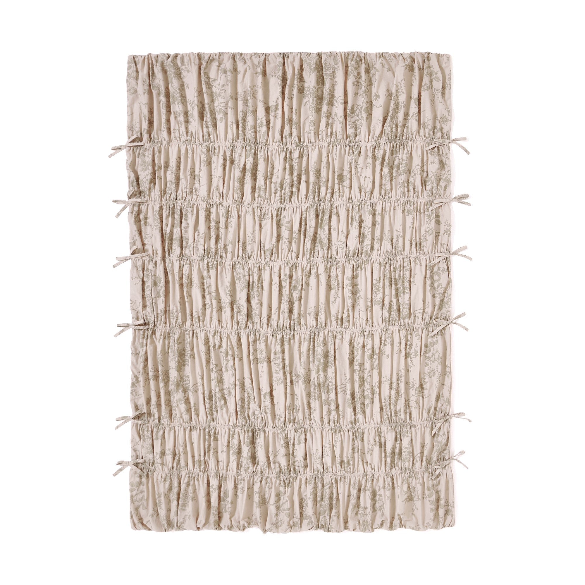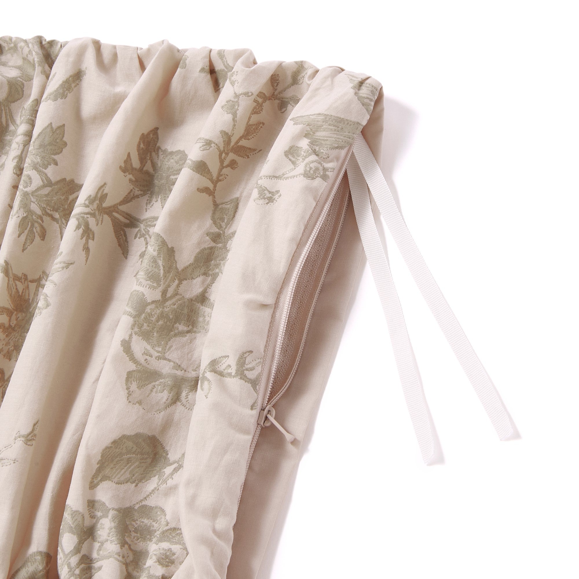 たっぷりとしたギャザーが可愛らしい掛け布団カバーです。 両サイドに施したリボンを細身にすることで甘くなりすぎず、程よく大人可愛いデザインです。 ベース色に馴染むような色味でプリントを施し、柄ものながら取り入れやすく、立体的な縫製仕様で華やかさを感じさせる仕上がりになっています。 ▼掛け布団カバーの中材はこちら 掛け布団一覧