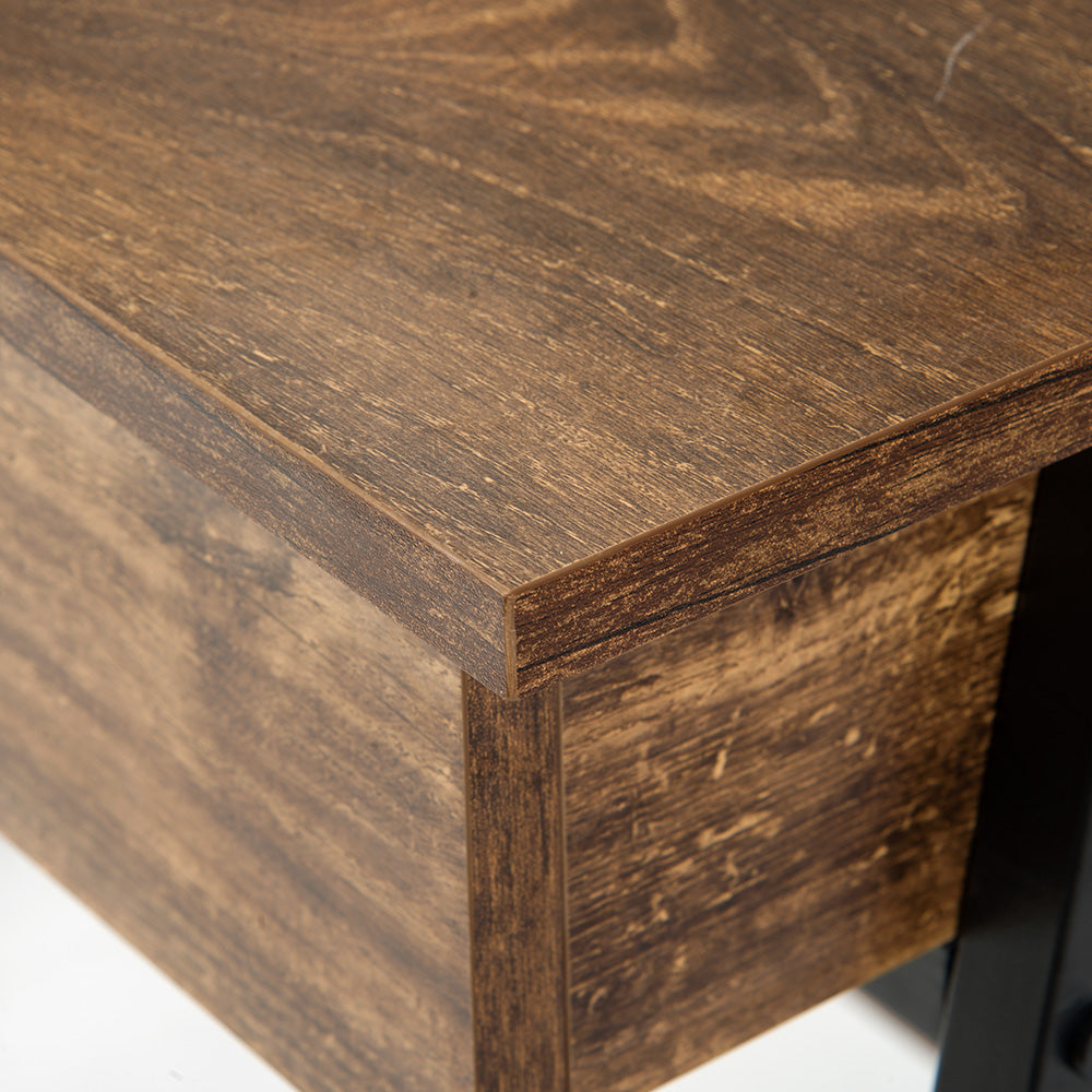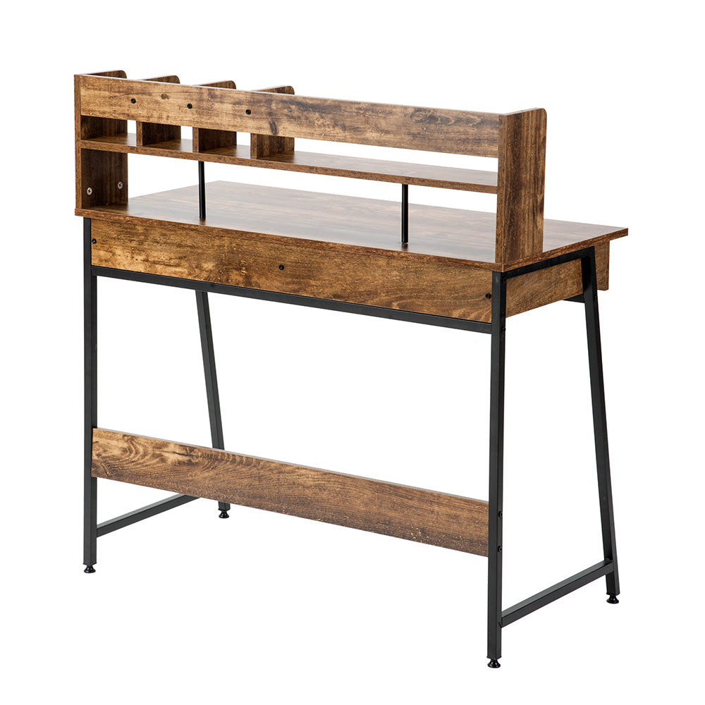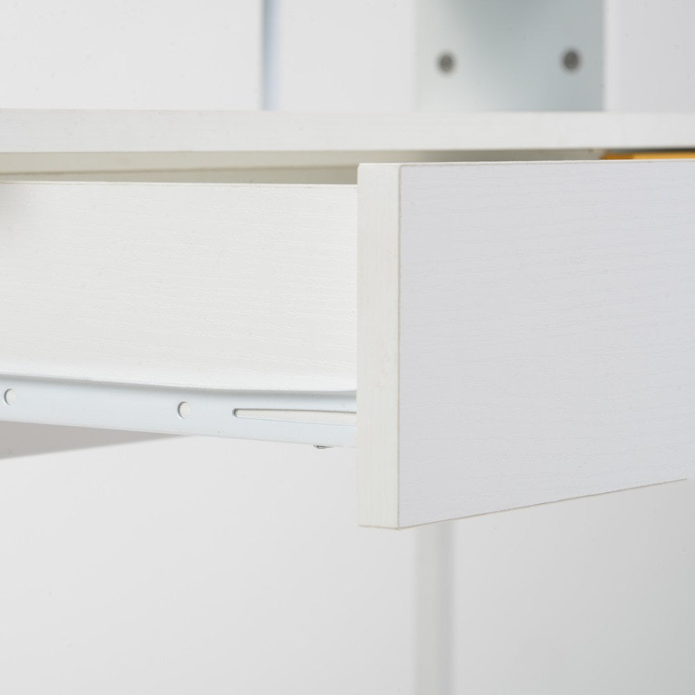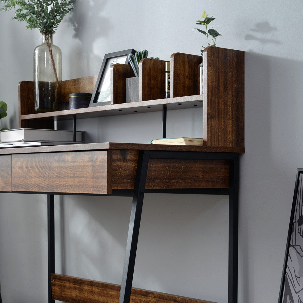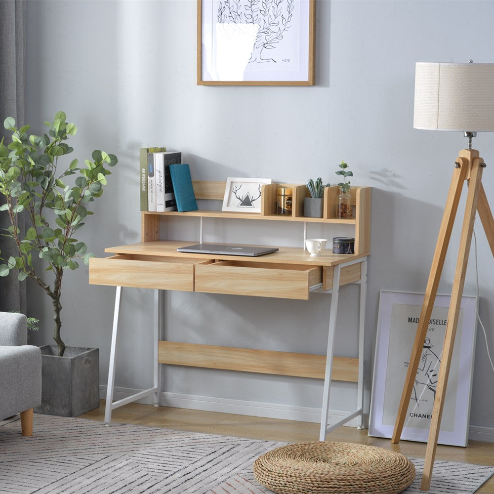 木目風収納台付きワークデスクは、スタイリッシュで機能的なデザインが魅力のデスクです。3色展開で、どんなインテリアにもマッチします。デスク上部には便利なラック収納があり、本や小物をすっきり整理。メラミン化粧板を使用し、傷や水に強く、長持ちします。スムーズな開閉が可能な引き出し付きで、スライドレール採用でストレスフリー。リアルな木目調とスチール脚の組み合わせがモダンな印象を演出。アジャスター付きの脚で安定性も抜群。幅100cm、奥行48cm、高さ102.5cmとコンパクトながら十分な作業スペースを確保。ホームオフィスや勉強スペースに最適なデザインと機能性を兼ね備えた一品です。