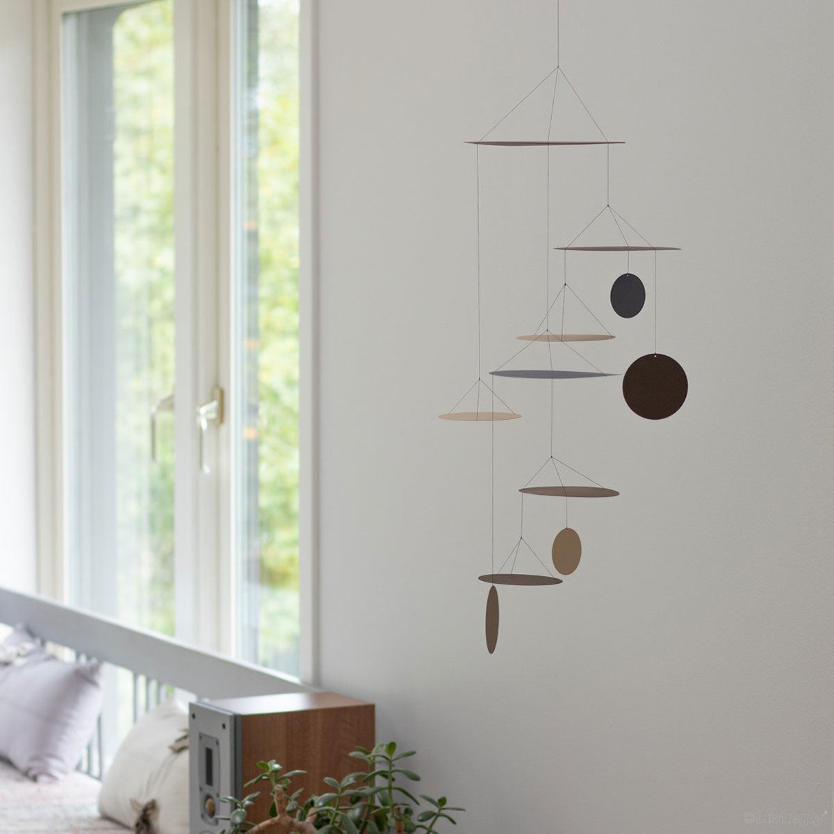その姿はUFO?円盤のようなフォルムのオブジェクトがいくつも連なったモビール。UFO モビールは、1964 年にニューヨークで開催された世界博覧会で展示されたデザイン性の高いモビール。独創的なデザインで名をはせるデザイナー クヌードセン夫妻が手がけました。ブラック、ベージュ、ブラウンで構成されたモビールは落ち着いた雰囲気。インテリアとも合わせやすいカラーリングです。オブジェクトの面が上を向いているので、上から見ると円形でオブジェクトのカラーがよく見えますが、真横から見るとオブジェクトが細長い形に早変わり。見る角度によって全く違う姿を見せてくれるモダンなペーパーモビールです。軽やかな紙製で、簡単に取り付け可能。画びょうやテープを使って、手軽にお部屋にデザインをプラス。飾るだけで空間を彩るアイテムです。窓辺や空調のそばにつるせば、風にふかれてくるくる、優雅にユラリユラリ…。眺めているだけで癒されます♪Livingly(リビングリー)はKent SejdelinとLouise Helmersenによって運営されているデンマークのデザイン・カンパニー。彼らはハンドメイドのペーパークラフトやモビールをデザインしています。そしてまた、デンマークでアンデルセンに匹敵するほどの人気と評価を受けるアンニ&ベント・クヌードセン夫婦の作品を「アンニ&ベント・クヌードセン・コレクション」として復刻し、広く紹介しています。