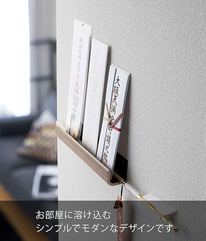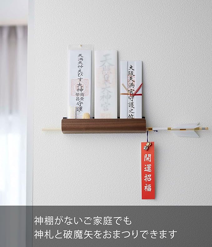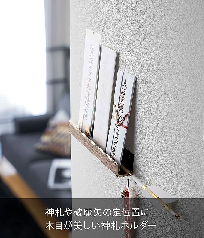 神札や破魔矢の定位置に。壁に付属の木ネジ又は石こうボード用プッシュピンで固定するだけ。神棚がないご家庭で置き場に困っていた神札や破魔矢を一緒に収納することができます。木目が美しい神札ホルダー。