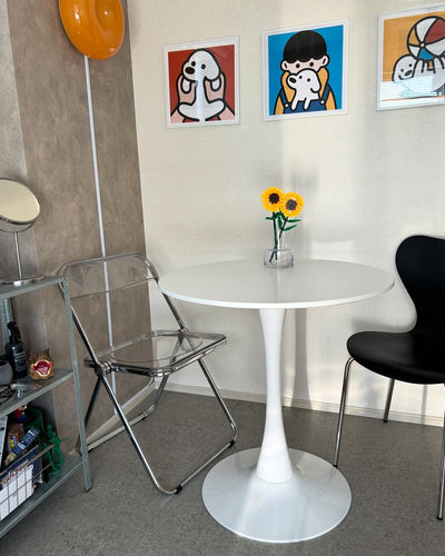 透き通った輝きが見る人を魅了するポリカーボネート製の折りたたみチェアです。室内のさまざまな色を透過させ、インテリアに色どりを加えます。