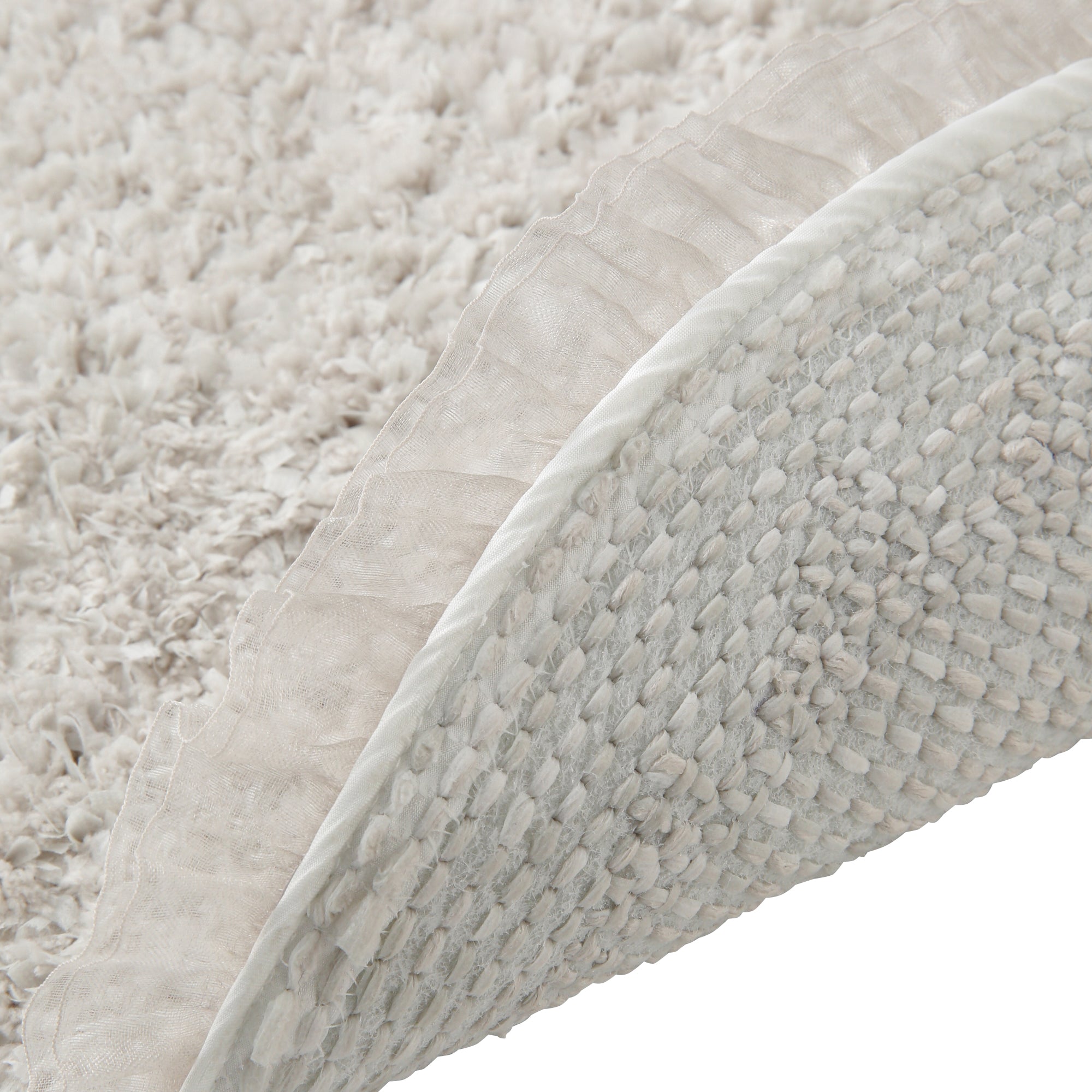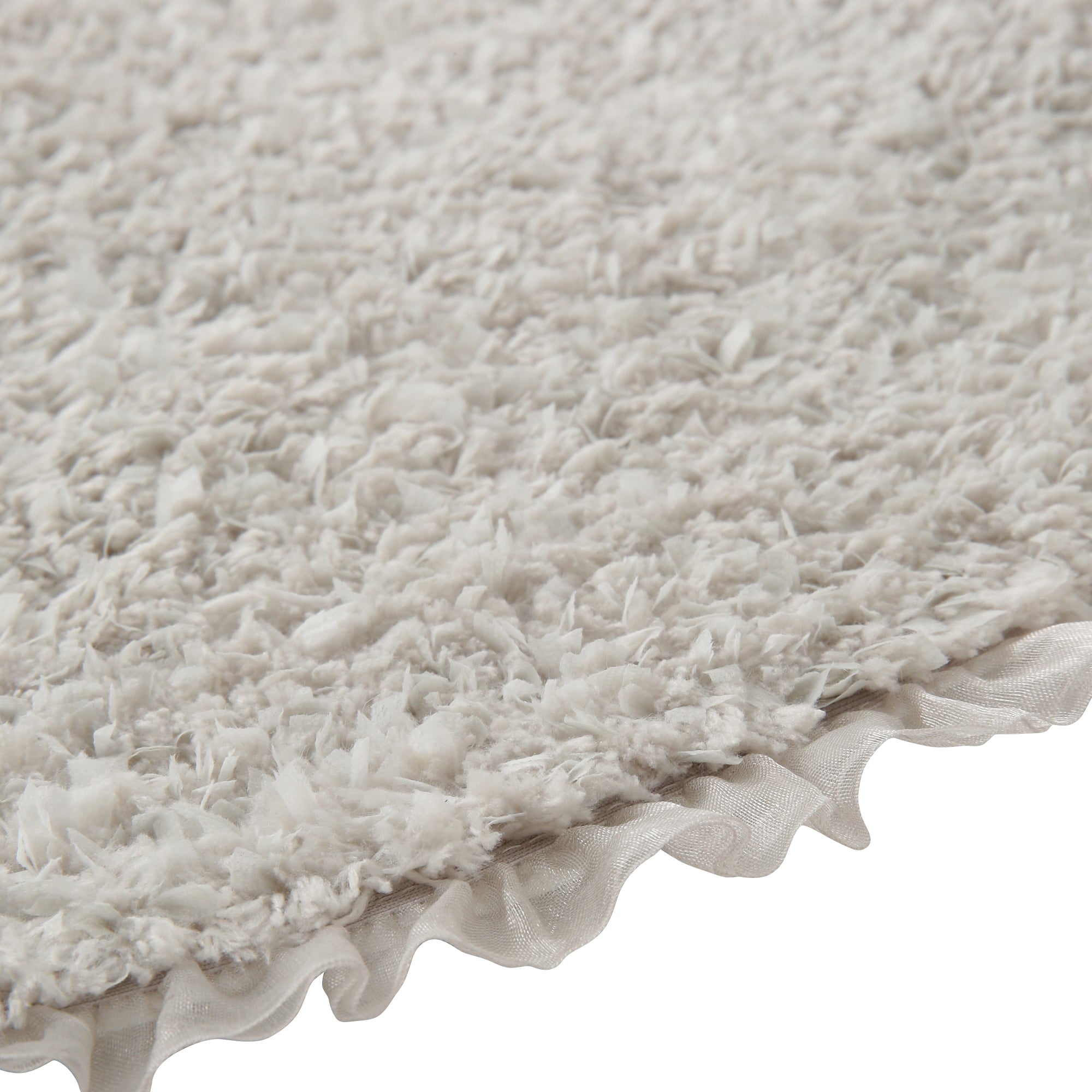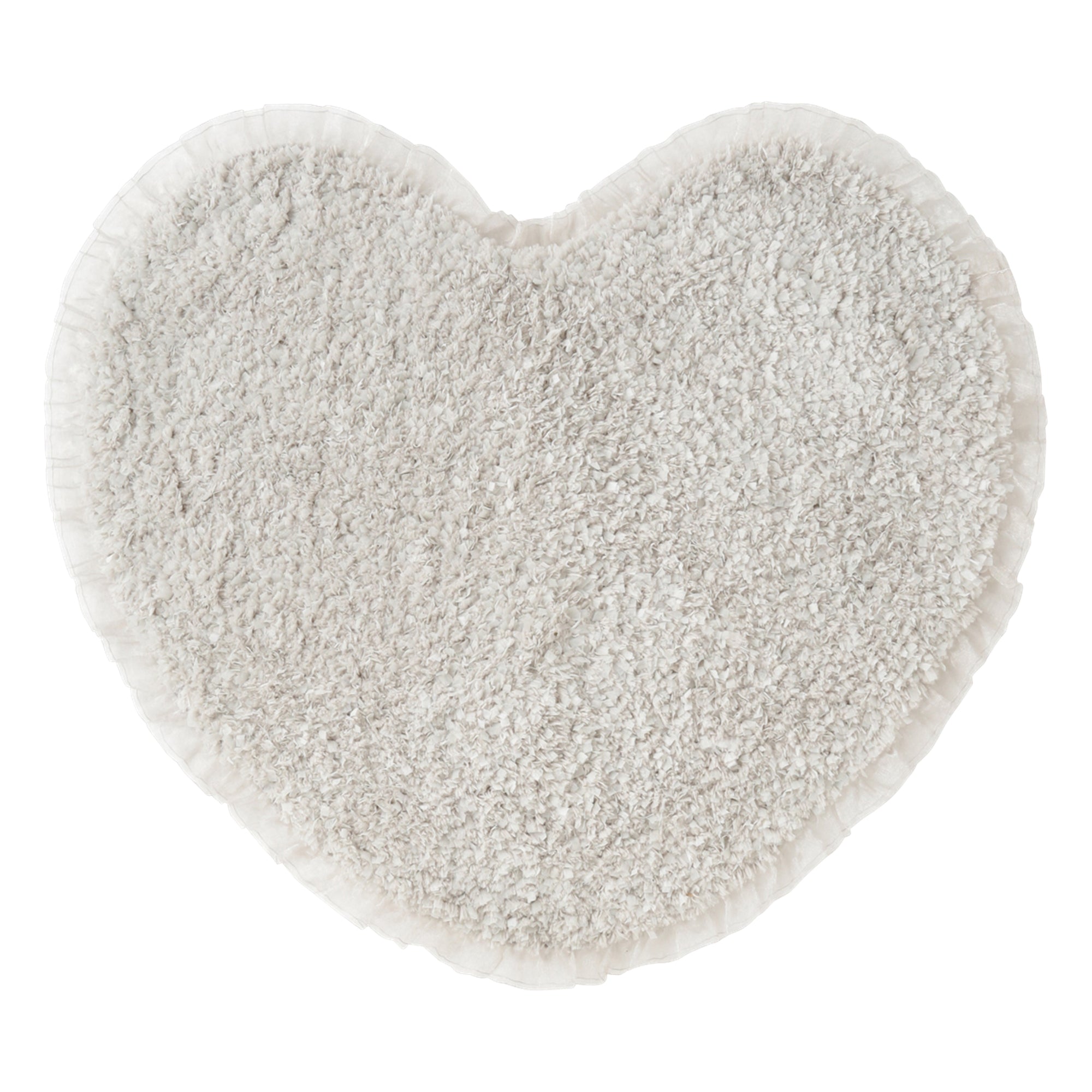 フチにフリルを付けたハート形のバスマットです。バスルームを可愛く演出します。ポリエステル糸にテープ状のナイロンの不織布を混ぜた新感覚のマットです。繊維の毛羽立ちがほとんどなく、毛玉が出にくいのが特徴で、不織布のシャリシャリとした独特の触感がお楽しみいただけます。ポリエステル糸なので吸水速乾も兼ね備え、バスマットにおすすめです。