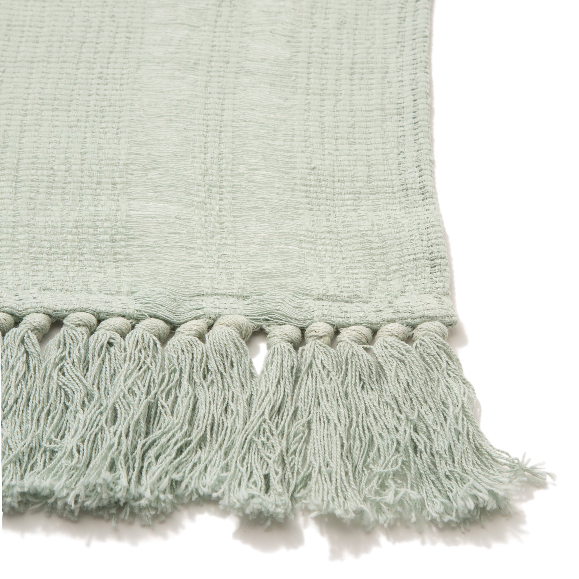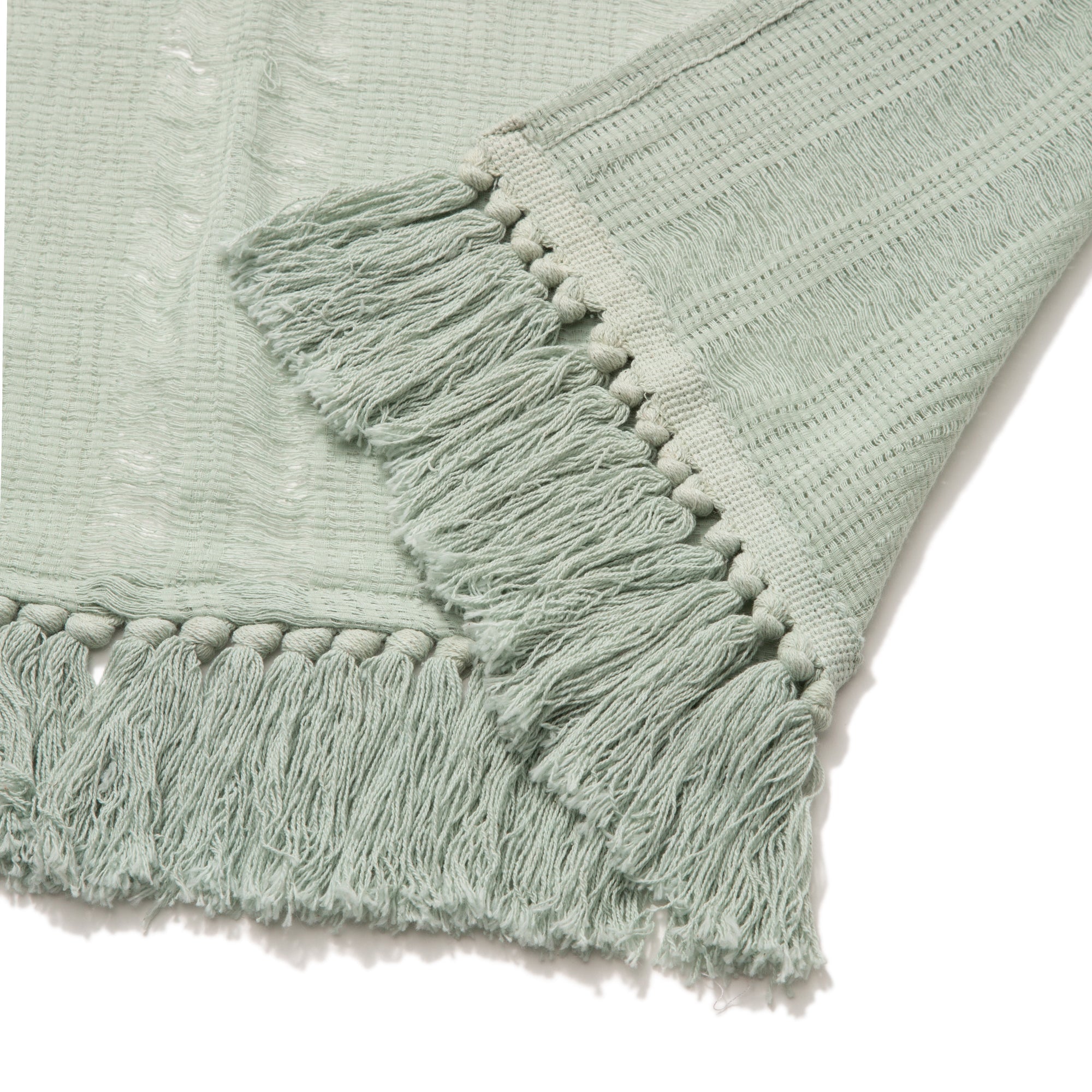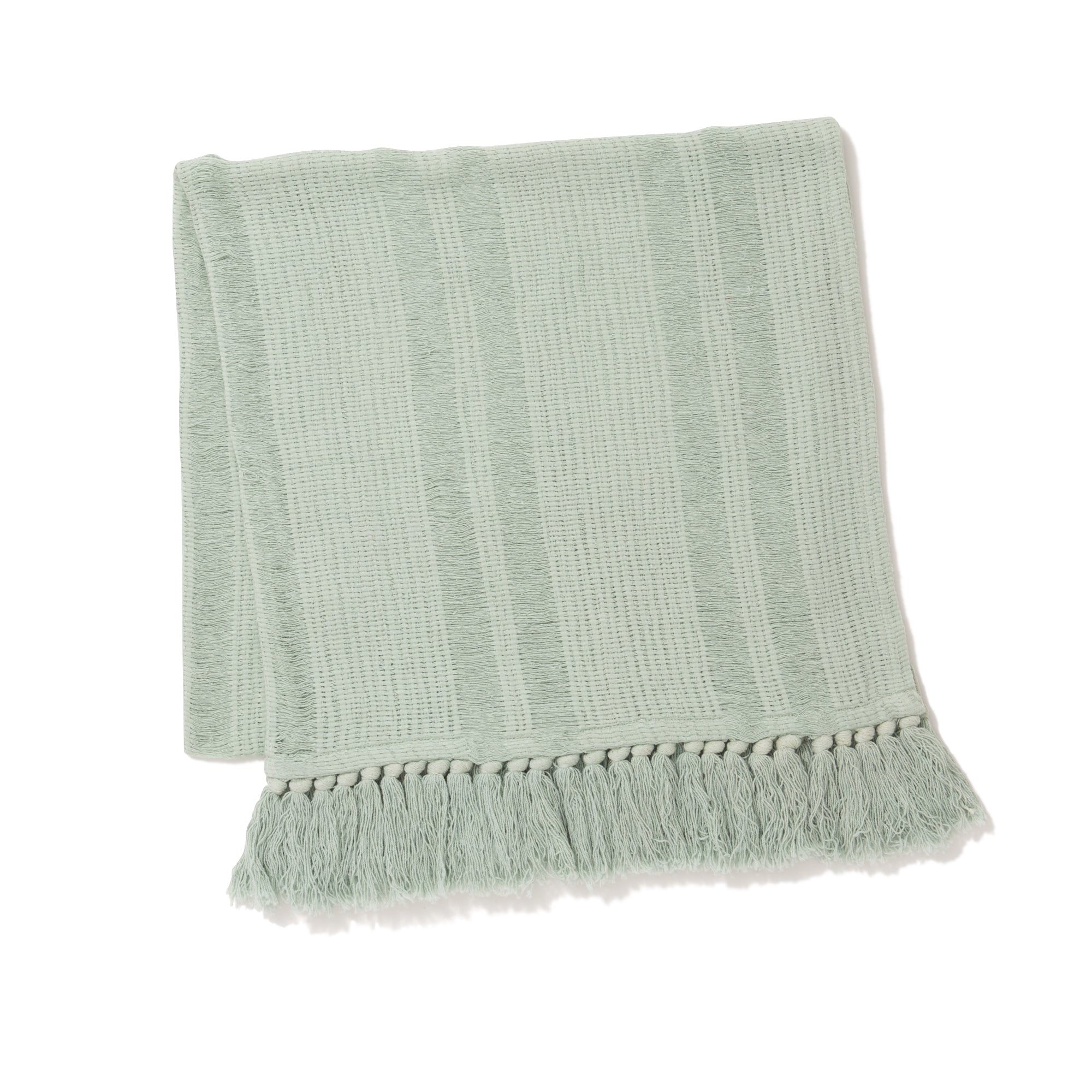 薄手でコットンの素材感が夏らしい涼やかなライトグリーンのスロー(ひざ掛け)です。とても軽く、ファッション性の高いデザインのため肩掛けとして場所を問わずご使用いただけます。