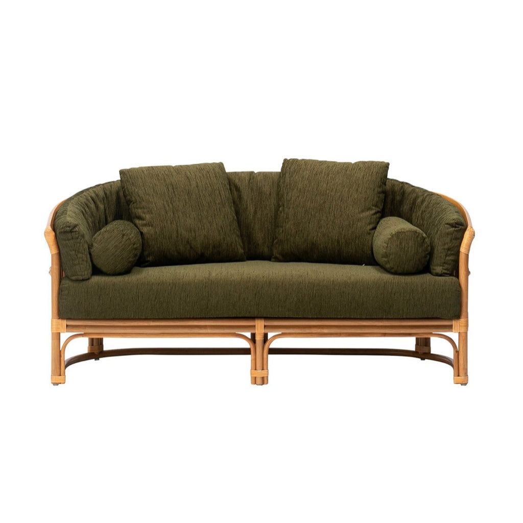アメリカの西海岸をイメージし、ラタンでフレームを組んだACME FURNITURE/アクメファニチャーの「BALBOA/バルボア」シリーズのソファです。BALBOAシリーズはアメリカ西海岸地方ではポピュラーな意匠であるラタン素材を採用しており、木家具では表現しにくいカーブをふんだんに取り入れています。接合部分にはレザーを巻きつけており、肌触りと経年変化をお楽しみ頂けます。座面には耐久性のあるノンエラスベルトを採用。長時間座っても疲れにくい、普段使いにおすすめのソファです。本体には2種類のクッションが付属しており、円柱状のクッションは着座した際に腰をサポートしたい時や横になる時の枕代わりに。45角のクッションはお好みのクッションカバーをご使用頂きコーディネートしていただけます。シリーズでグリーンとアイボリーの2色からお選びいただけます。