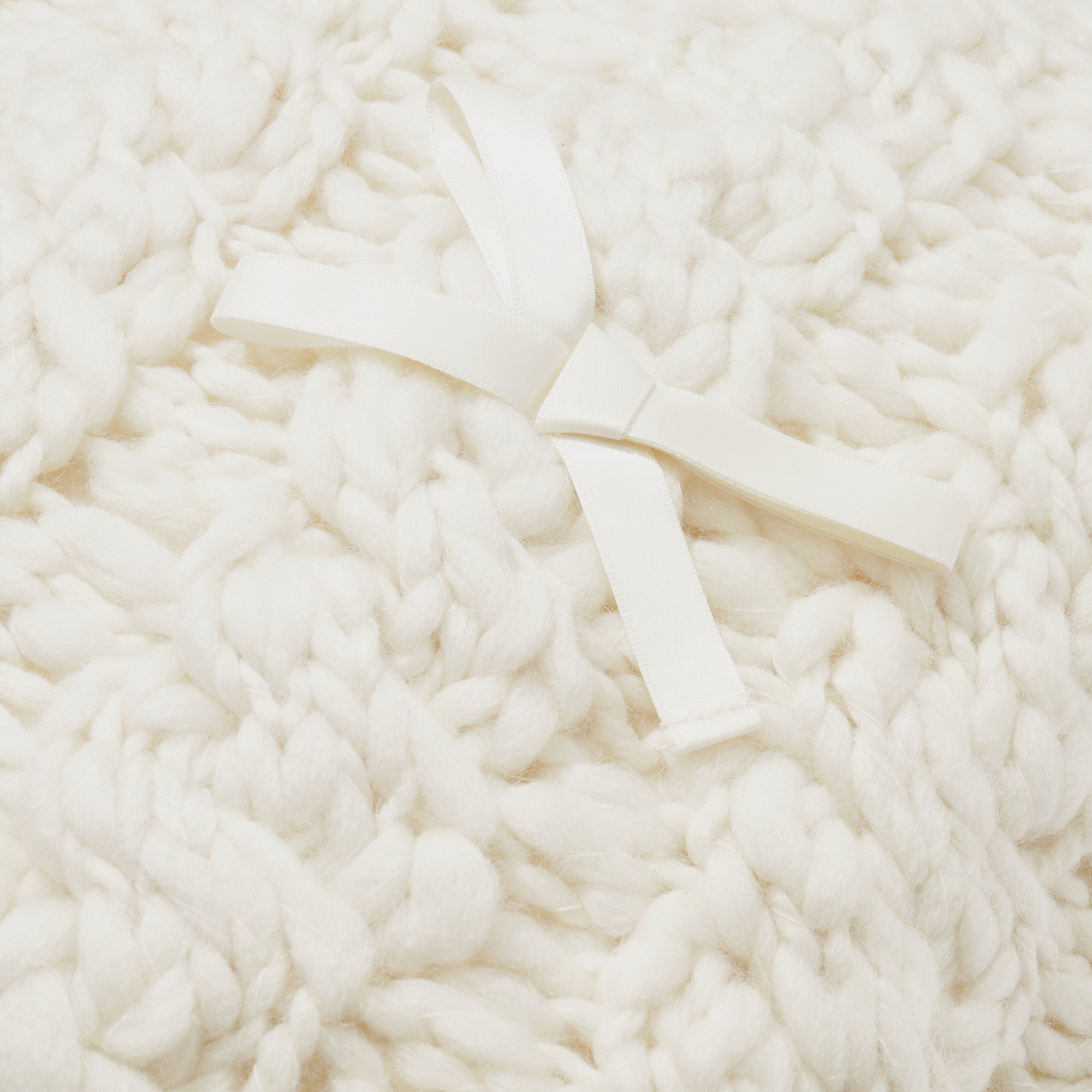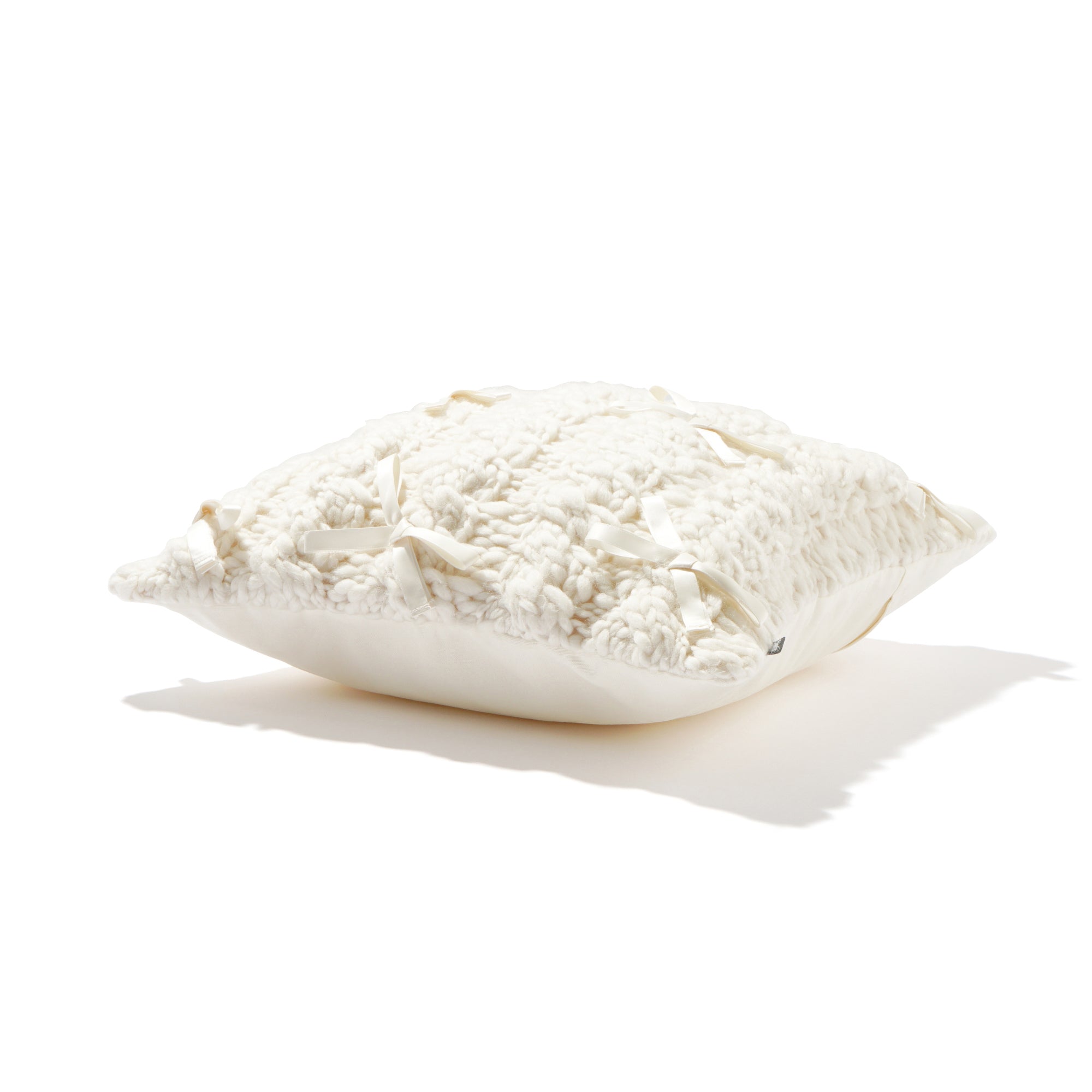 太番手で編み上げたニット生地にサテンのリボンをあしらったデザインです。 ▼クッションカバーの中材(別売り)はこちら クッションヌード一覧