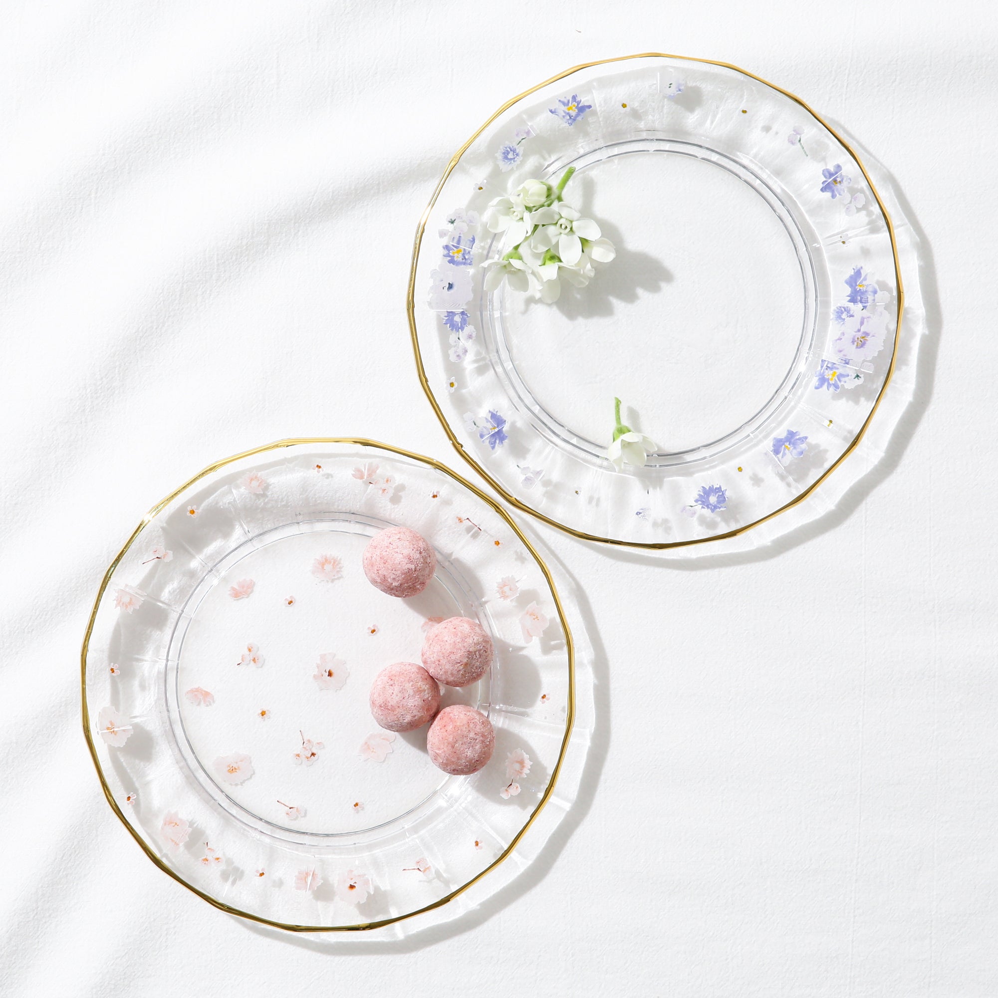 花柄のデザインをつけたフリルの形状の上品なガラスプレートです。紅茶やコーヒー、カフェオレやハーブティーに飲み物の色を楽しめます。きらきらと光を乱反射してくれるフリルカットを施し、朝・昼・夜で全く違う表情を見せてくれます。朝のモーニングコーヒーに、午後のアフタヌーンティーに、夕食後のリラックスタイムに。