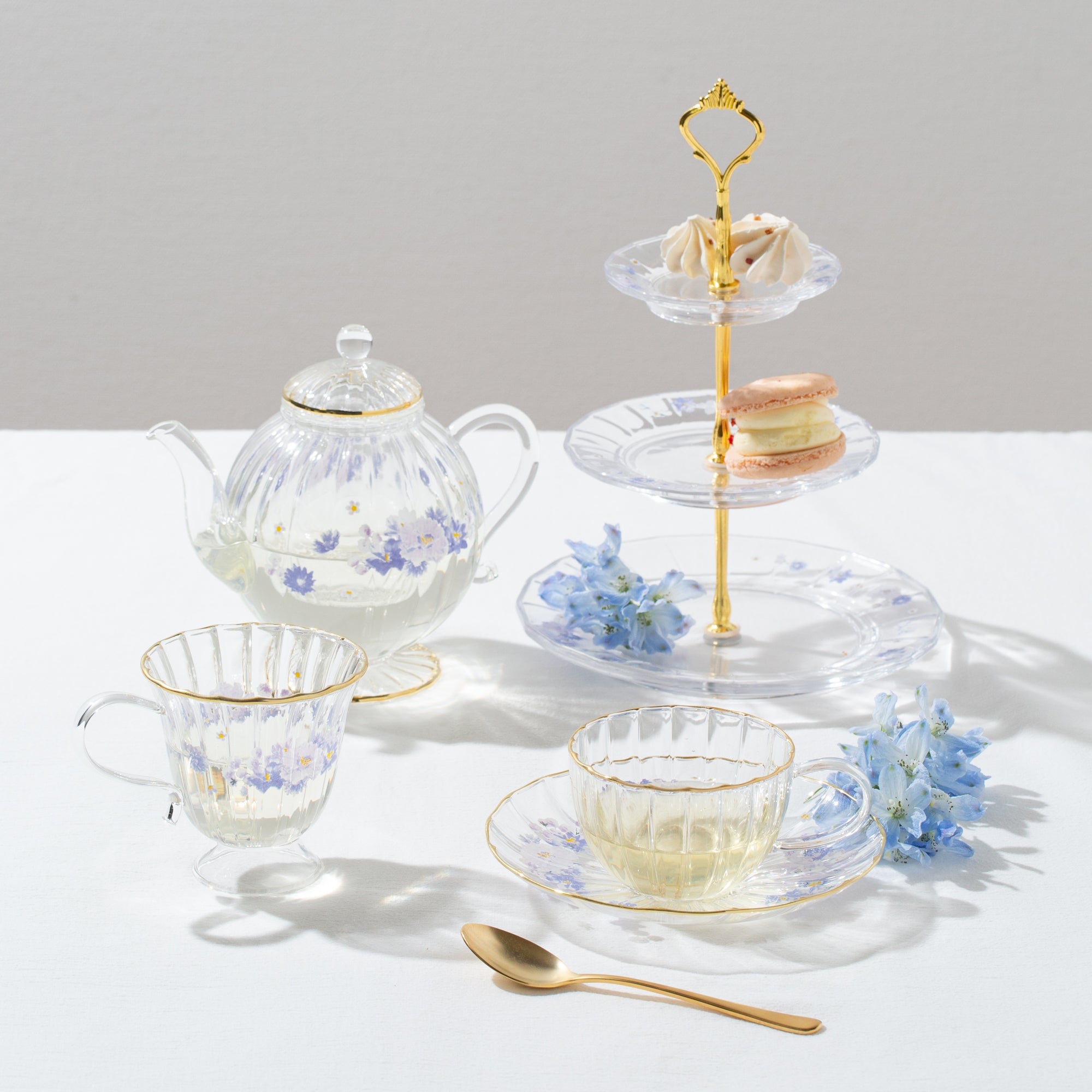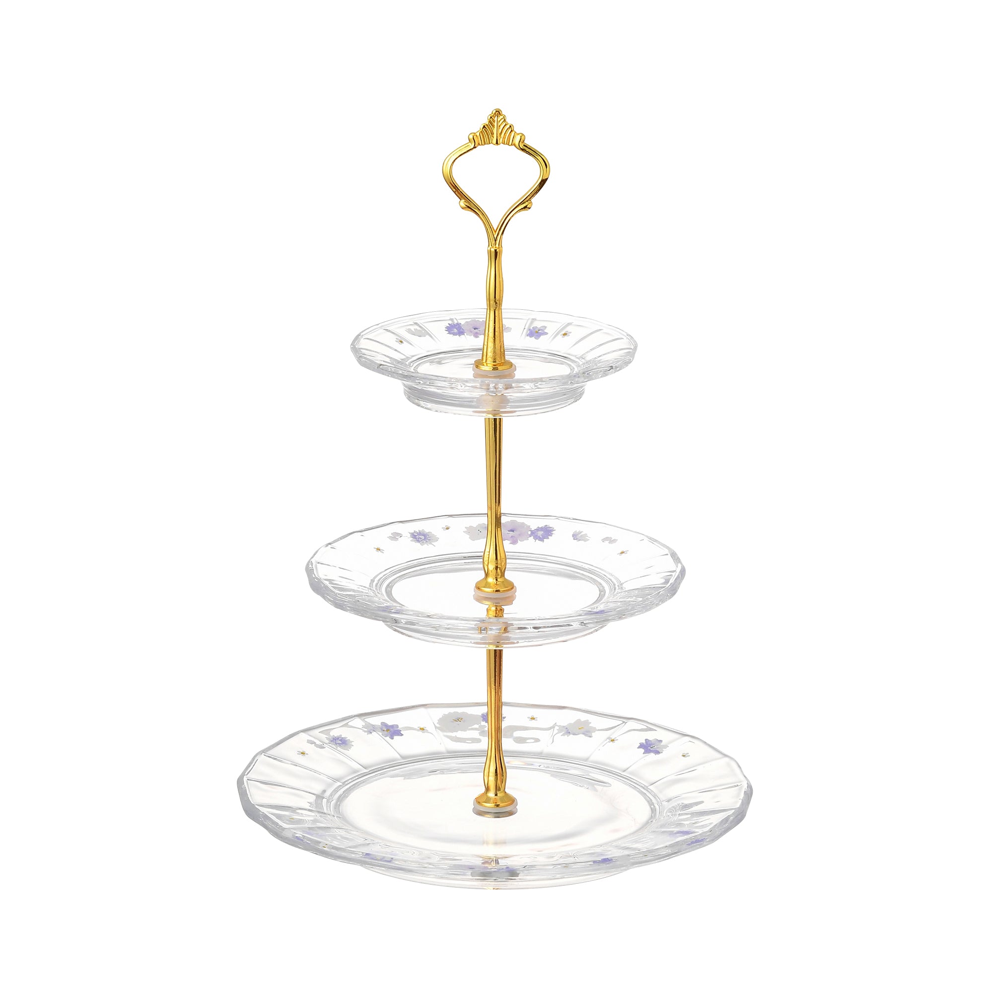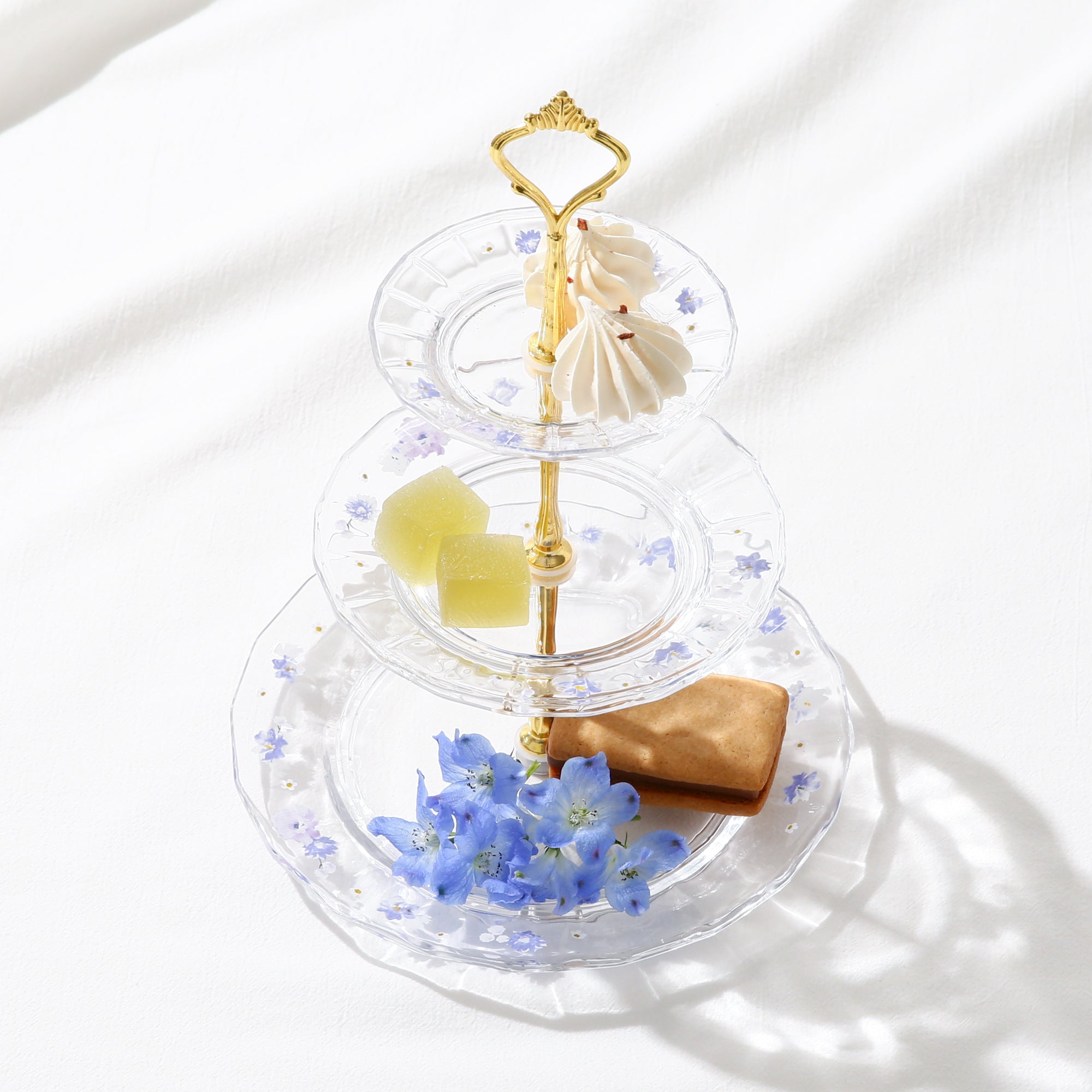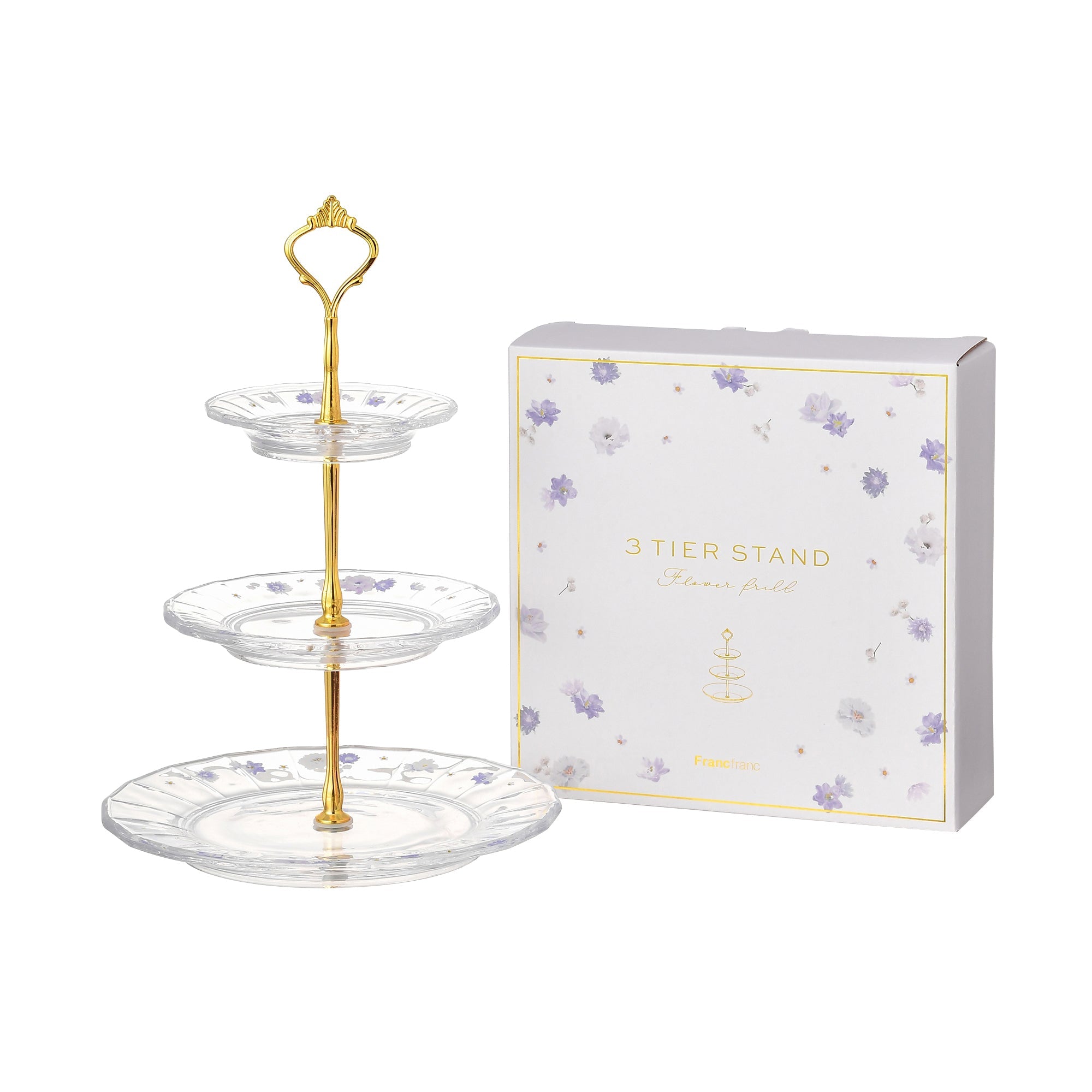 お店でティータイムを楽しんでいる気分になれる、3段ケーキスタンドです。ゴシックなゴールドの支柱にフリル形状の上品なガラスプレートを3段に重ね、花柄のデザインを施しました。ケーキだけでなくパンやフルーツ、軽食を盛り付けてもお洒落。きらきらと光を乱反射してくれるフリルカットのプレートは、朝・昼・夜で全く違う表情を見せてくれます。朝のモーニングコーヒーに、午後のアフタヌーンティー、夕食後のリラックスタイムまで素敵に演出します。同シリーズのカップ&ソーサーやティーポットと一緒に並べて使うのもおすすめです。