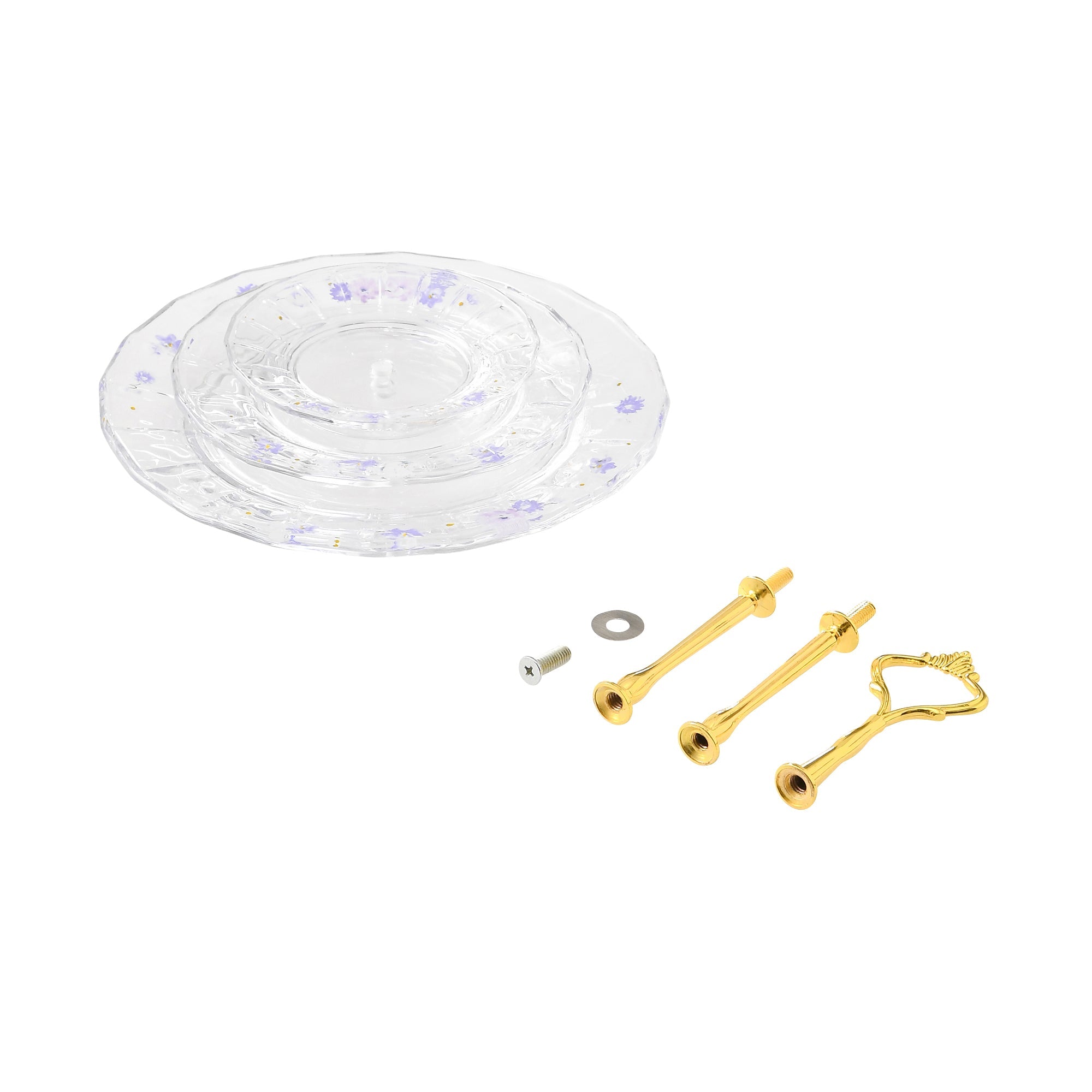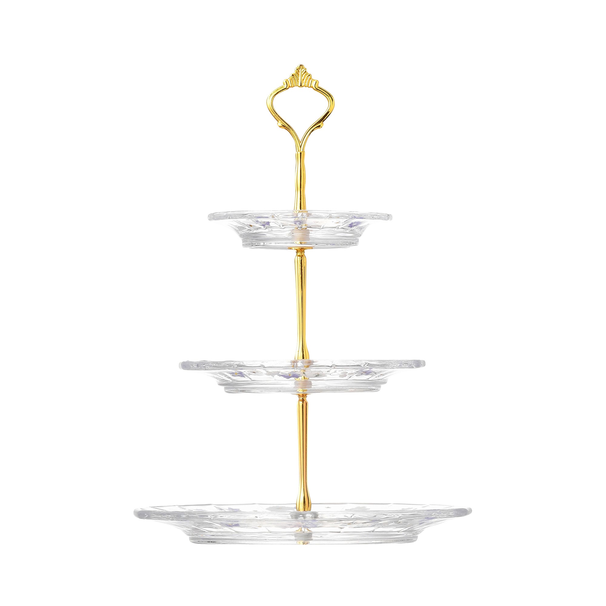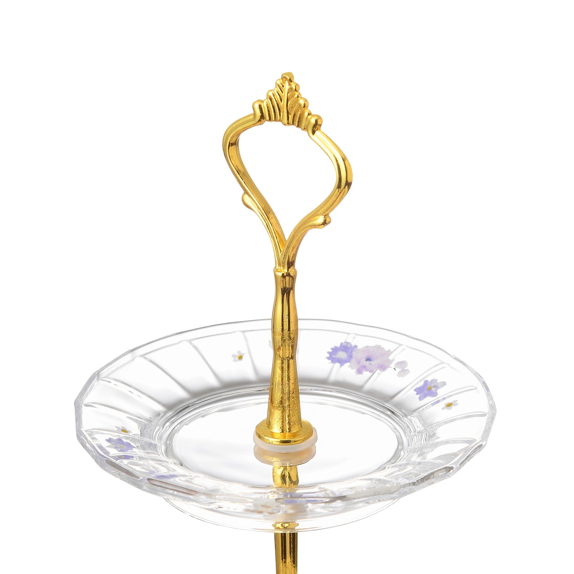お店でティータイムを楽しんでいる気分になれる、3段ケーキスタンドです。ゴシックなゴールドの支柱にフリル形状の上品なガラスプレートを3段に重ね、花柄のデザインを施しました。ケーキだけでなくパンやフルーツ、軽食を盛り付けてもお洒落。きらきらと光を乱反射してくれるフリルカットのプレートは、朝・昼・夜で全く違う表情を見せてくれます。朝のモーニングコーヒーに、午後のアフタヌーンティー、夕食後のリラックスタイムまで素敵に演出します。同シリーズのカップ&ソーサーやティーポットと一緒に並べて使うのもおすすめです。
