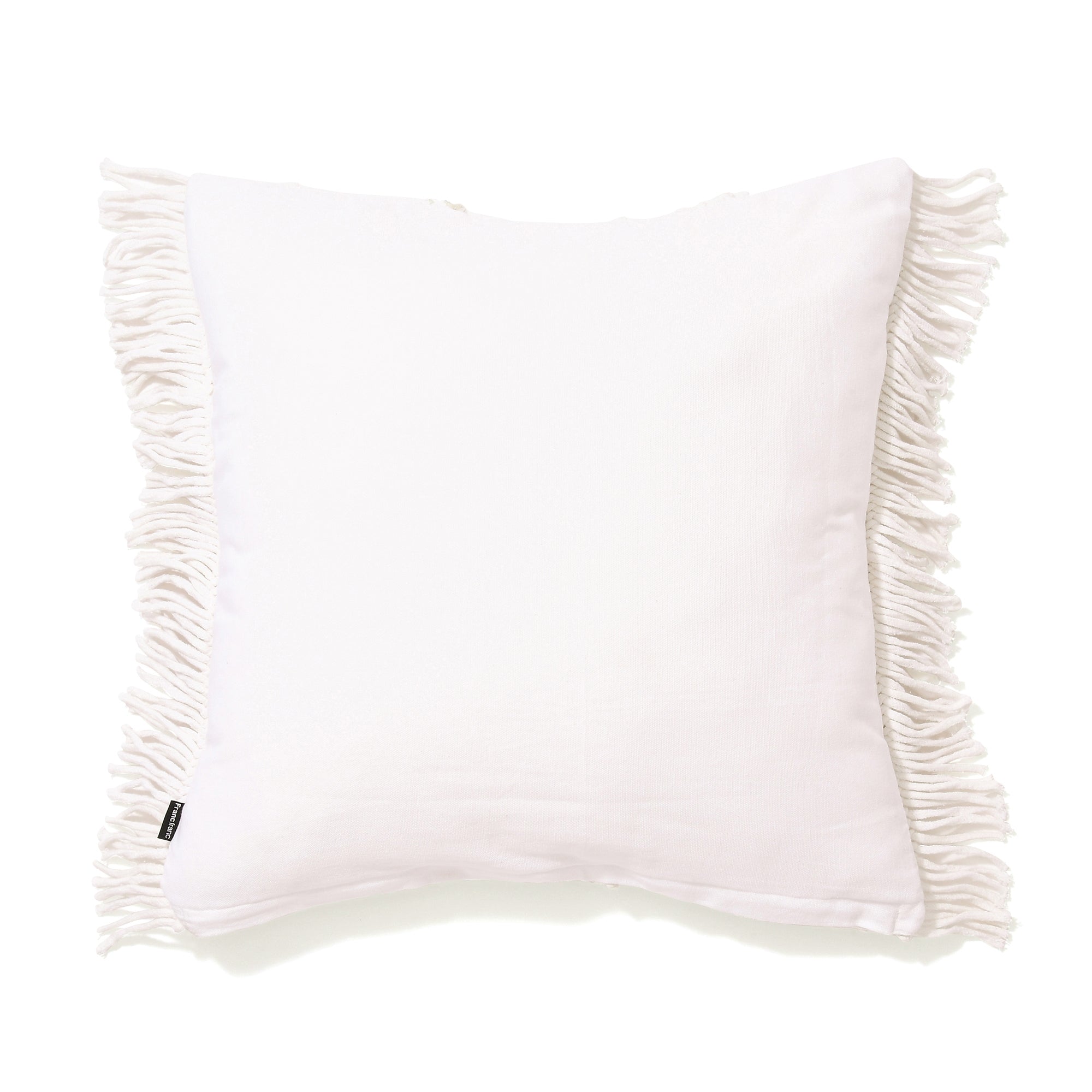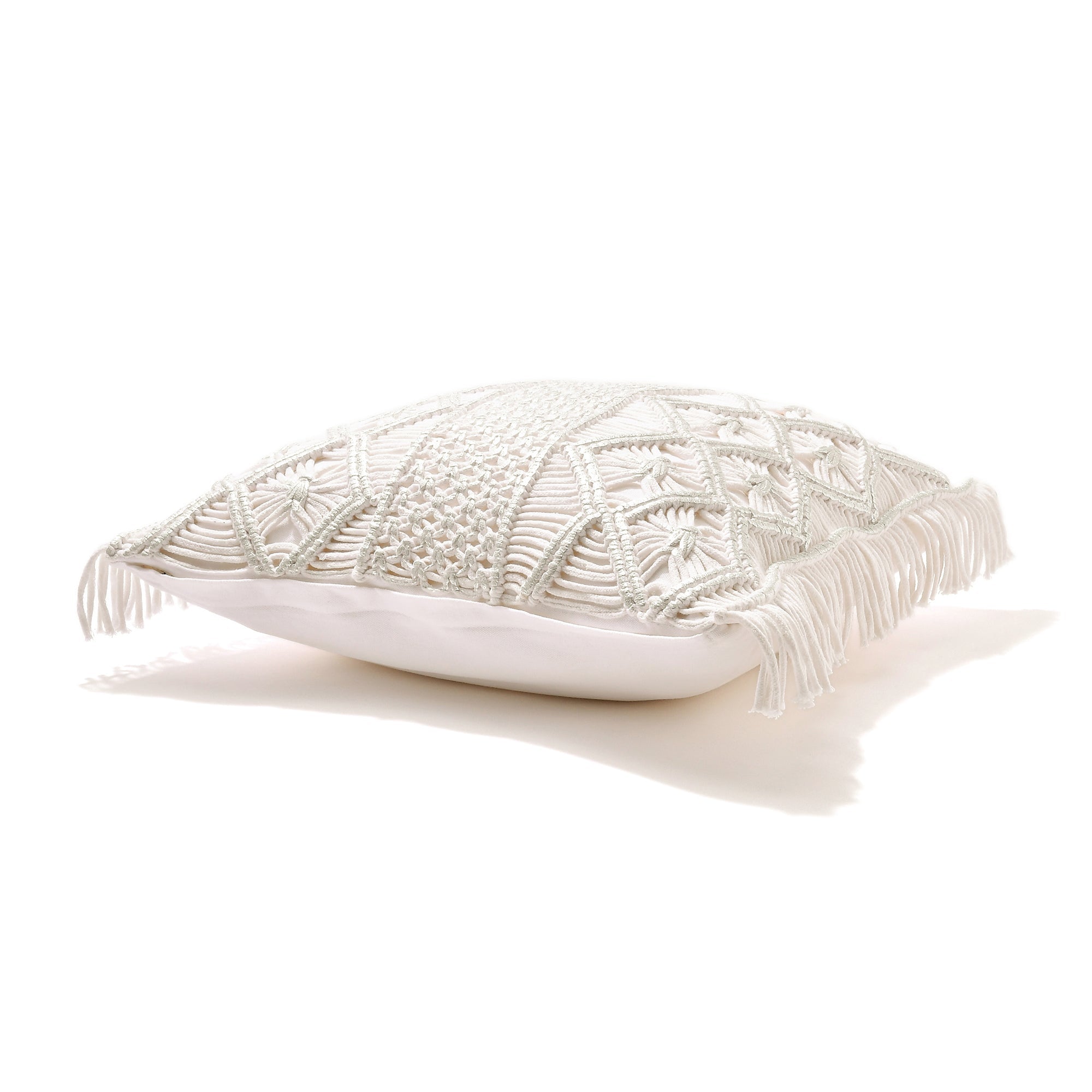 マクラメの編みで柄やサイドのフリンジを表現したクッションカバーです。表面にメタリックプリントを施した華やかなデザインが特徴です。