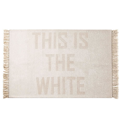 2種類の「糸」素材を利用し「THIS IS THE_WHITE / BLACK」テキストを織りで再現したラグです。