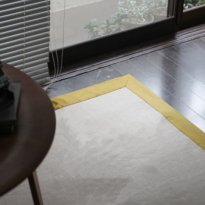 リネン素材のカラーフレームで柔らかい印象にまとめた、リネン独特の肌触りと素材感をふんだんに楽しめるラグ。