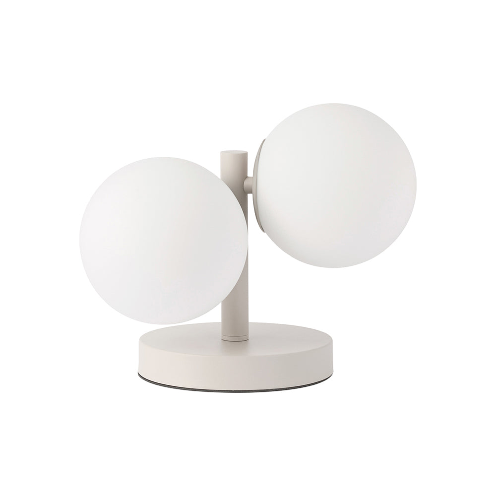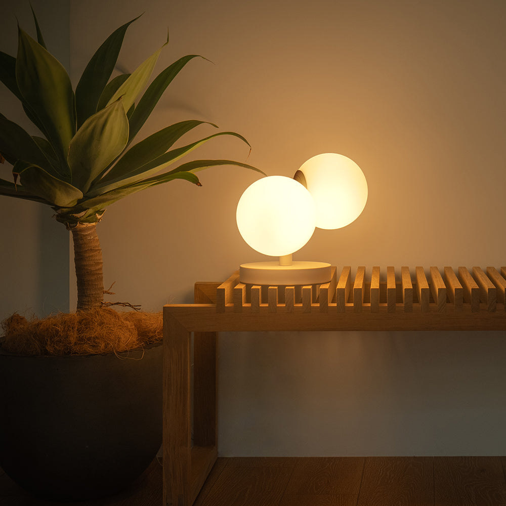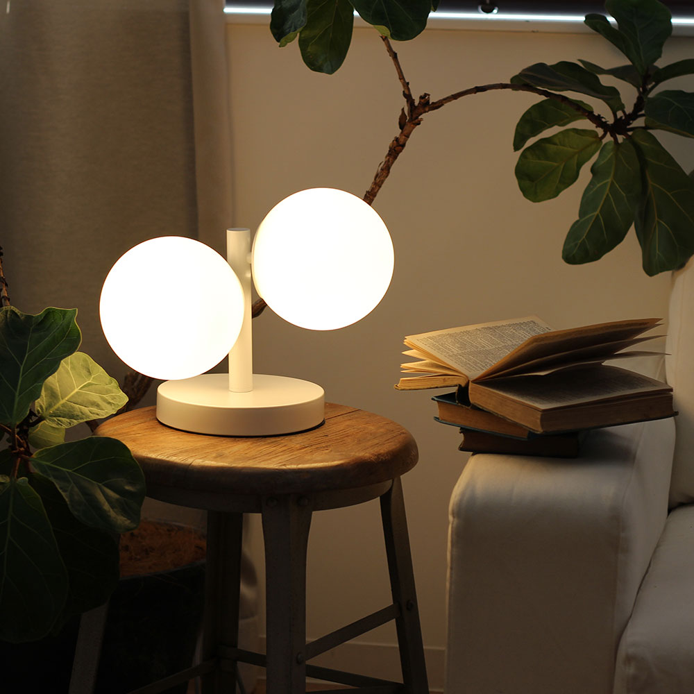セレクトしやすいサイズになるように、2つのガラスボールは高さを変えたアシンメトリーデザイン。ベースに触れて点灯・消灯を切り替えるタッチスイッチも使いやすいように考慮しました。