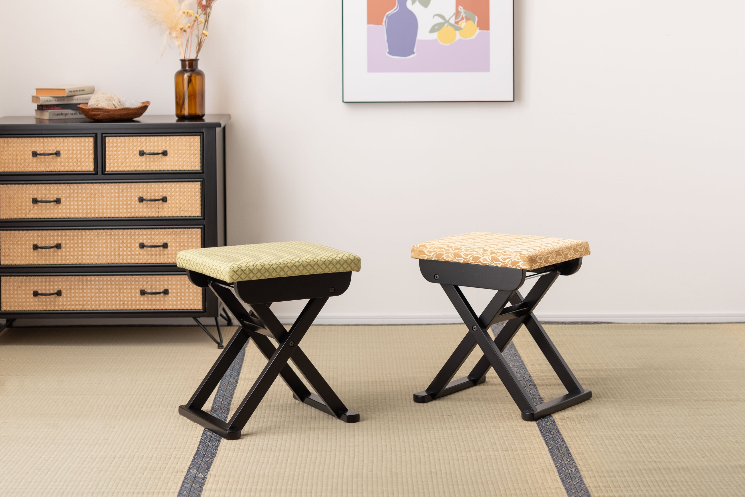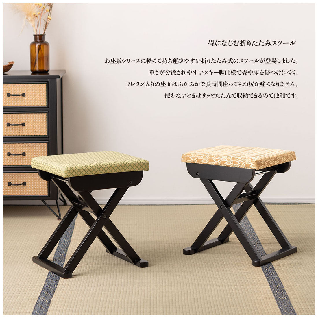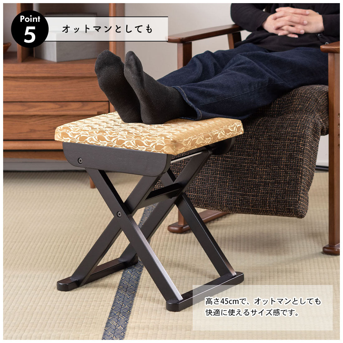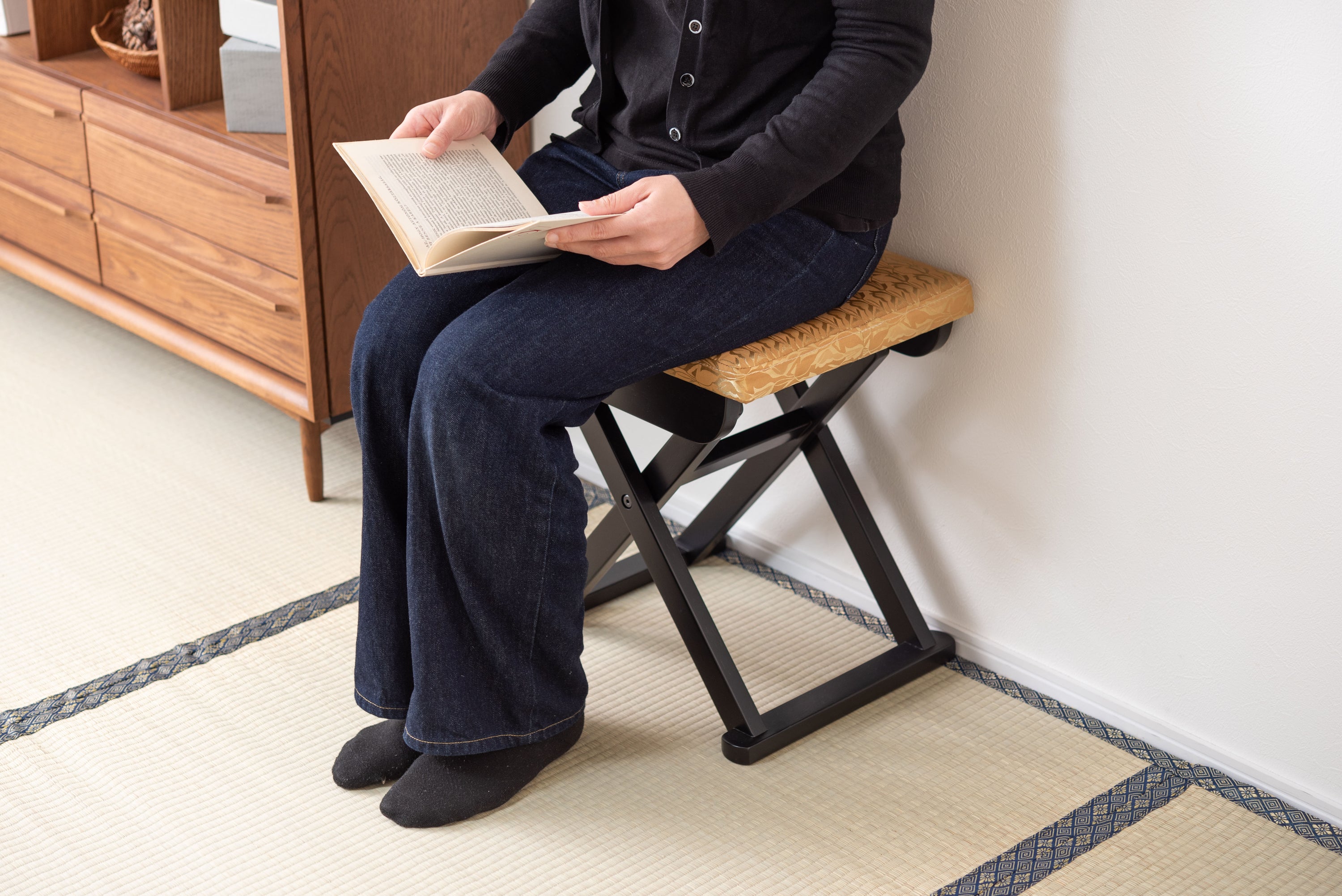 畳にもしっくりなじむ折りたたみスツール。 軽くて持ち運びやすい折りたたみ式。 重さが分散されやすいスキー脚仕様。 畳や床を傷つけにくく、ウレタン入り座面はふかふかで長時間座れる座り心地。 使わない時はサッとたたんで省スペースに収納できるので便利。 脚裏フェルト付き。 座面には撥水加工が施されているので、汚れてもサッと拭き取るだけでお手入れが楽に完了。 高さ45cmでオットマンとしても快適に使えるサイズ感。