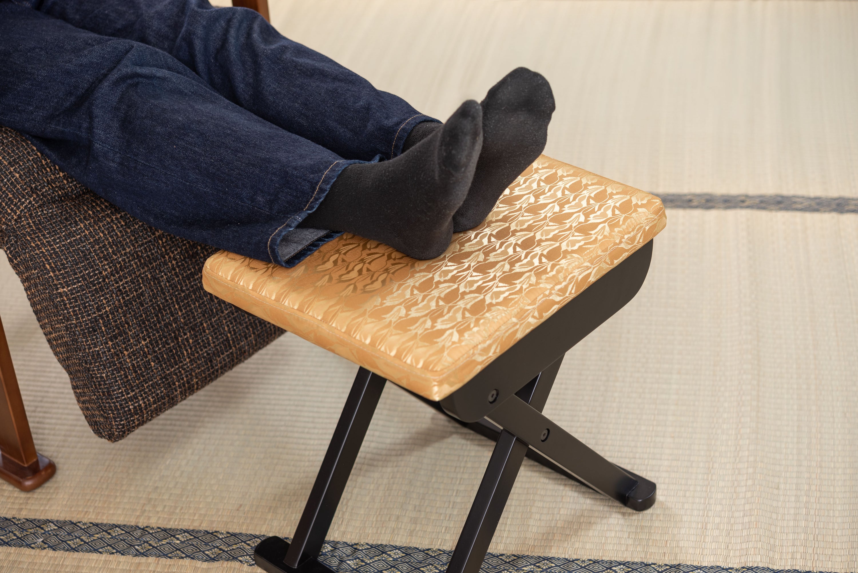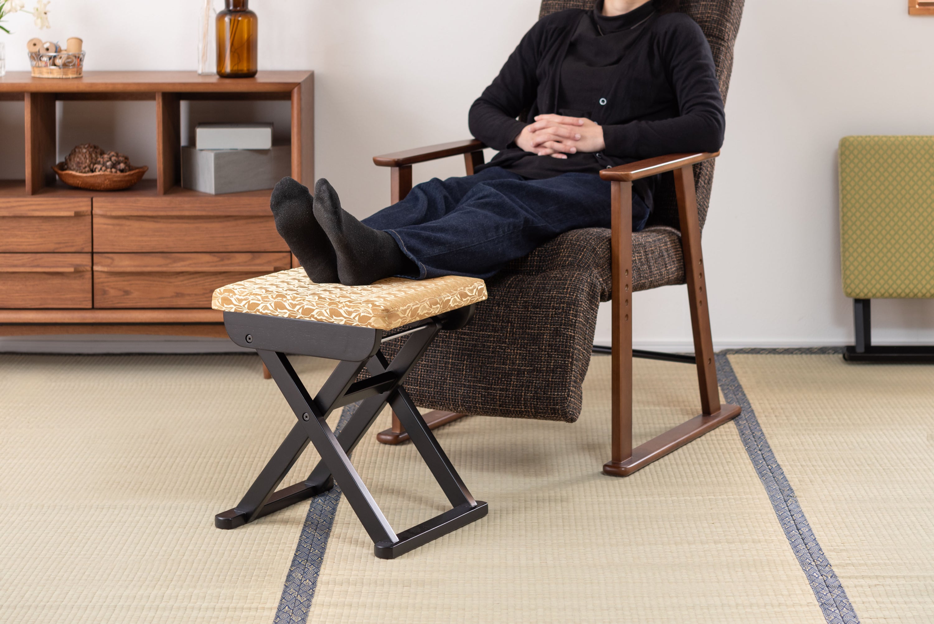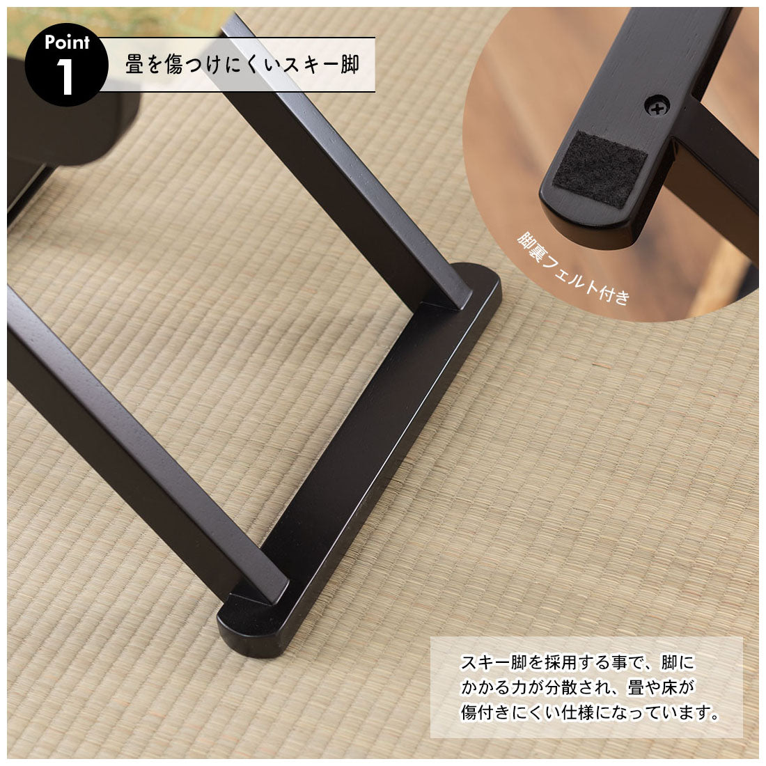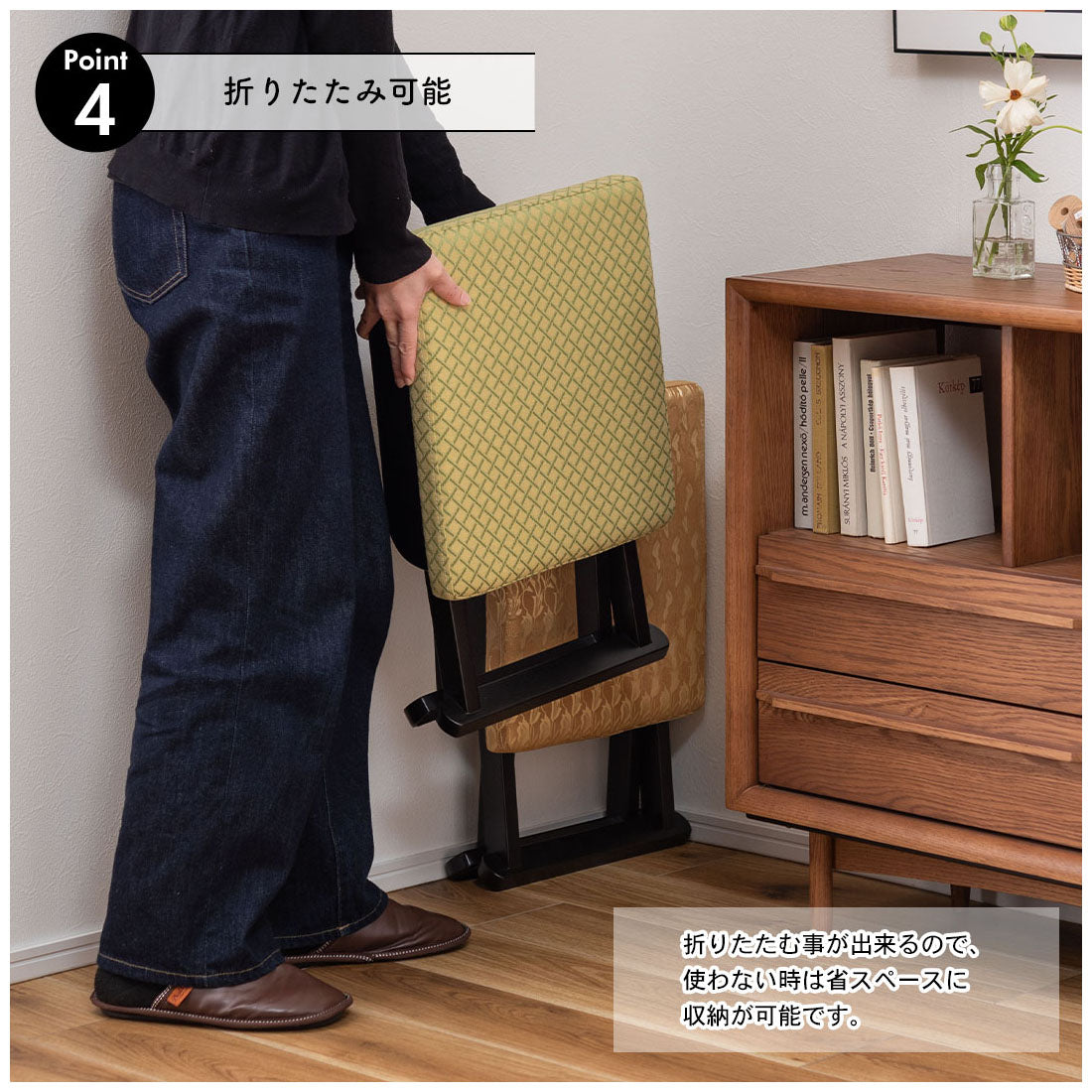 畳にもしっくりなじむ折りたたみスツール。 軽くて持ち運びやすい折りたたみ式。 重さが分散されやすいスキー脚仕様。 畳や床を傷つけにくく、ウレタン入り座面はふかふかで長時間座れる座り心地。 使わない時はサッとたたんで省スペースに収納できるので便利。 脚裏フェルト付き。 座面には撥水加工が施されているので、汚れてもサッと拭き取るだけでお手入れが楽に完了。 高さ45cmでオットマンとしても快適に使えるサイズ感。