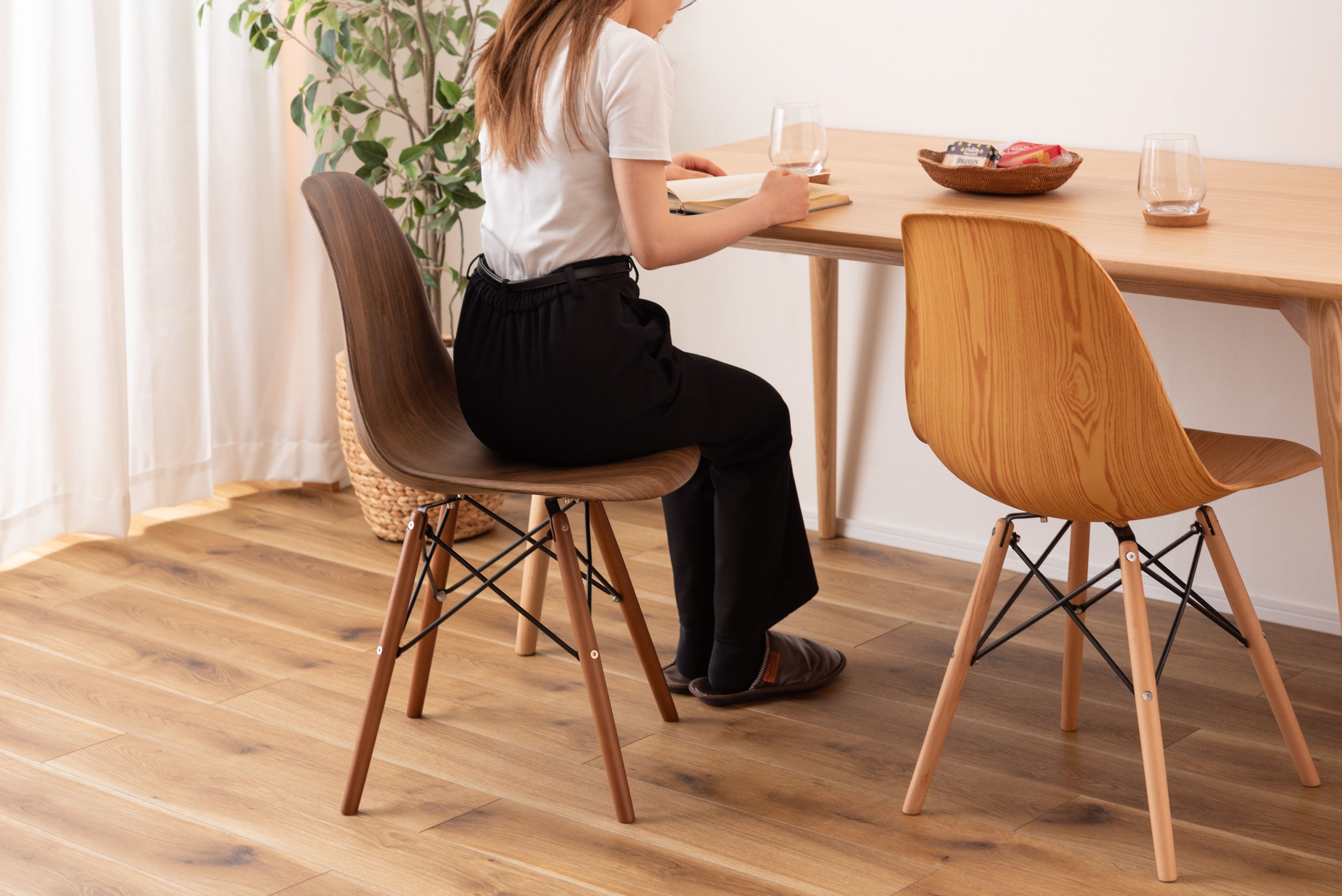 ROOMESSENCEのチェアブラウンです。長時間でも快適な座り心地を備え、ダイニングやワークスペースに活躍します。ブランドの美意識を感じる佇まいで、日常づかいから来客時まで幅広く対応。品番:CL-894WAL。暮らしに上質なアクセントを添える一品です。