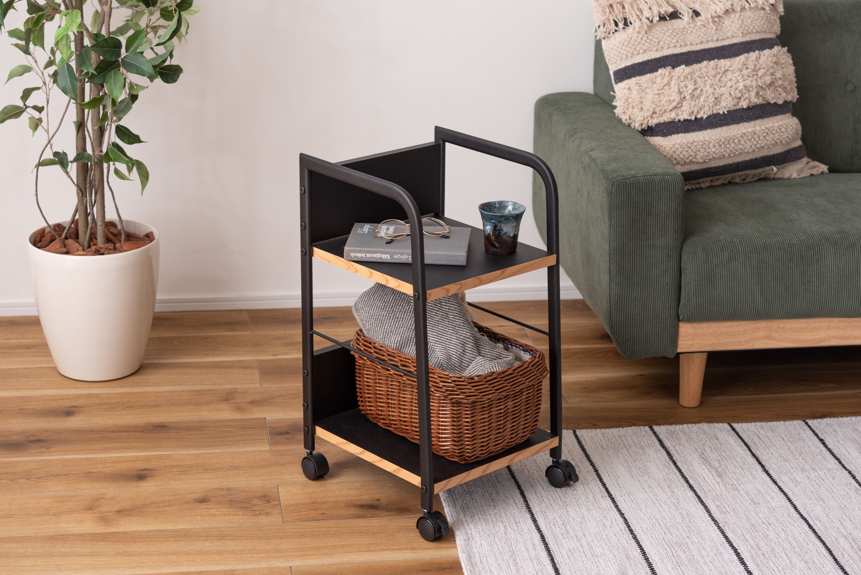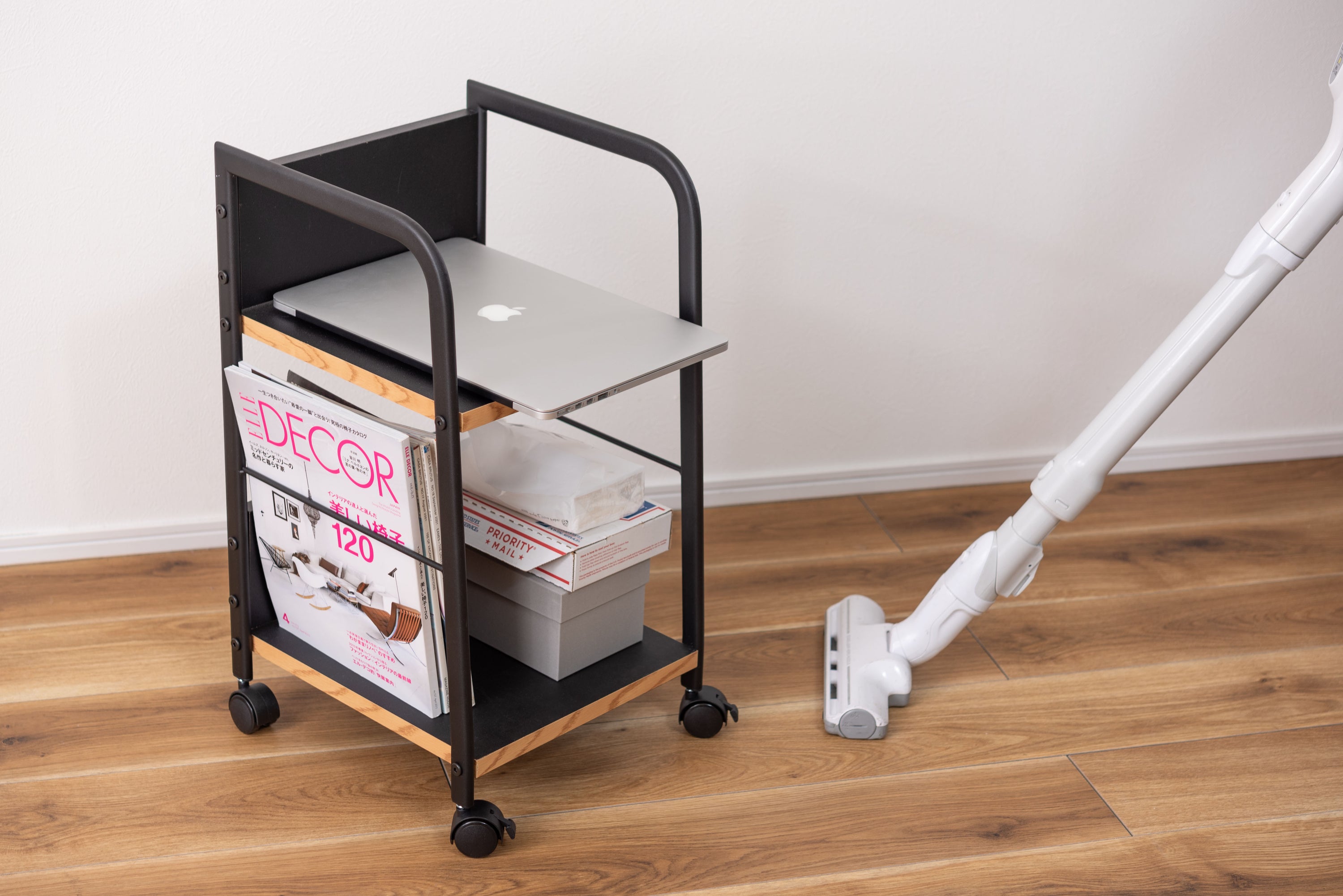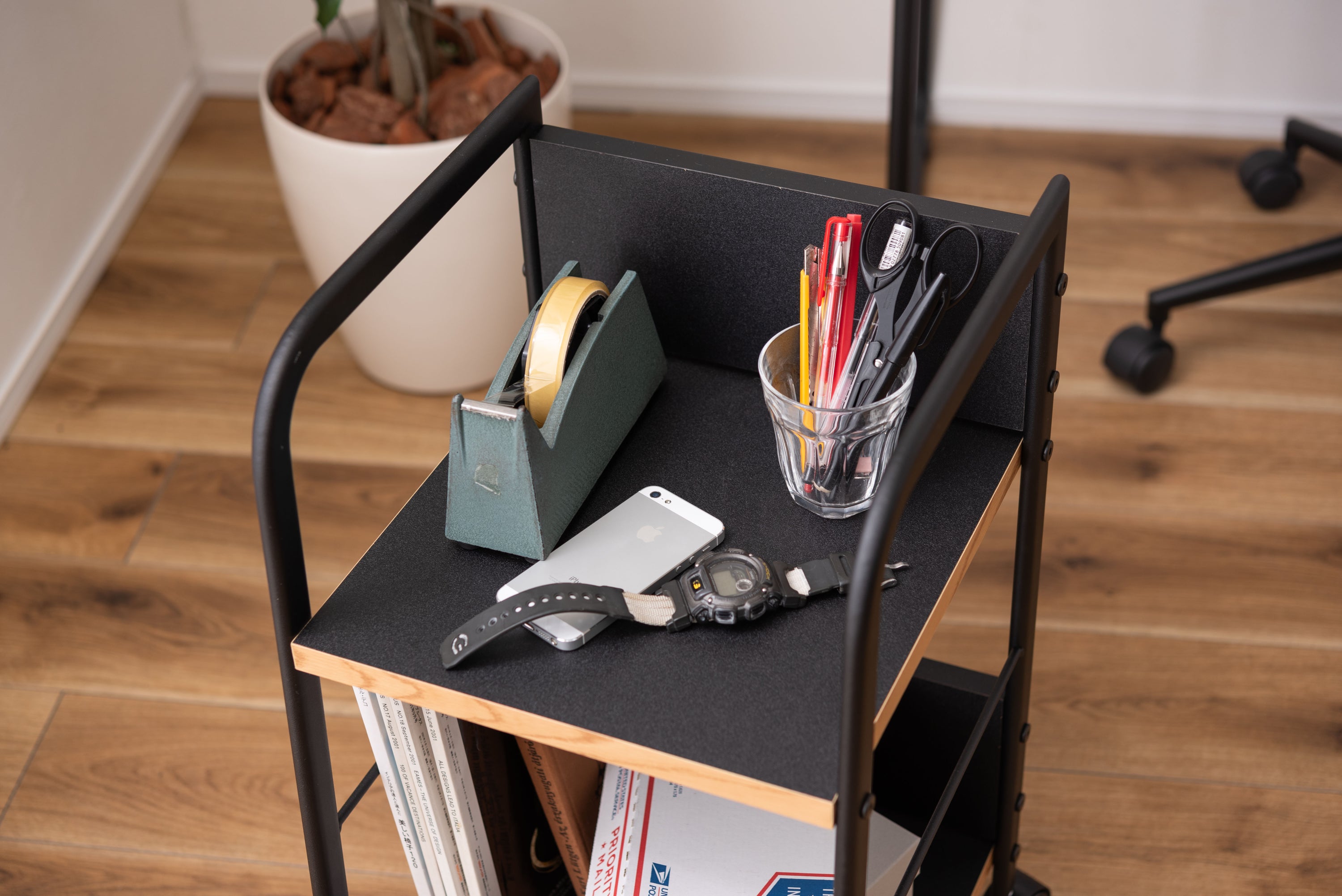 ワークデスクに合わせてデザインされたデスクワゴン。 PVCシートで手入れもしやすく、ちょうどいいサイズ感が魅力。 背板が付いているので物を置いても落ちにくく安心。 仕事道具や勉強用具を一箇所にまとめて収納。 ワークデスクの下に収納できるサイズ感。 オープンタイプなので見やすく必要な時にサッと取り出せる仕様。 ベッド横のサイドテーブルやソファ横のリビングワゴンなど使い方無限大。 キャスター付きで移動も簡単。 ストッパー付きなので場所を固定したい時にも便利。