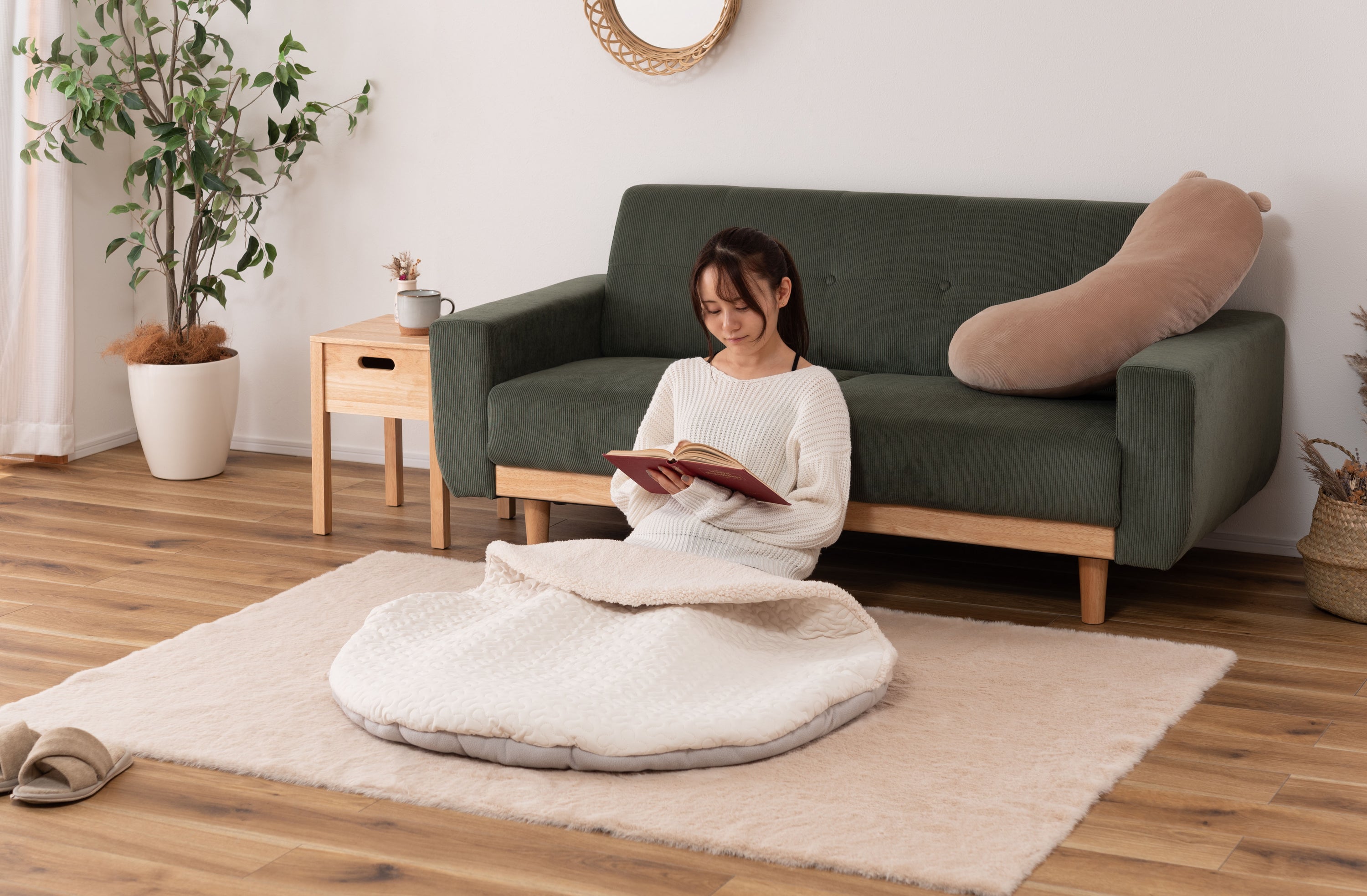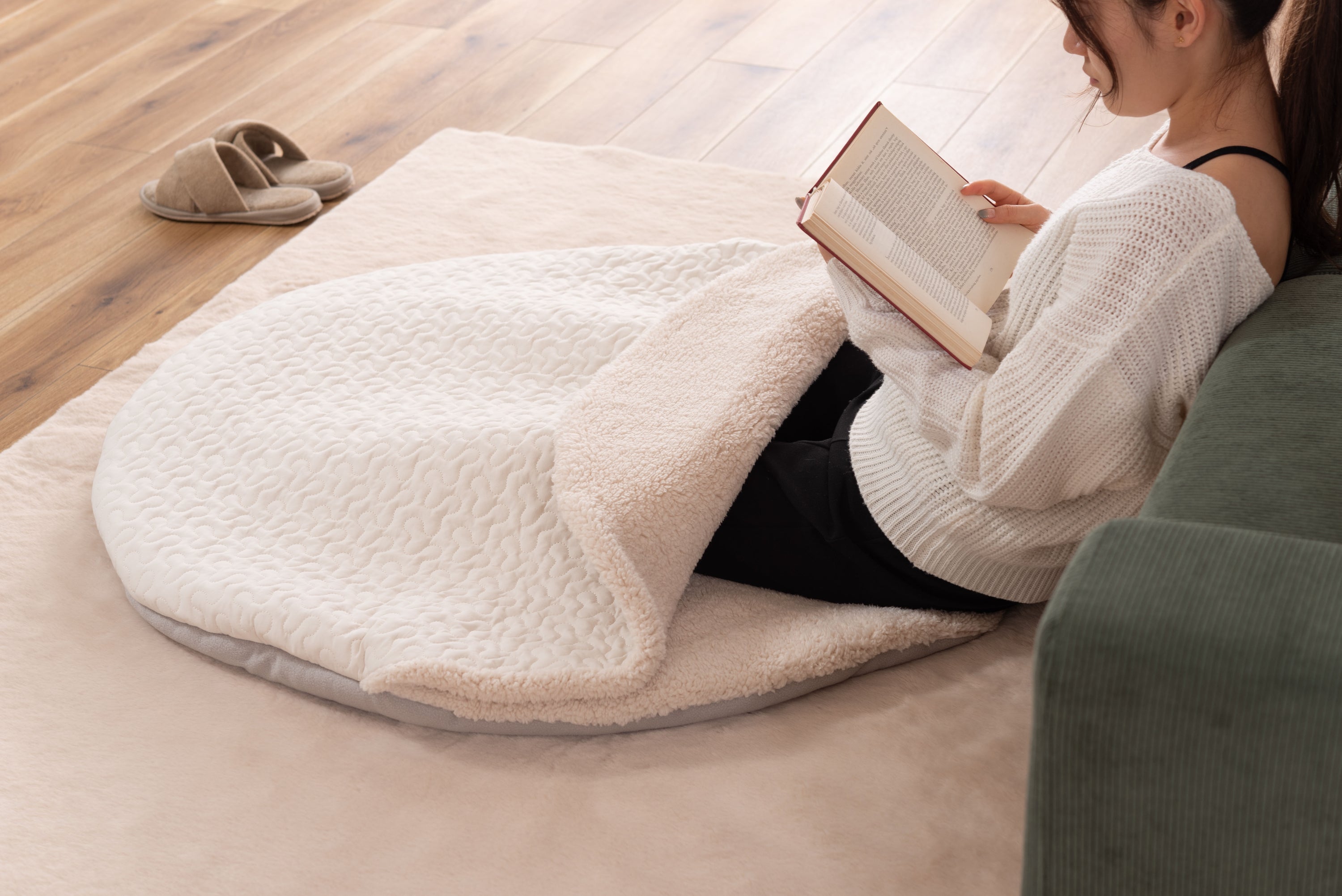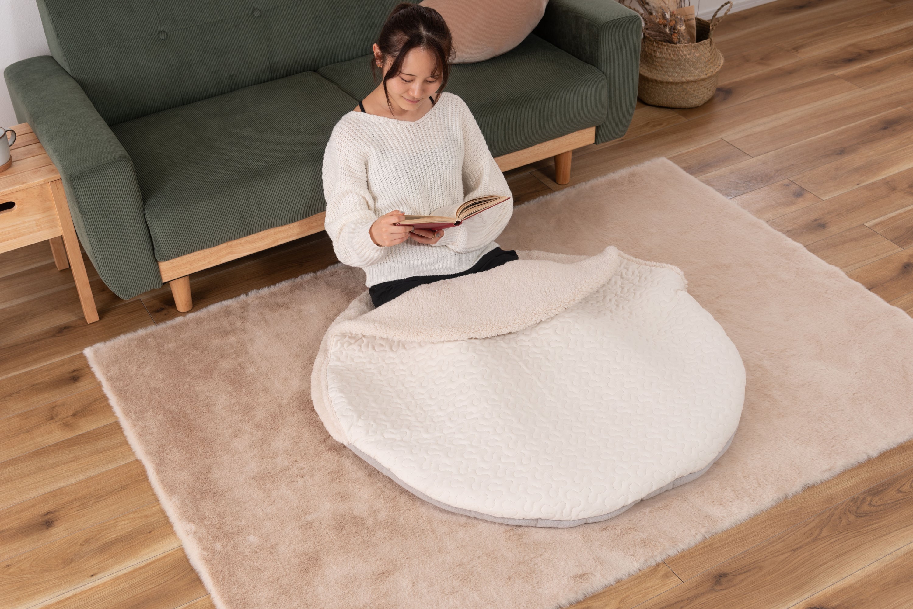 クッションとブランケットが一体化したような形のサンドクッション。内側はボアになっているので、中はあたたかく快適。表側は人気のキルトパターンを採用。切れ込み部分から中に入れば、内側のボア生地が身体をあたたかく包み込んでくれるサンドクッション。脚を曲げて入れば、身体がすっぽり収まるサイズ感。お昼寝タイムのお布団代わりにも。下側は程よいクッション性があるので、床に敷いてフロアクッションとしても快適。しっかりとボリュームがあり、クッション性も抜群。床付き感がなく快適な使い心地。イブルで人気のキルトパターンを採用。トレンド感のあるデザイン。内側は触り心地が良くあたたかいボア生地を使用。布地にプリントを施したこだわりのパッケージで、プレゼントにも最適。