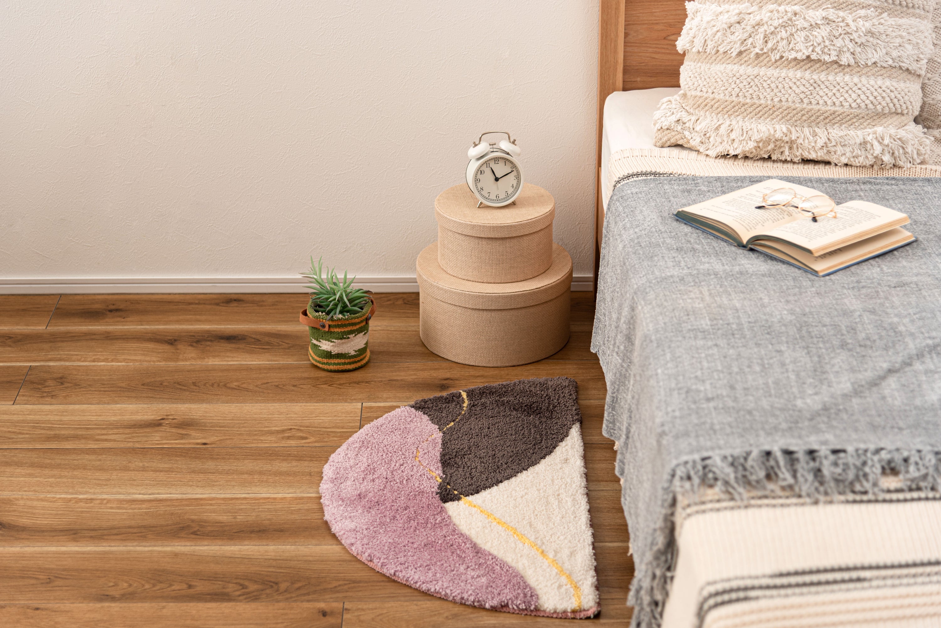 立体感がユニークなニュアンスマット。様々なカタチと個性的デザインのユニークなマットです。使うシーンや用途に合わせてレイアウトを楽しめる。「ちょうどいいサイズ」も魅力です。ふんわりとしたやさしい凹凸は触り心地がよくやさしいデザインとよく合います。インテリアになじみやすい彩度を抑えたカラーリングです。柔らかい凹凸感。背面すべり止め付