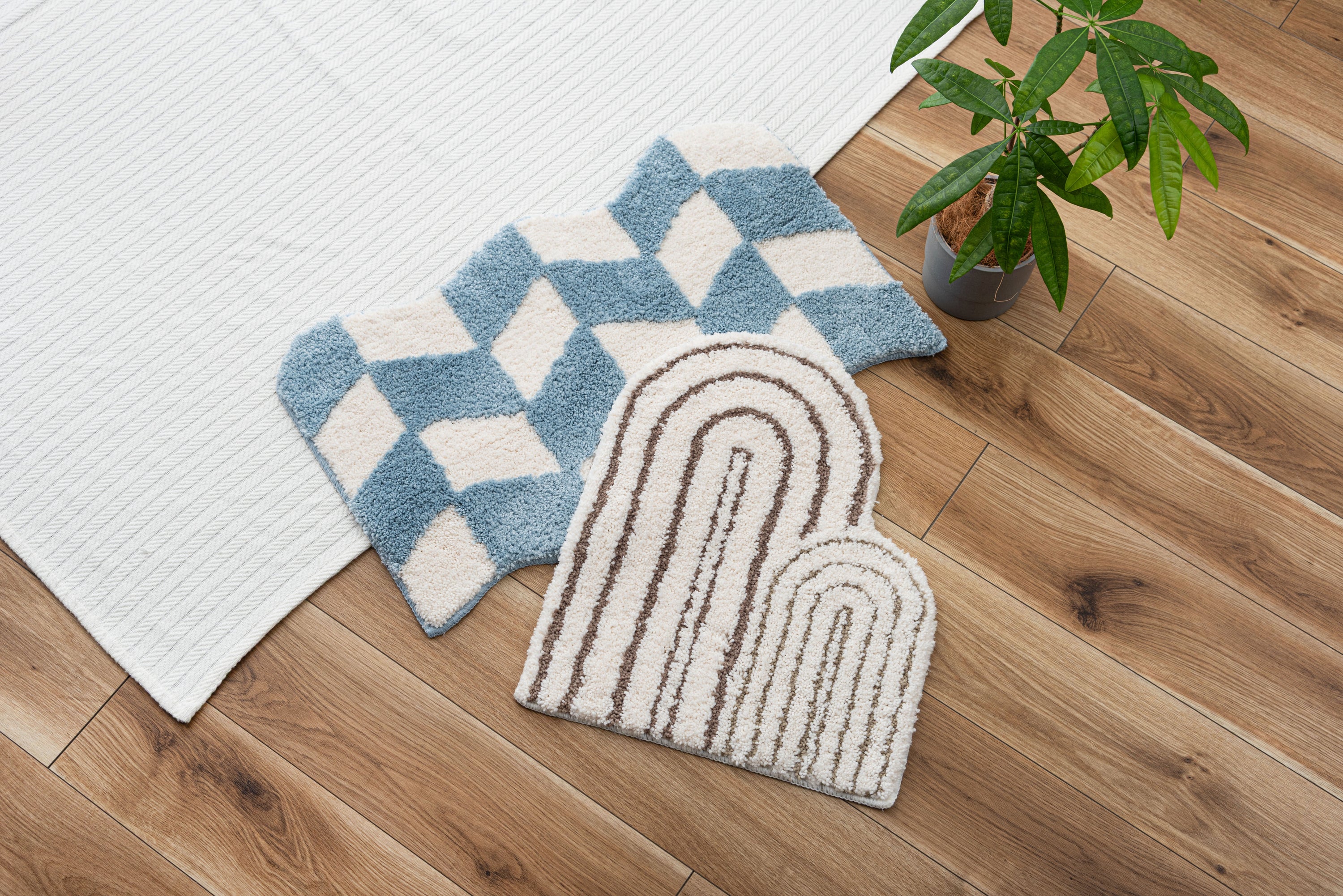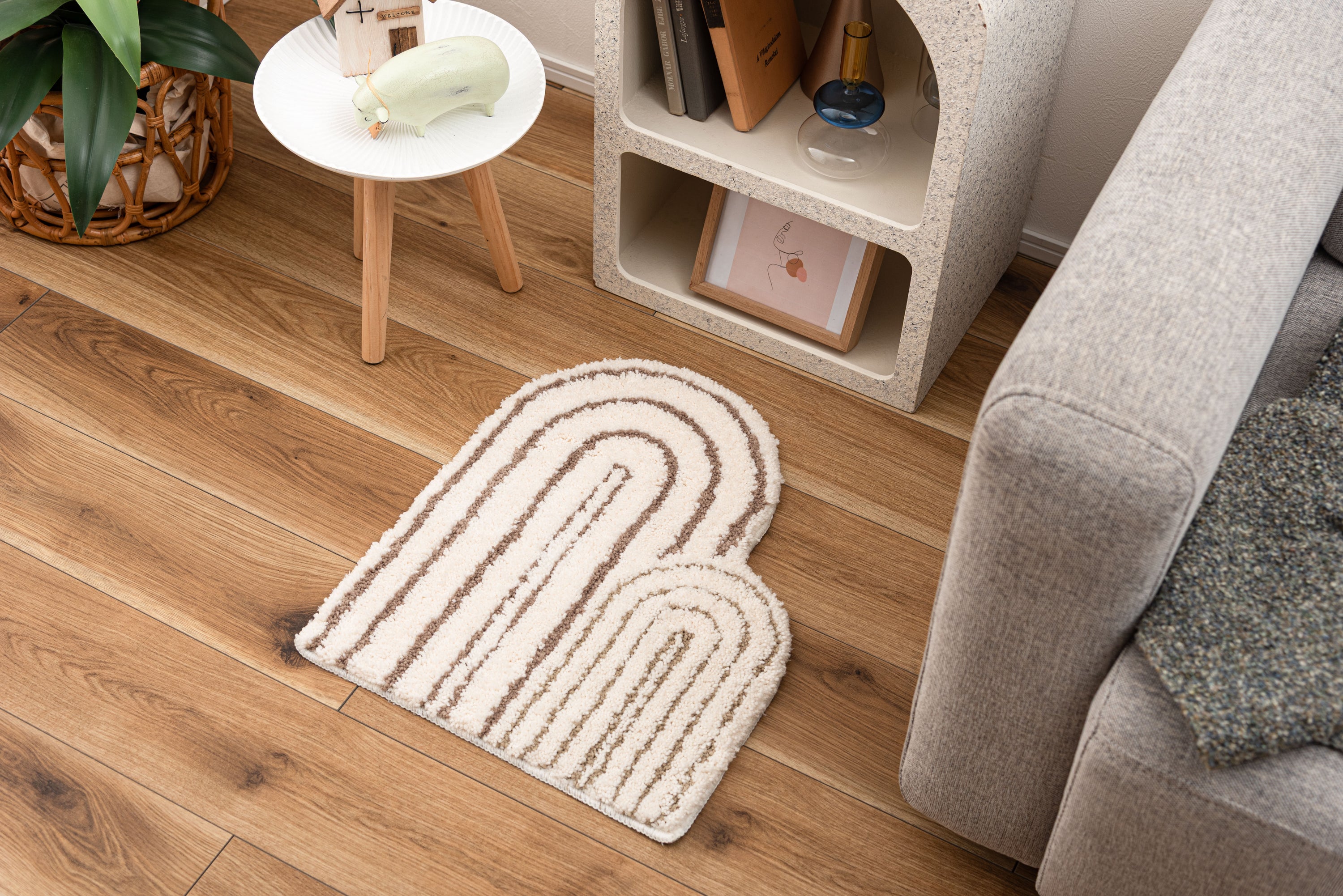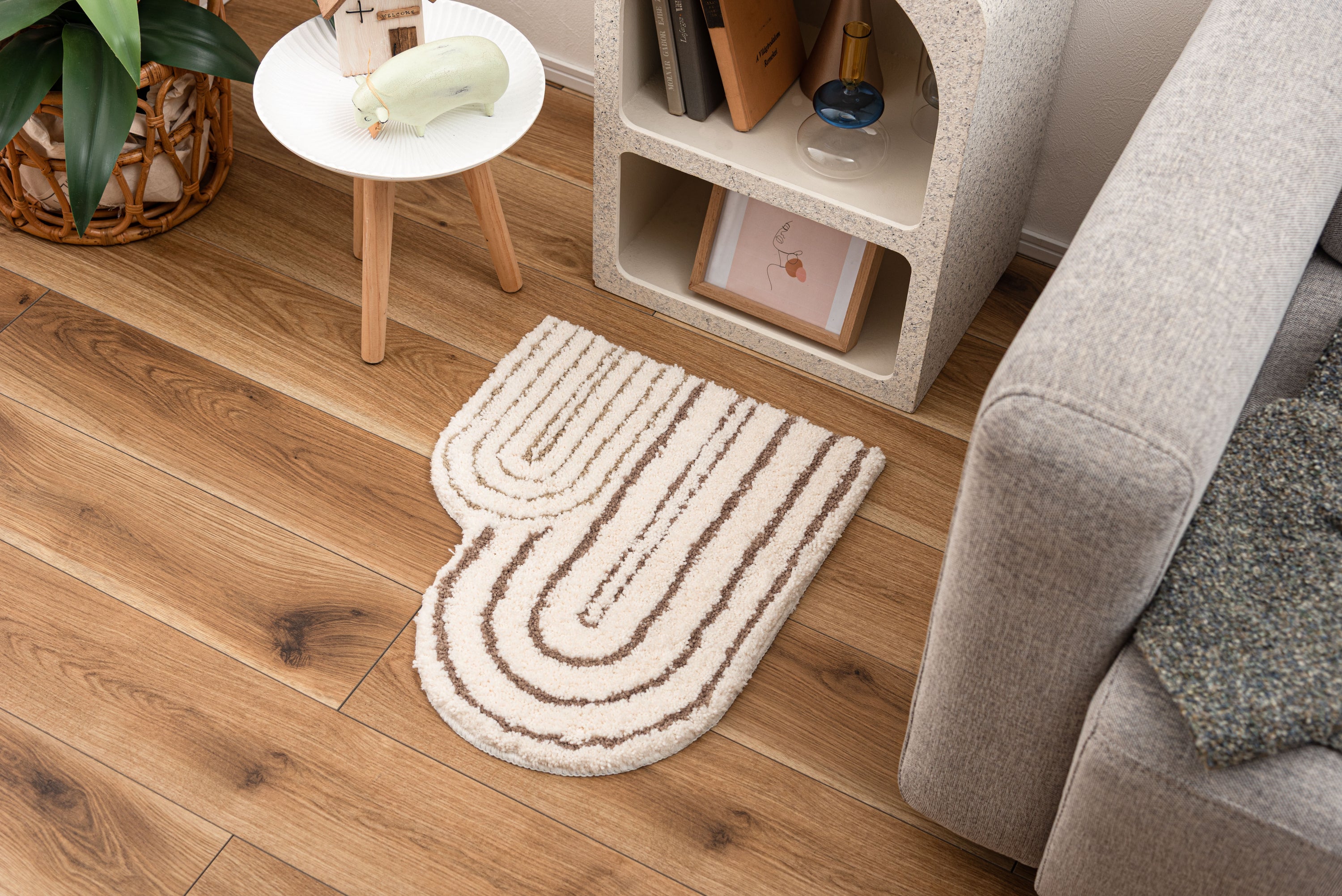 立体感がユニークなニュアンスマット。様々なカタチと個性的デザインのユニークなマットです。使うシーンや用途に合わせてレイアウトを楽しめる。「ちょうどいいサイズ」も魅力です。ふんわりとしたやさしい凹凸は触り心地がよくやさしいデザインとよく合います。インテリアになじみやすい彩度を抑えたカラーリングです。柔らかい凹凸感。背面すべり止め付