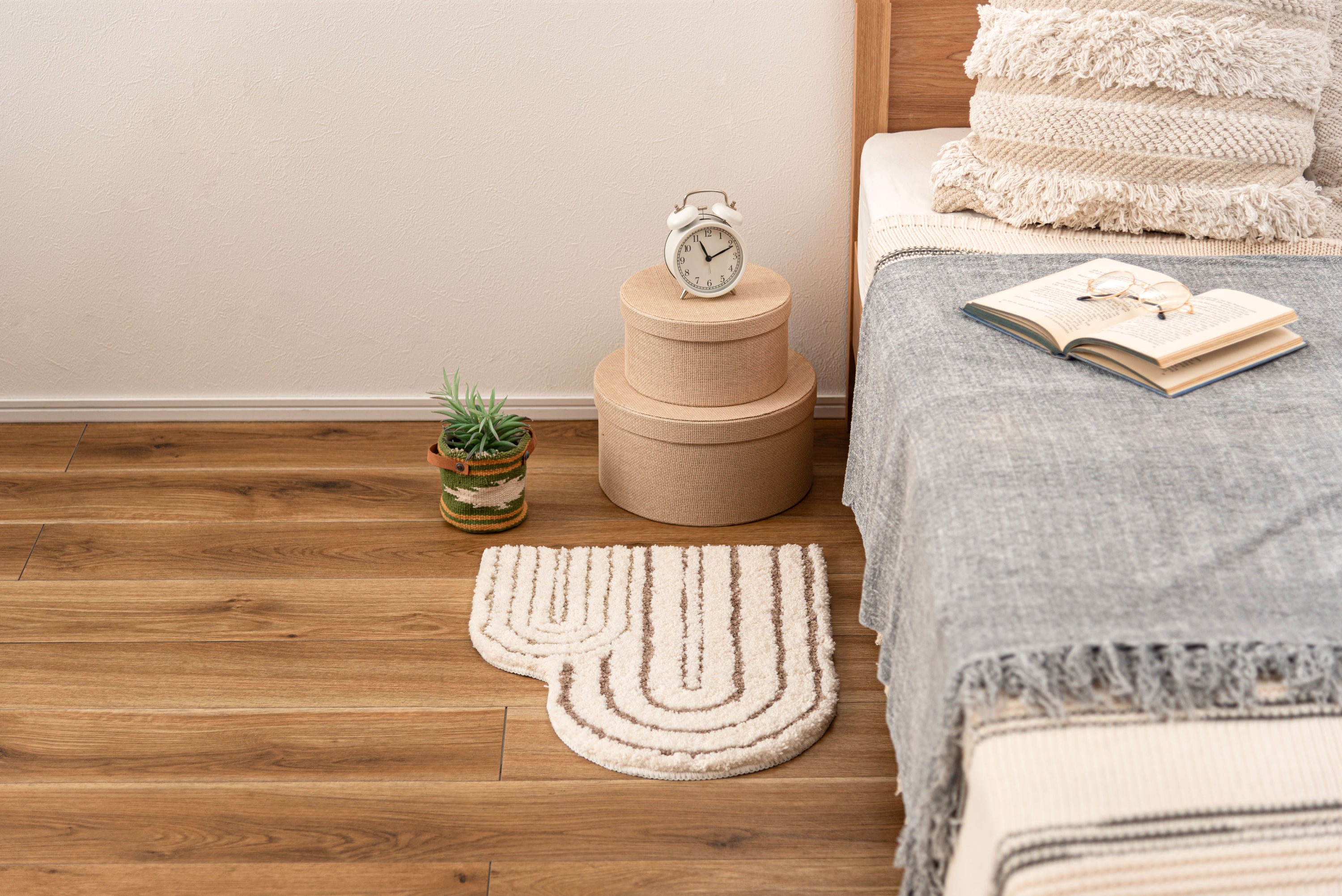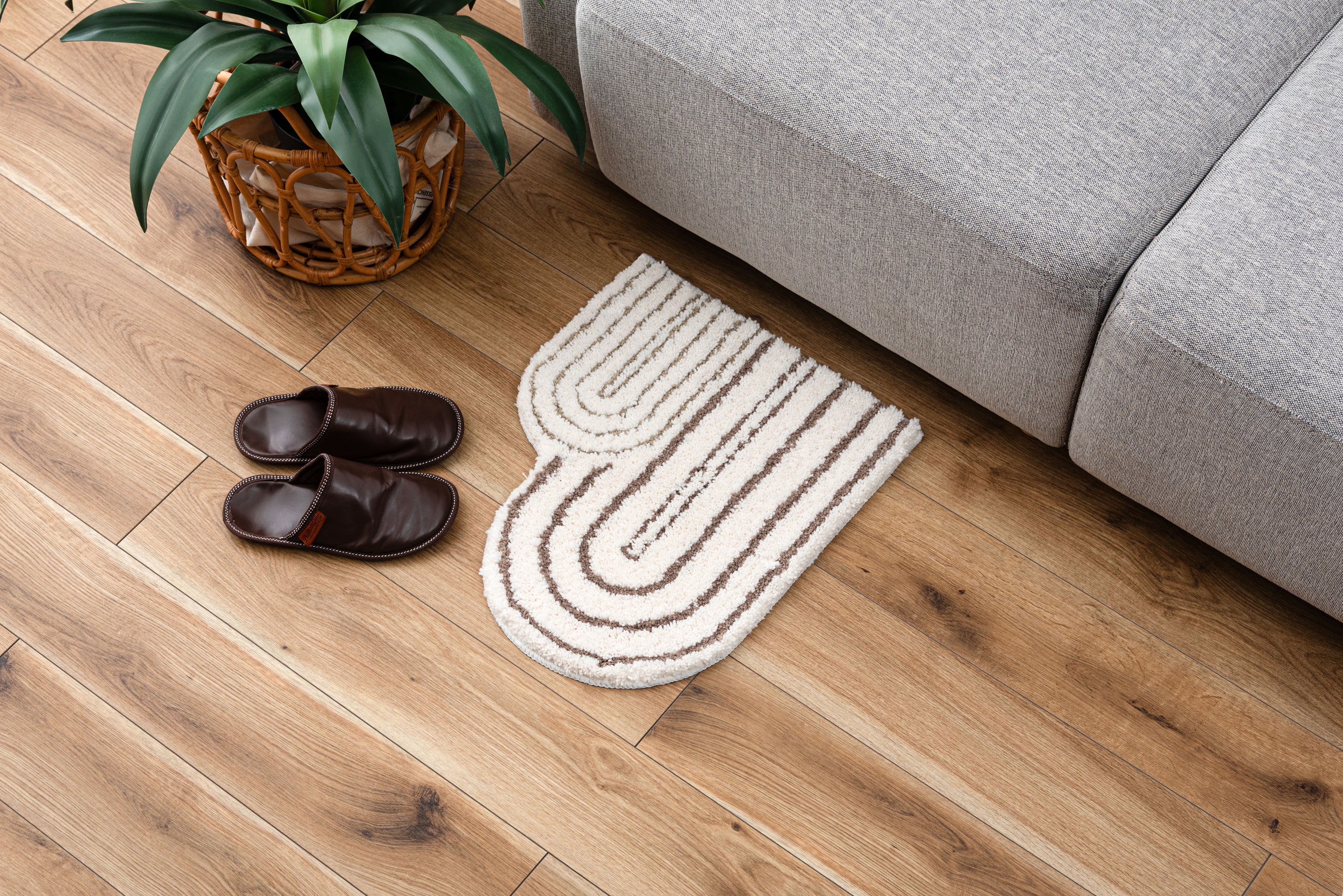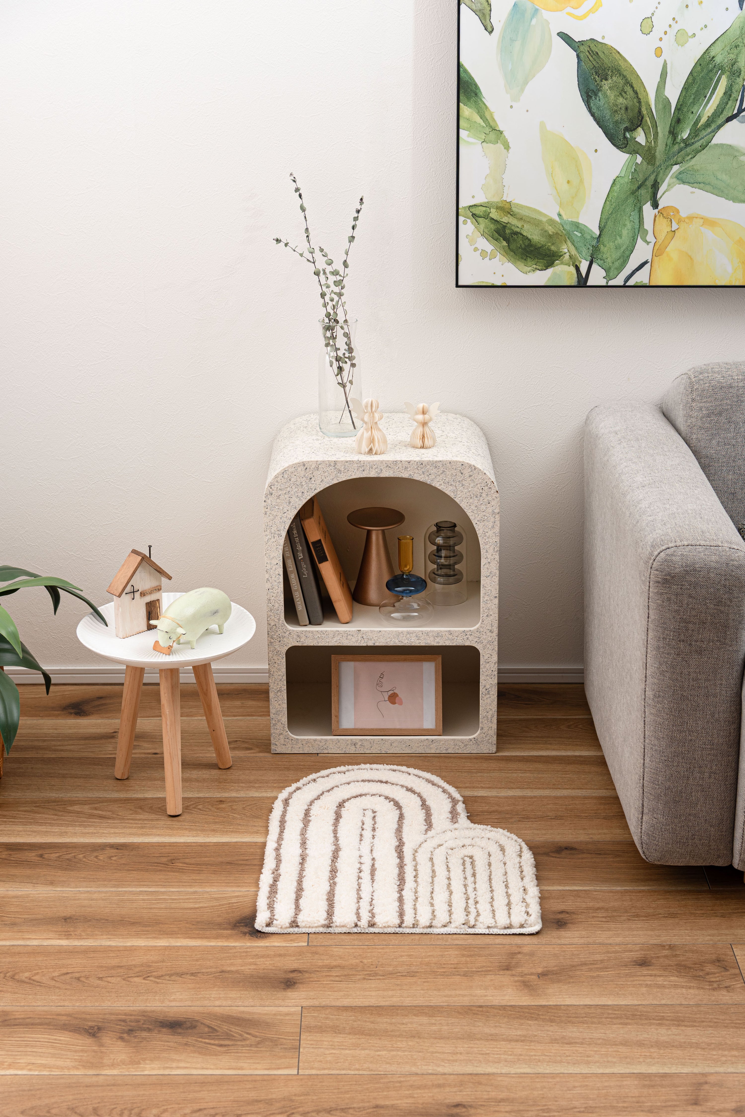 立体感がユニークなニュアンスマット。様々なカタチと個性的デザインのユニークなマットです。使うシーンや用途に合わせてレイアウトを楽しめる。「ちょうどいいサイズ」も魅力です。ふんわりとしたやさしい凹凸は触り心地がよくやさしいデザインとよく合います。インテリアになじみやすい彩度を抑えたカラーリングです。柔らかい凹凸感。背面すべり止め付