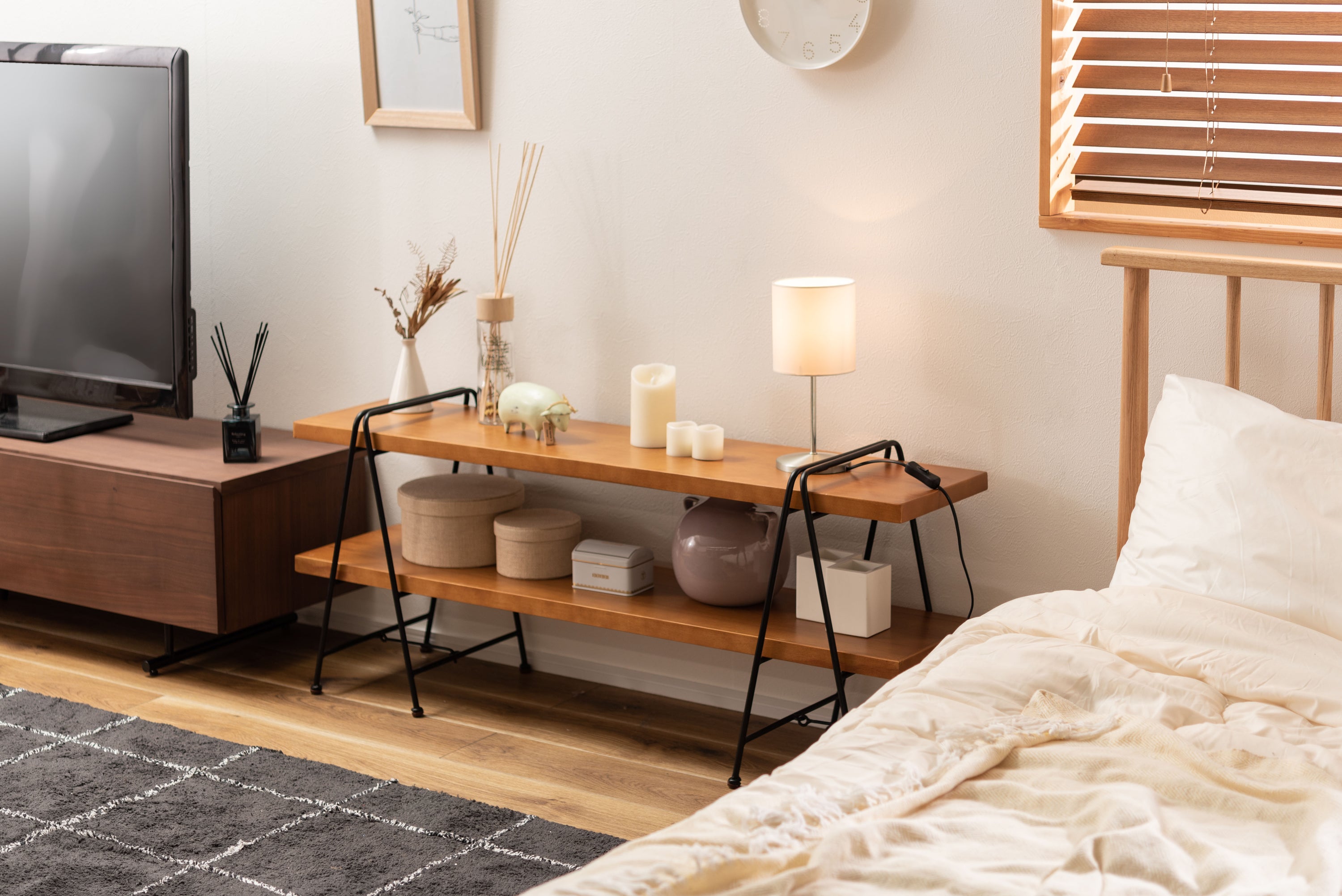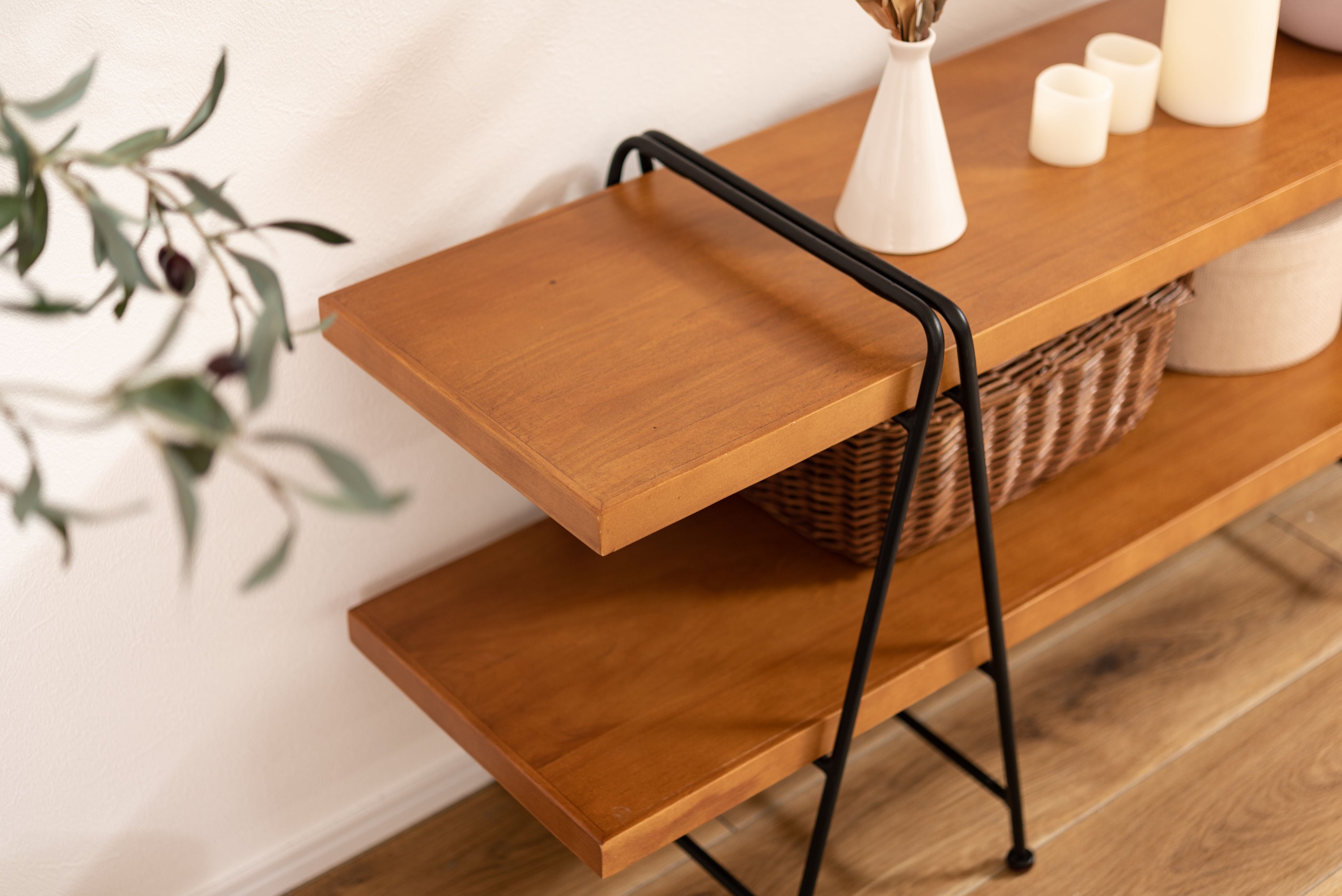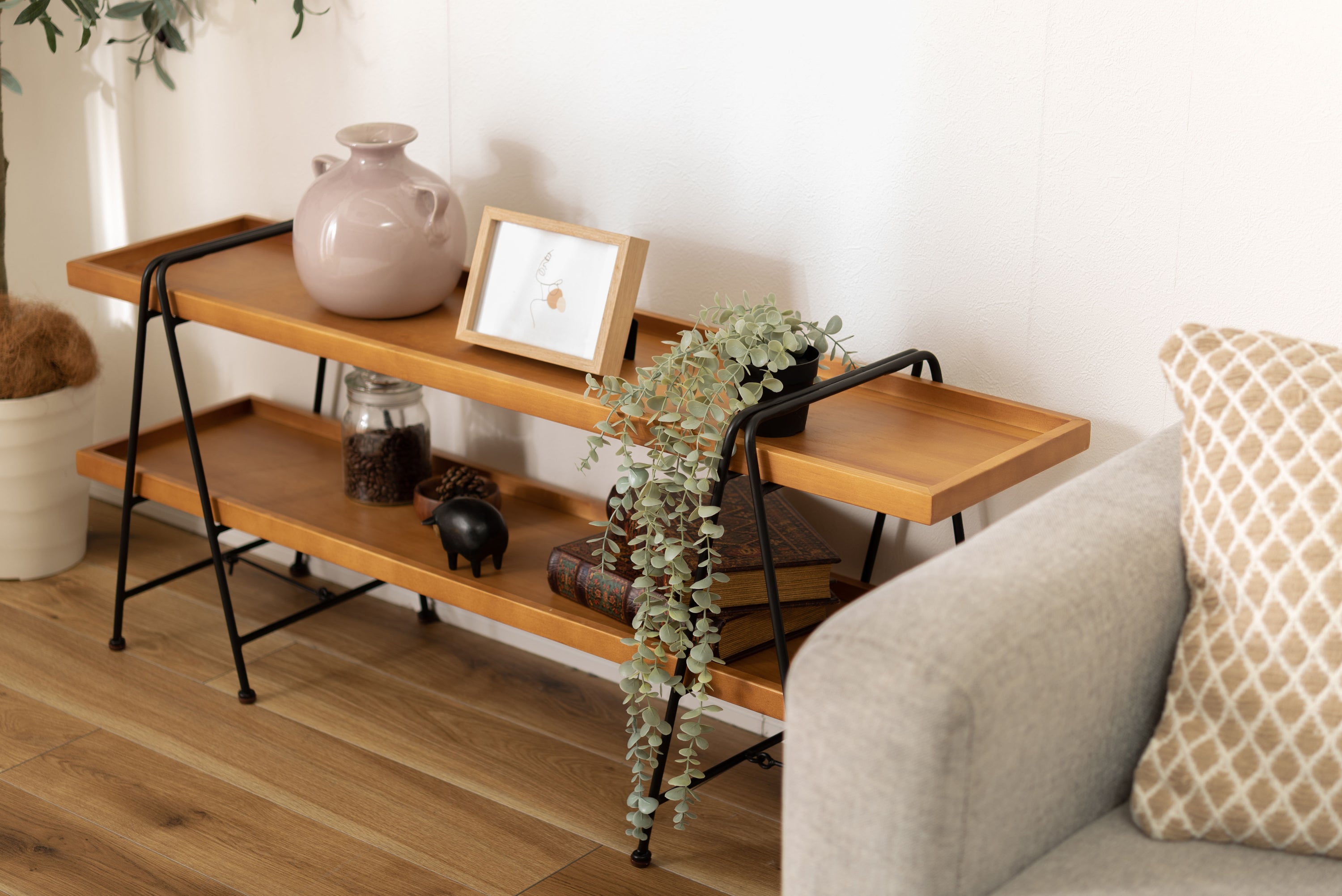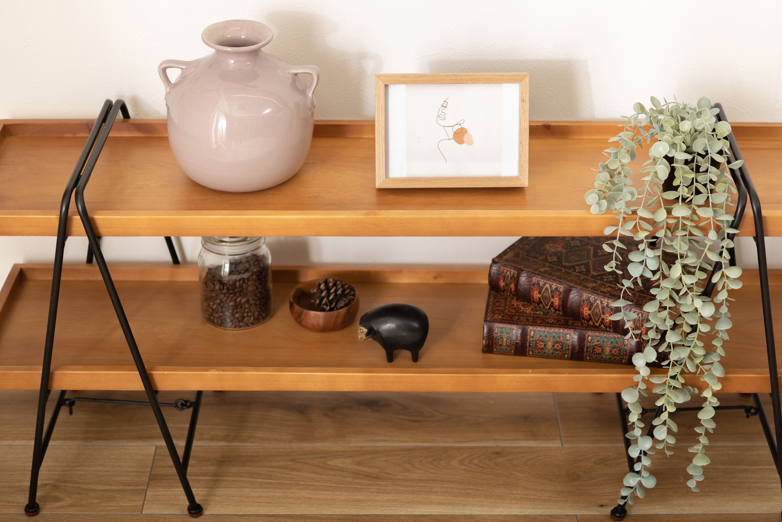 折りたたみ(フォールディング)できるシェルフ。天然木とスチールの組み合わせでデザイン性抜群。簡単に設置ができるのでイベント会場やフリーマーケットなどアイデア次第で自宅以外でも活躍します。コンパクトに折りたたむことができるので、使わない時や移動の時は狭い隙間に収納可能。天然木(パイン)を使用した風合いのあるシェルフ。棚板のサイド部分も同じ天然木で縁取りをしたこだわり仕上げ。フレームの脚先にはアジャスターが付いているのでガタツキ調整も可能。脚の下段部分にはロックバーが付いているので、脚が勝手に閉じてしまう事もなく安心です。