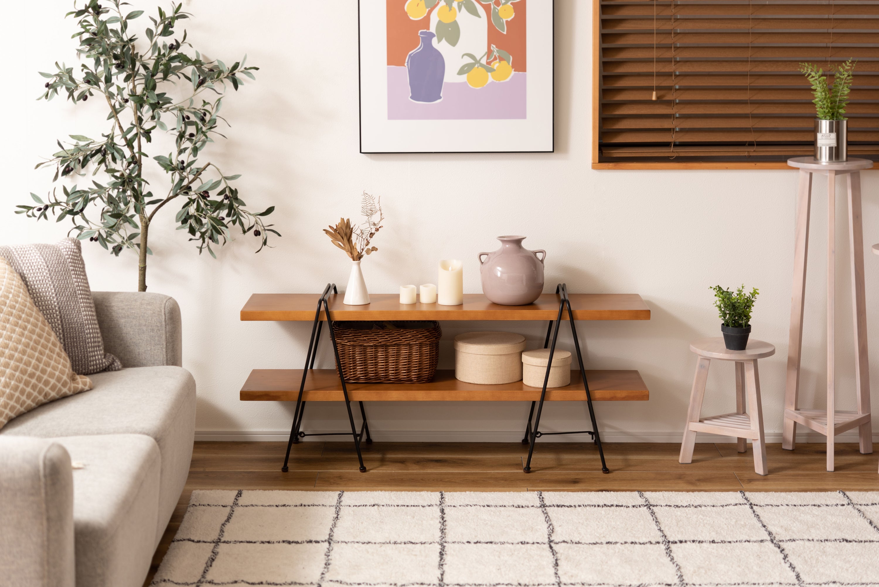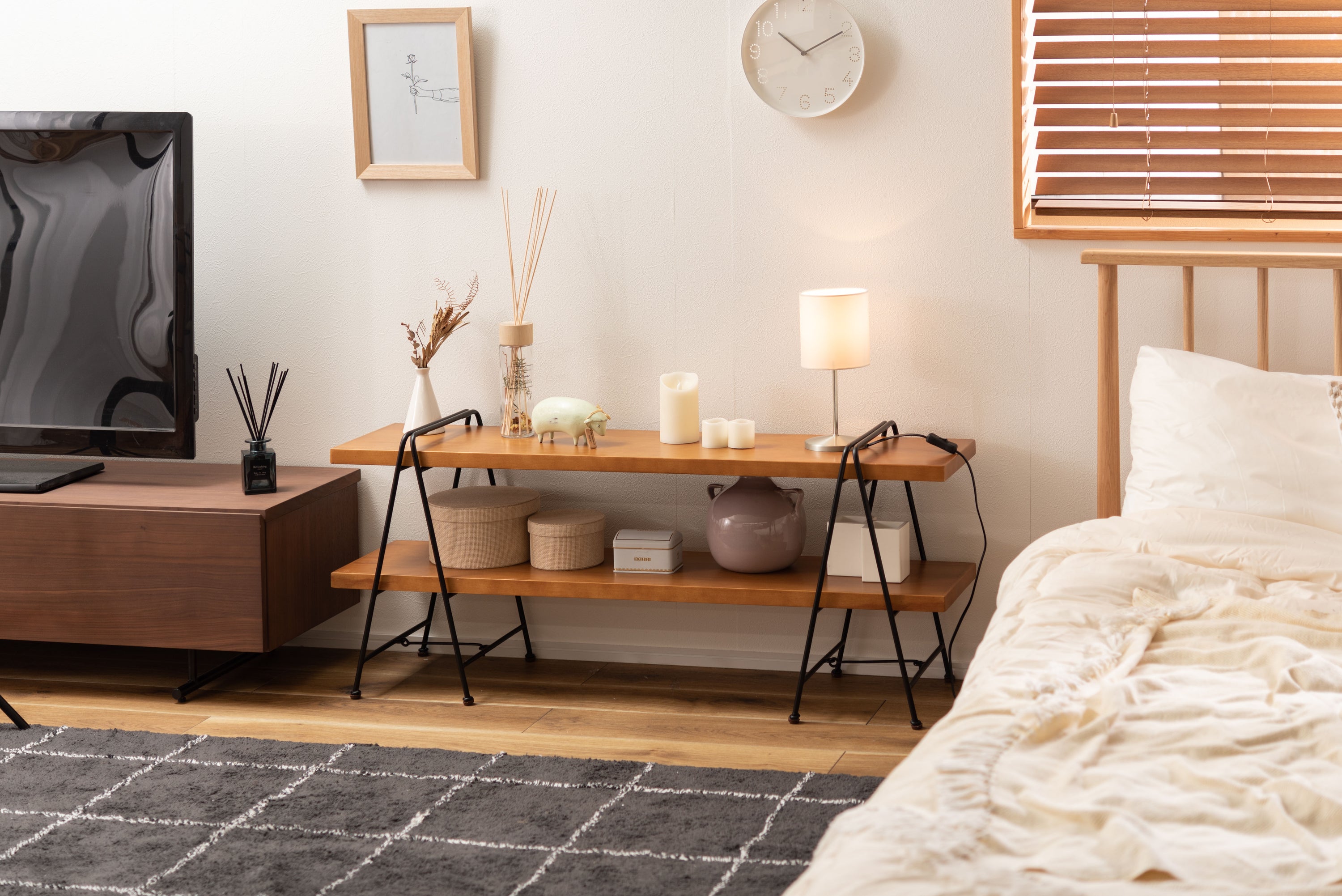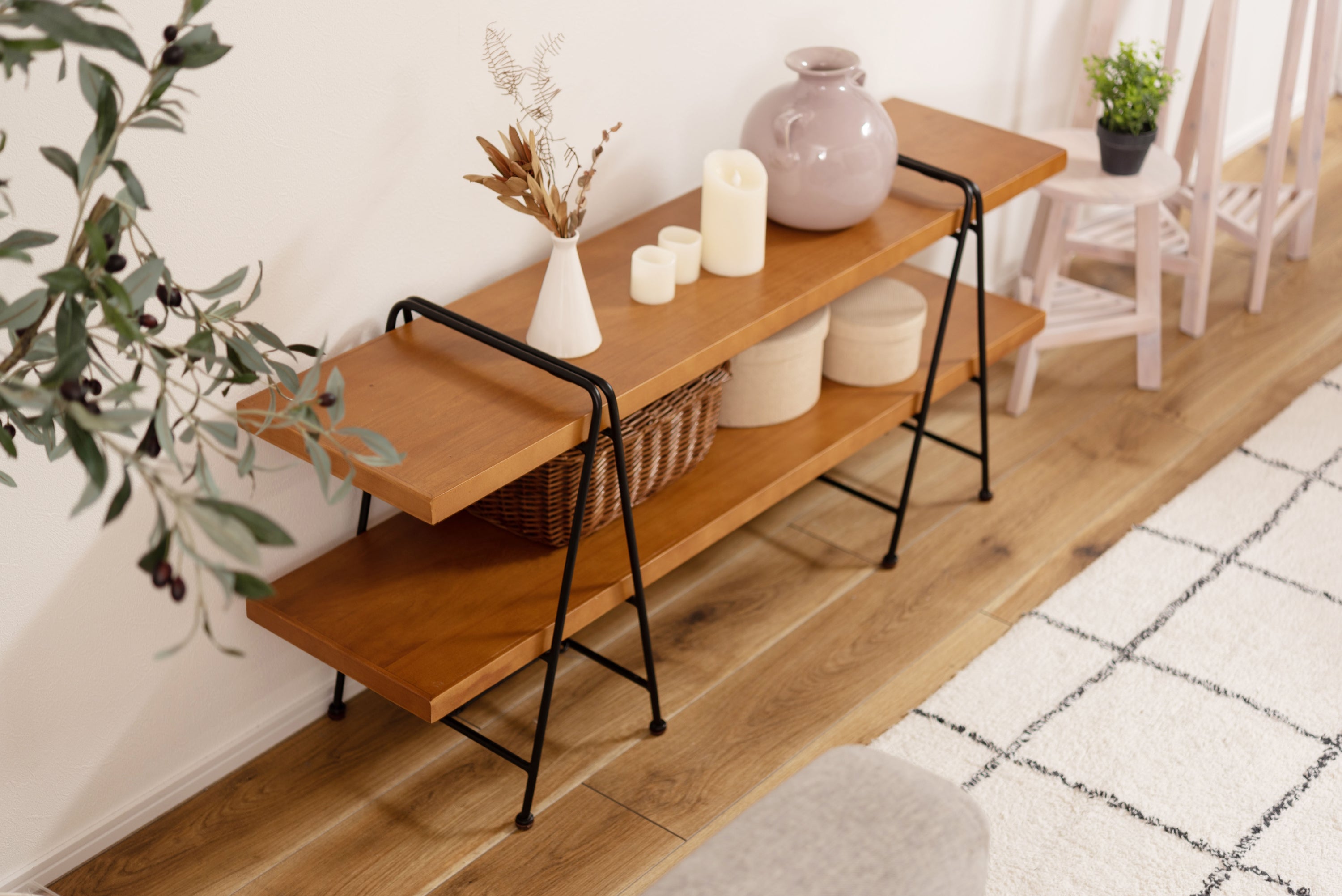 折りたたみ(フォールディング)できるシェルフ。天然木とスチールの組み合わせでデザイン性抜群。簡単に設置ができるのでイベント会場やフリーマーケットなどアイデア次第で自宅以外でも活躍します。コンパクトに折りたたむことができるので、使わない時や移動の時は狭い隙間に収納可能。天然木(パイン)を使用した風合いのあるシェルフ。棚板のサイド部分も同じ天然木で縁取りをしたこだわり仕上げ。フレームの脚先にはアジャスターが付いているのでガタツキ調整も可能。脚の下段部分にはロックバーが付いているので、脚が勝手に閉じてしまう事もなく安心です。