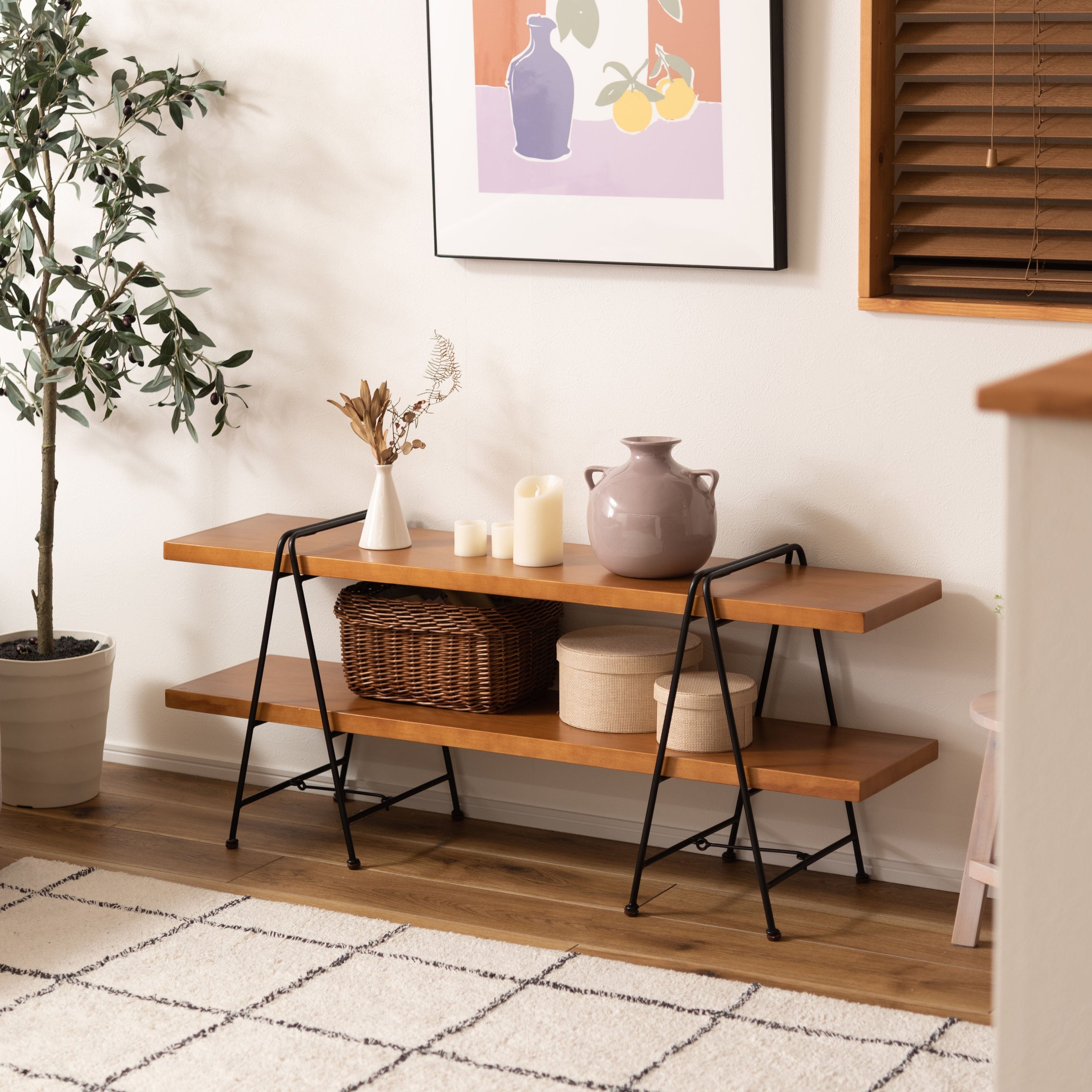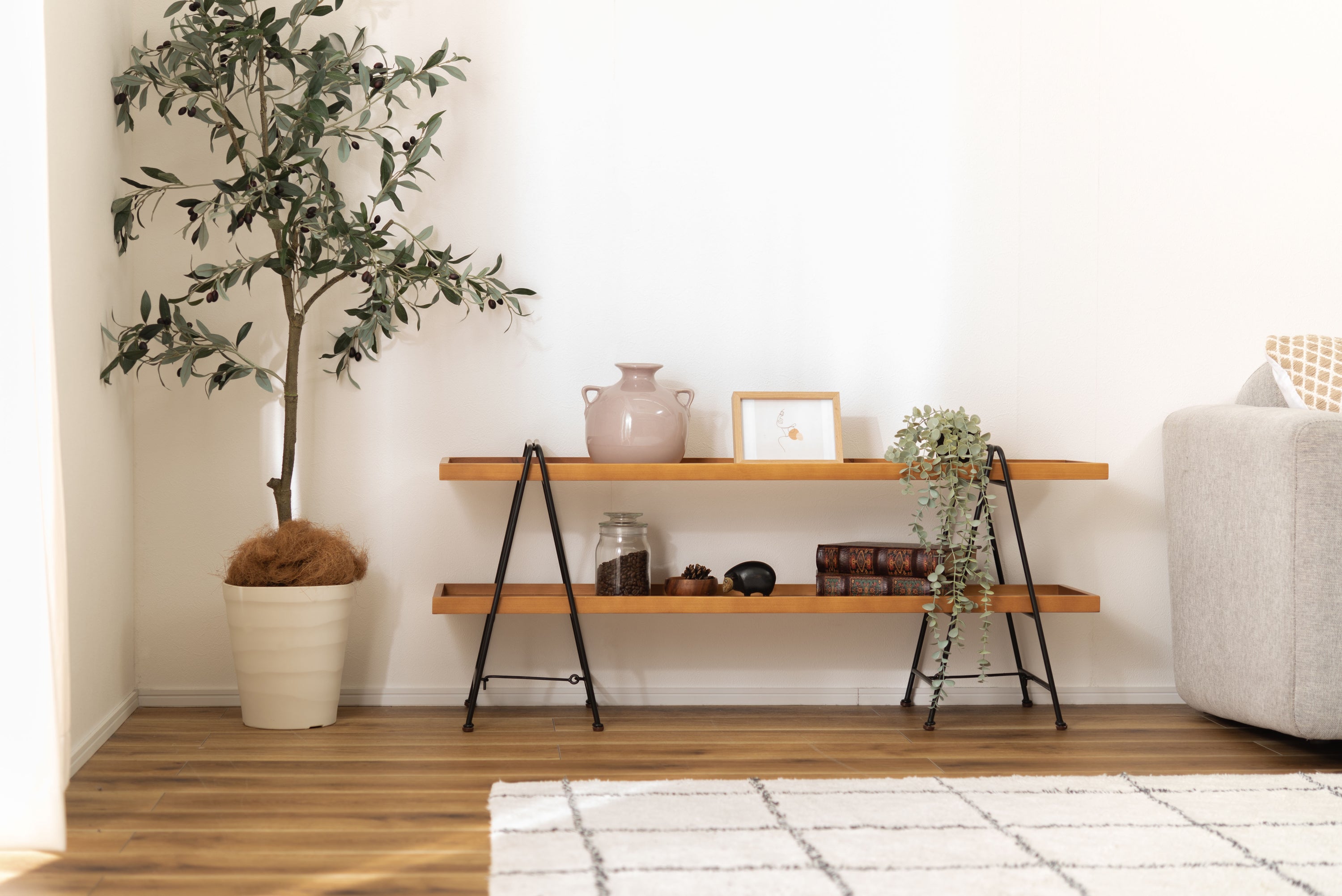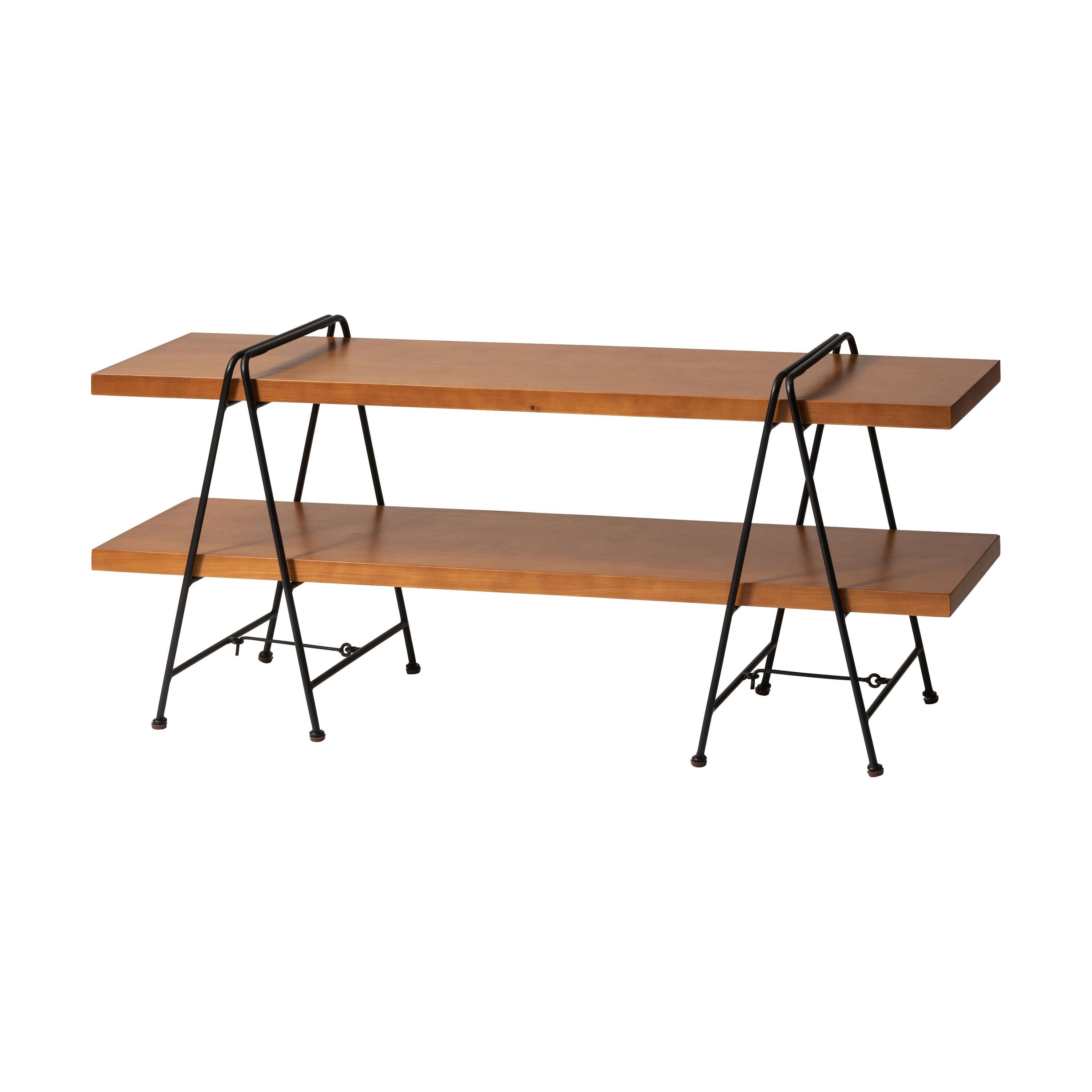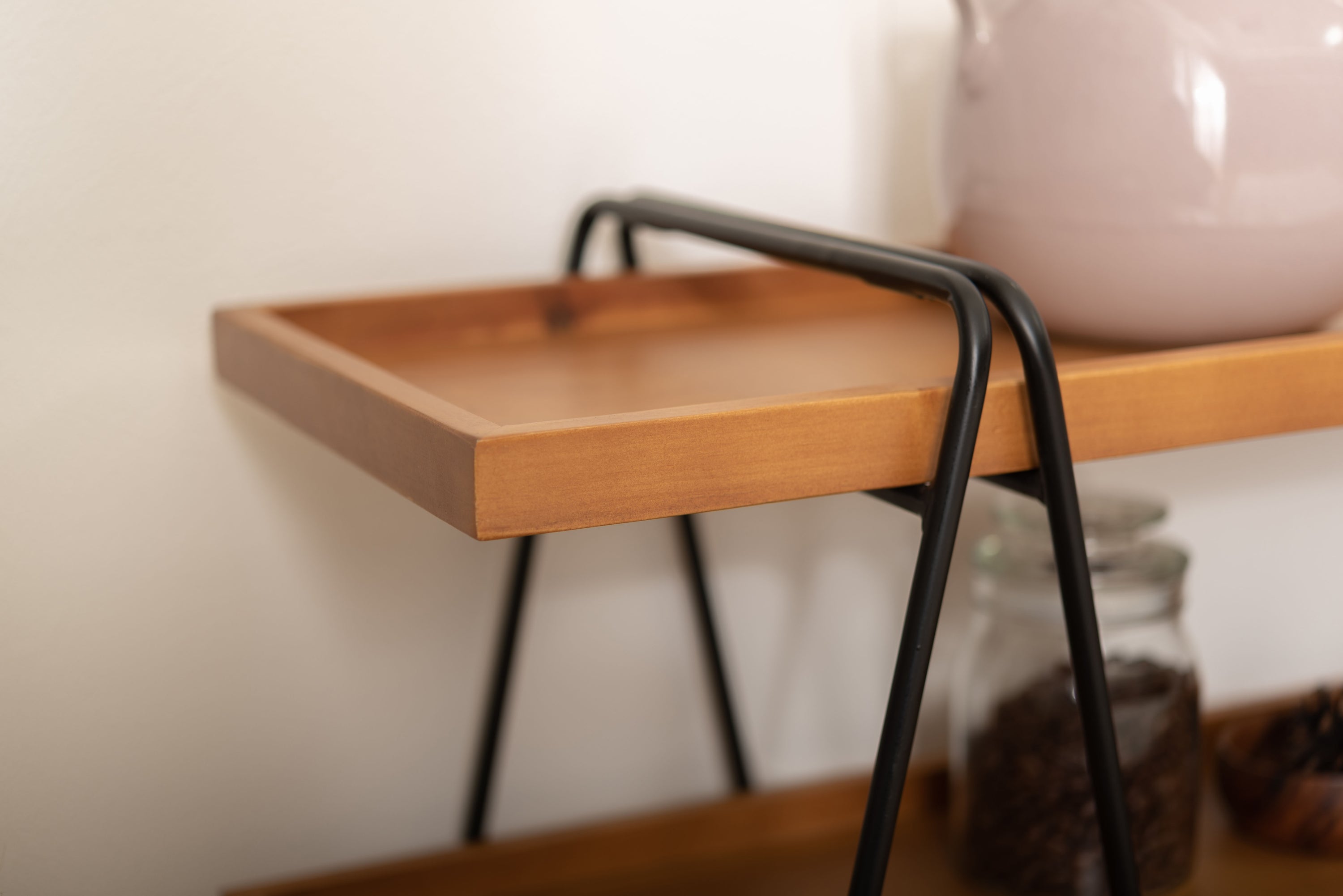 折りたたみ(フォールディング)できるシェルフ。天然木とスチールの組み合わせでデザイン性抜群。簡単に設置ができるのでイベント会場やフリーマーケットなどアイデア次第で自宅以外でも活躍します。コンパクトに折りたたむことができるので、使わない時や移動の時は狭い隙間に収納可能。天然木(パイン)を使用した風合いのあるシェルフ。棚板のサイド部分も同じ天然木で縁取りをしたこだわり仕上げ。フレームの脚先にはアジャスターが付いているのでガタツキ調整も可能。脚の下段部分にはロックバーが付いているので、脚が勝手に閉じてしまう事もなく安心です。