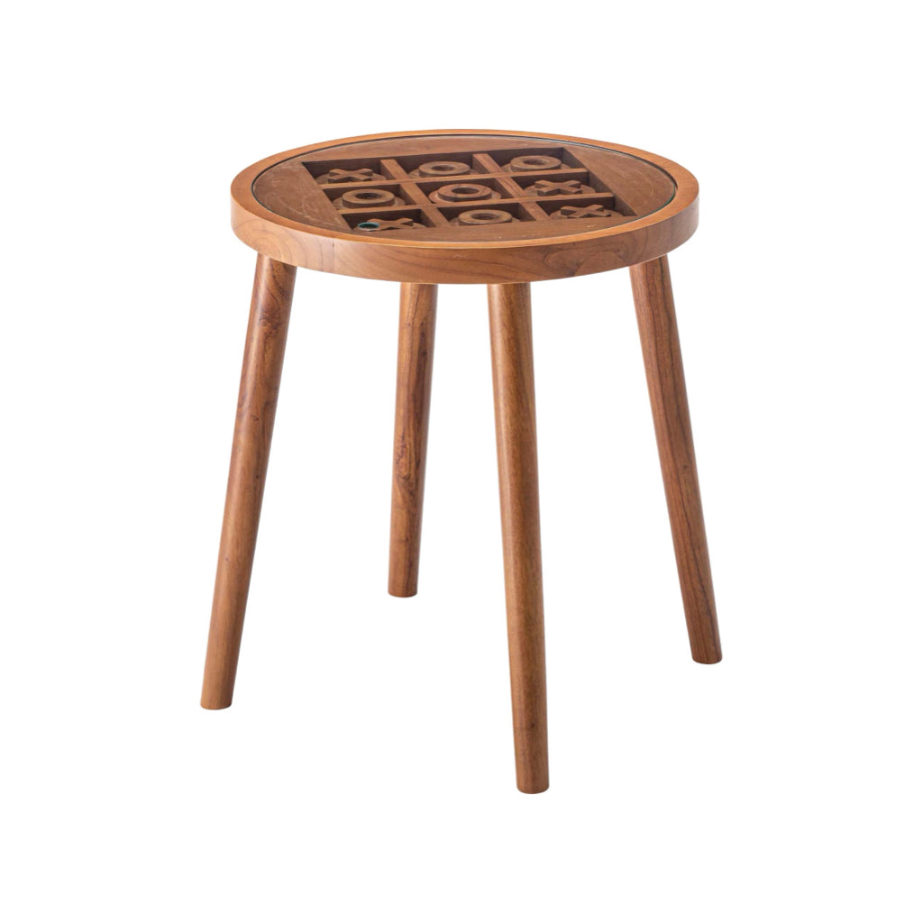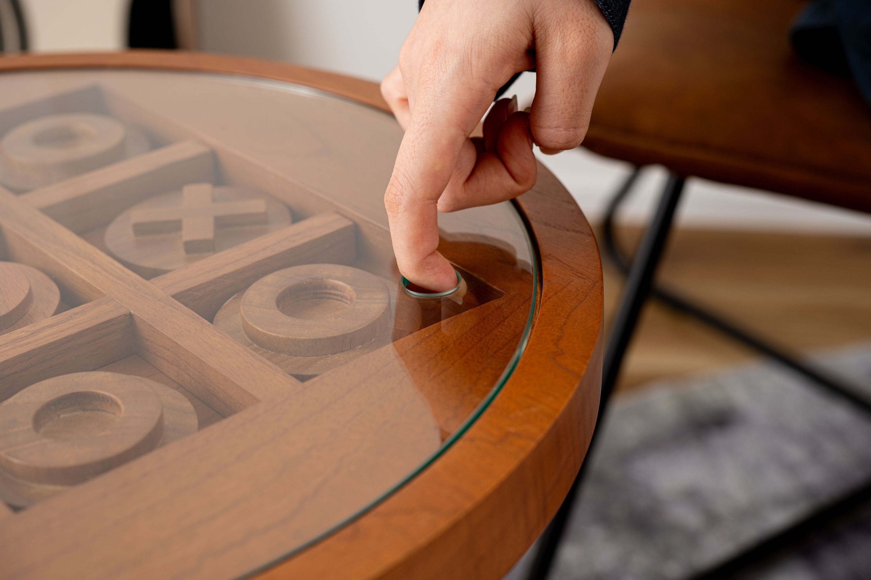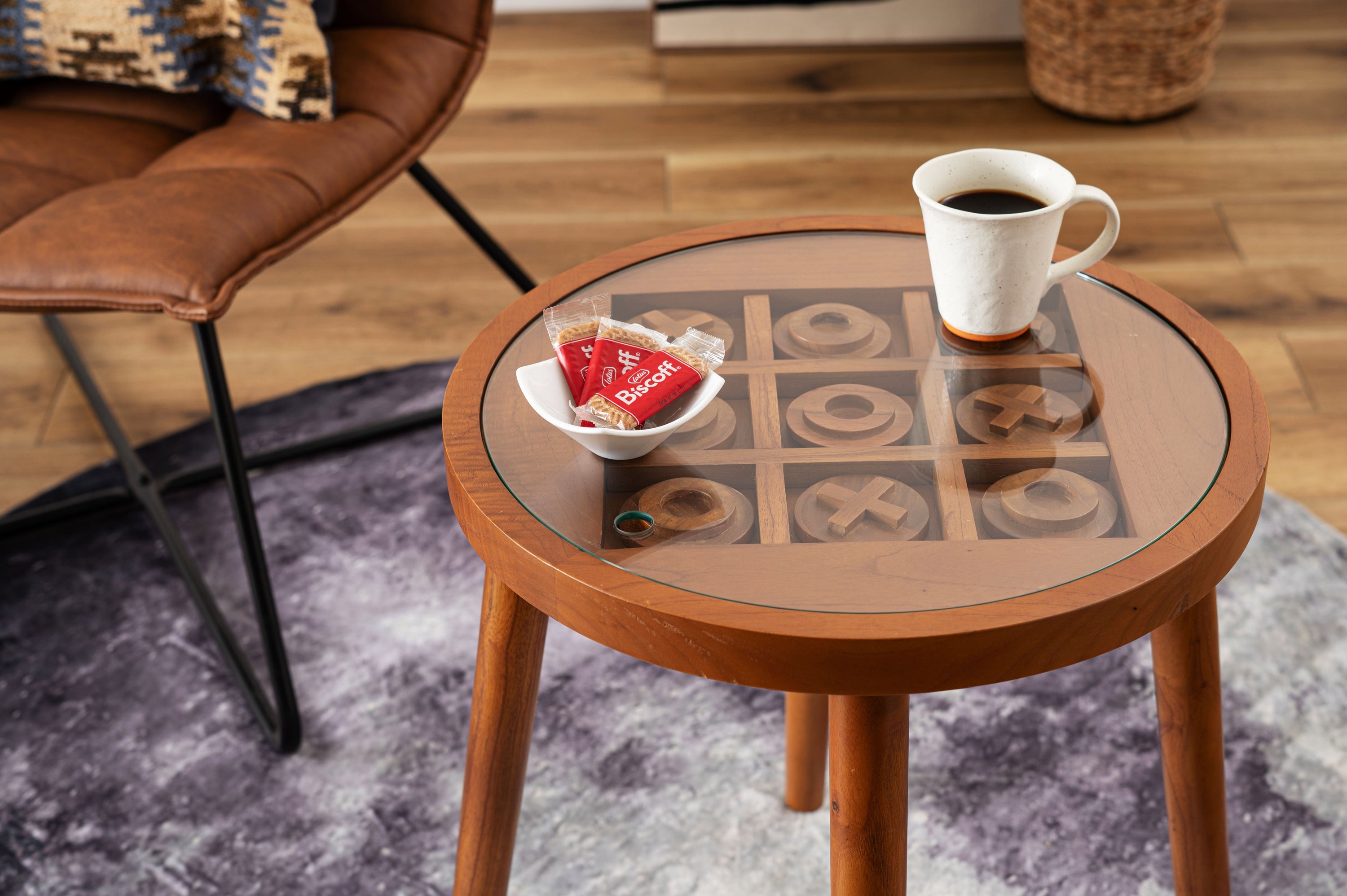 〇×ゲームのデザインを施したサイドテーブル。ガラス天板は取り外し可能なので、実際にゲームを楽しむことも可能。個性的で置くだけで目を引くアイテム。ソファ横やベッド横でサイドテーブルとして使いやすいサイズ感。仕切り板と〇×の駒付きで、天板でボードゲームが楽しめる仕様。ガラス板、仕切り共に取り外しが可能なのでお手入れも簡単。ガラス天板の下にお気に入りを並べてディスプレイテーブルとしても。※本製品は天然木を使用し一点一点手作業で作られたハンドクラフト製品の為、色や風合いに個体差がございます。