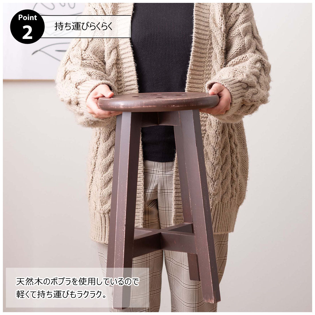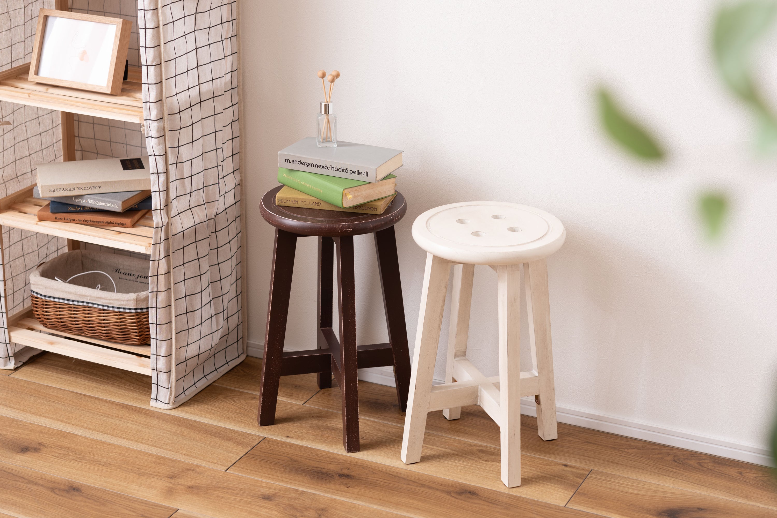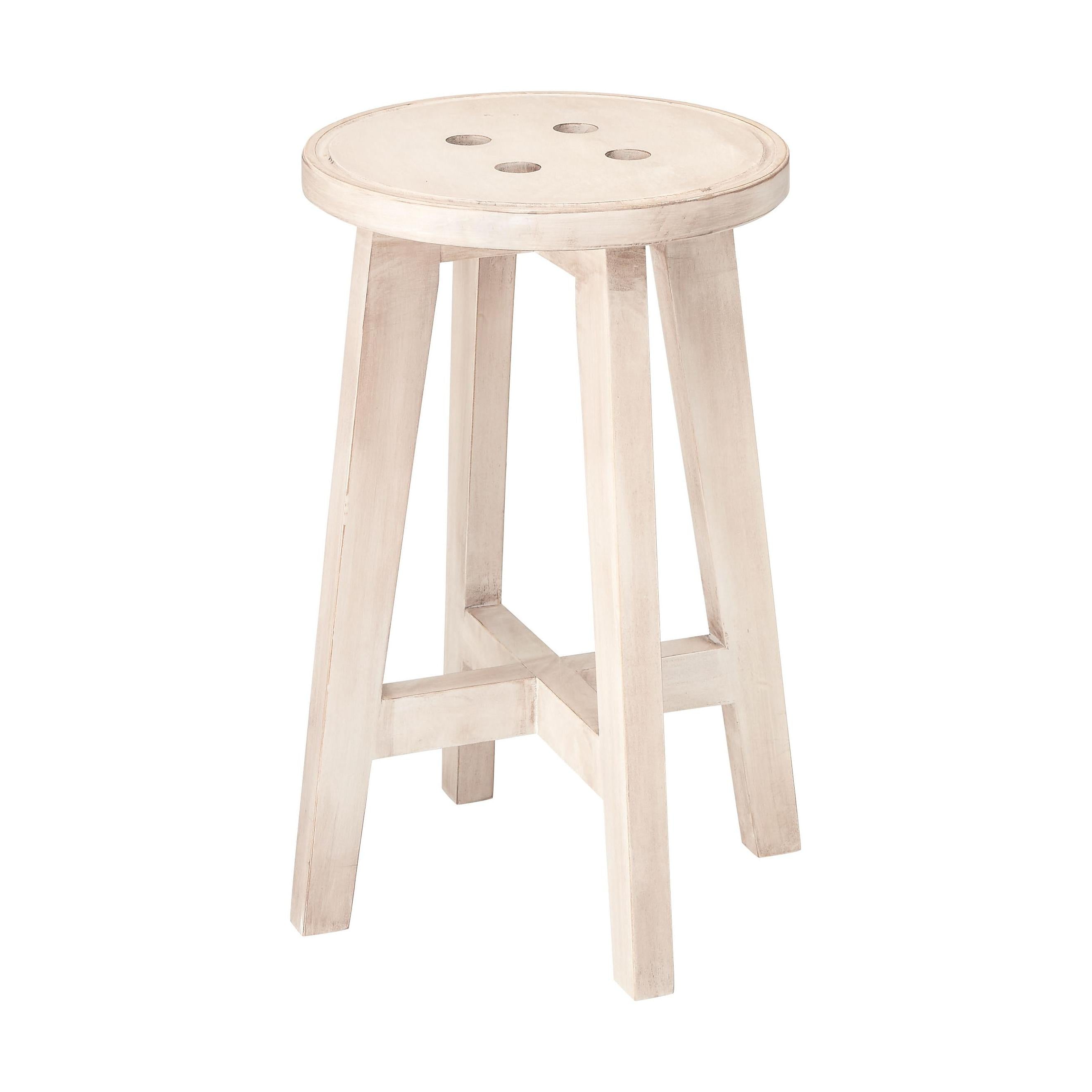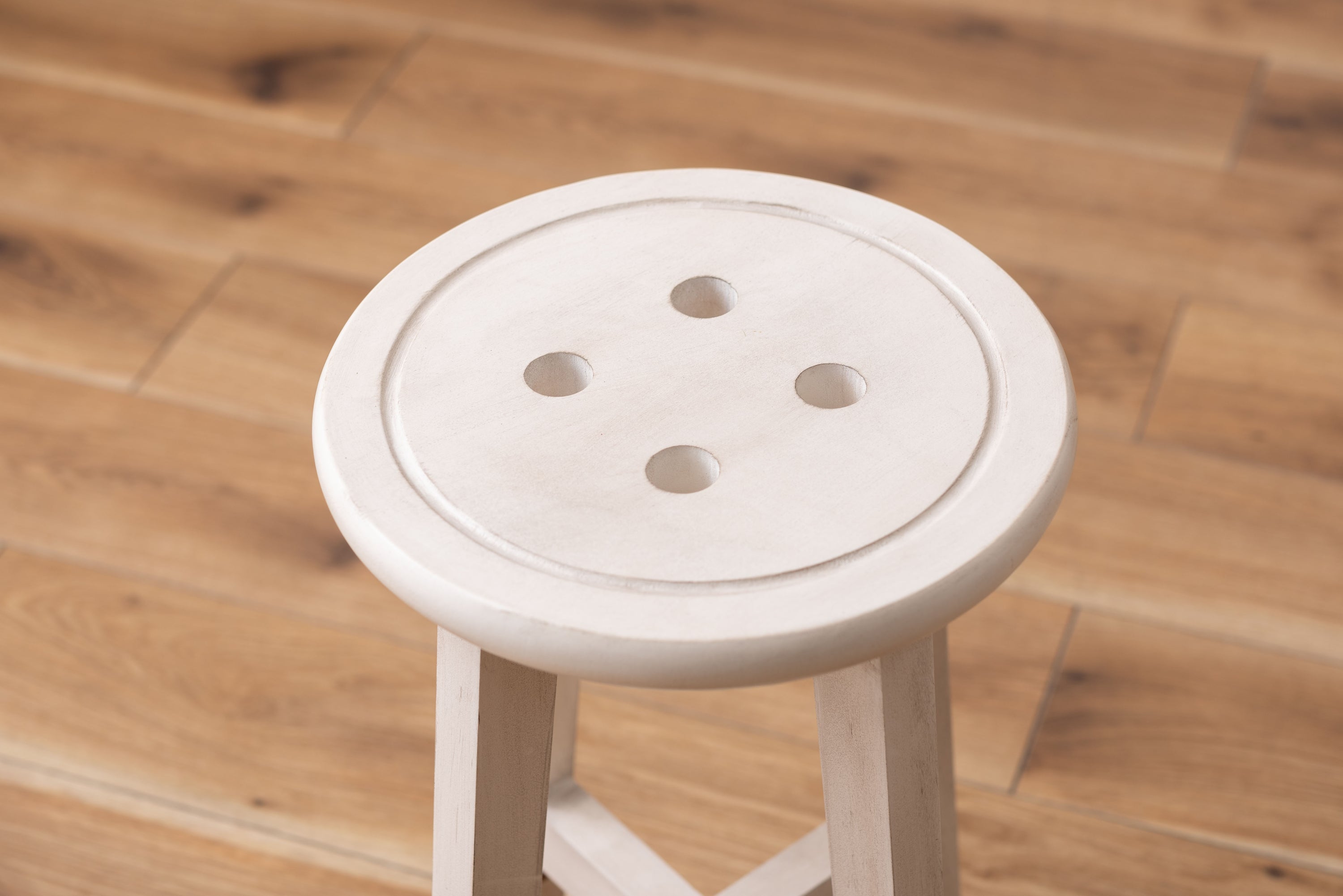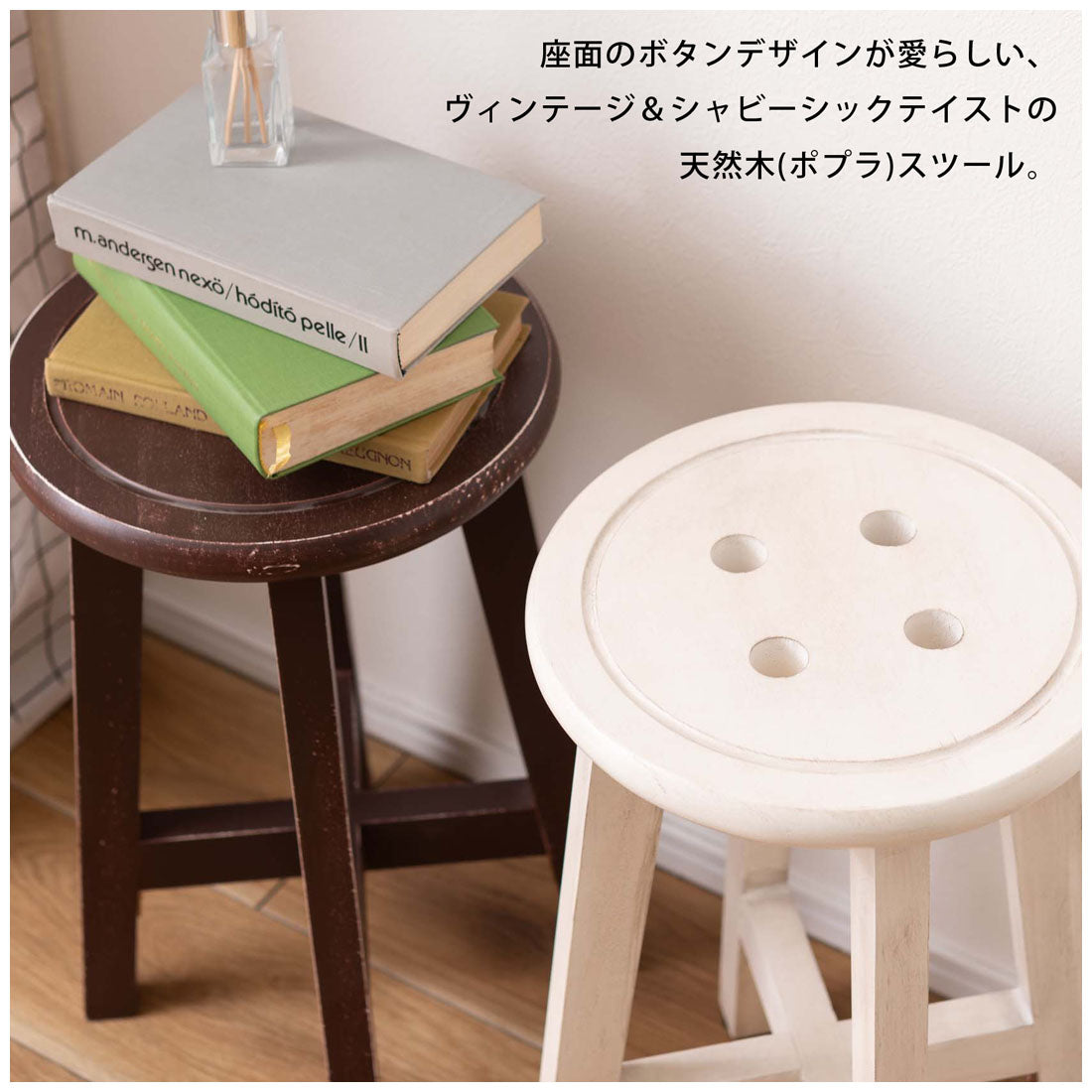 座面のボタンデザインが愛らしい、ヴィンテージ&シャビーシックテイストのスツール。天然木のポプラを使用しているので軽くて持ち運びもラクラク。座面までの高さは45cmと一般的なチェアと同じ座面高なのでダイニングでも使えます。普段使いや来客用としてのスツールはもちろん、お部屋のアクセントやソファ横のサイドテーブル、小物ディスプレイテーブルとしてもおすすめ。コンパクトサイズなので、玄関用のスツールにも最適。