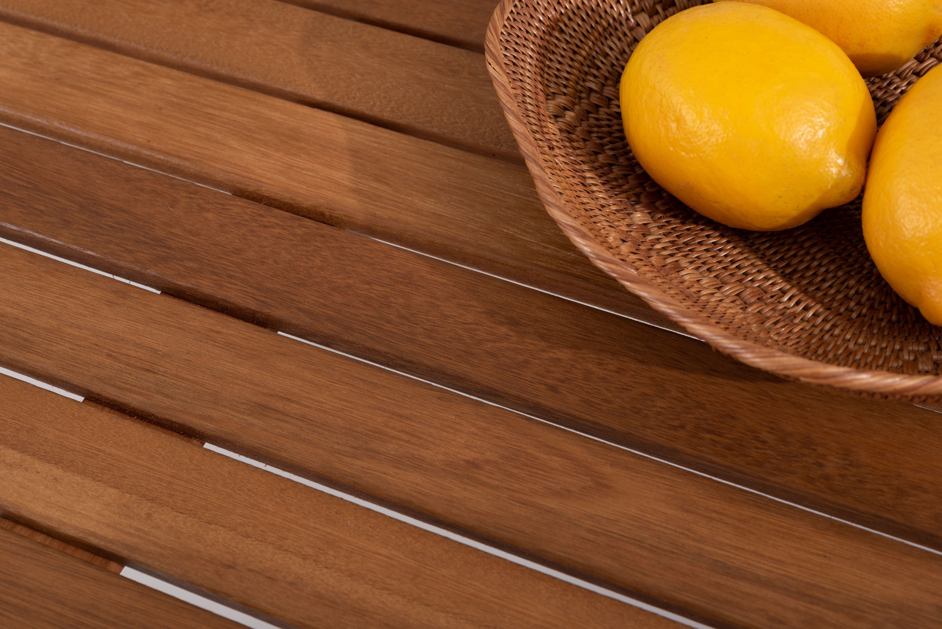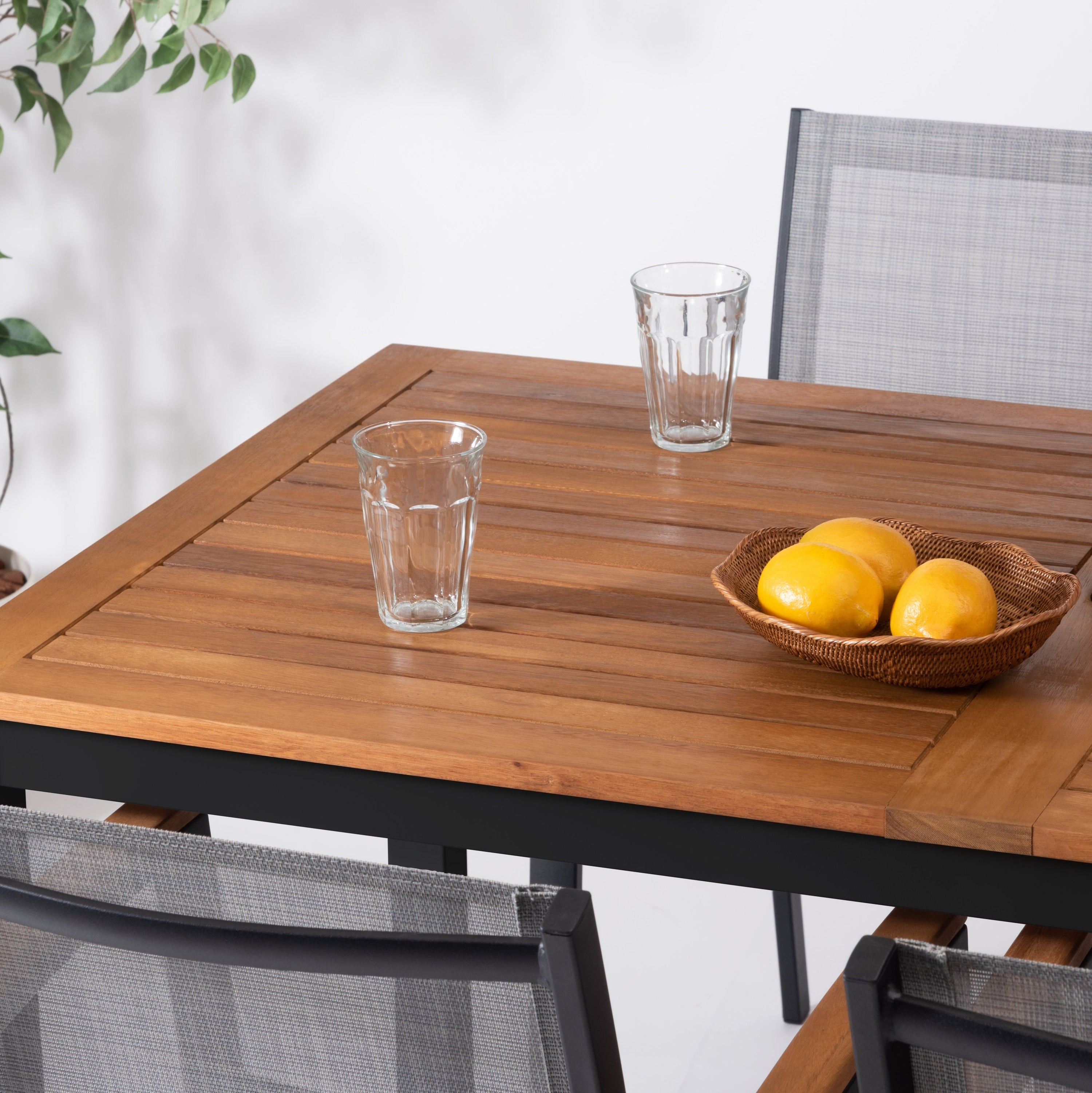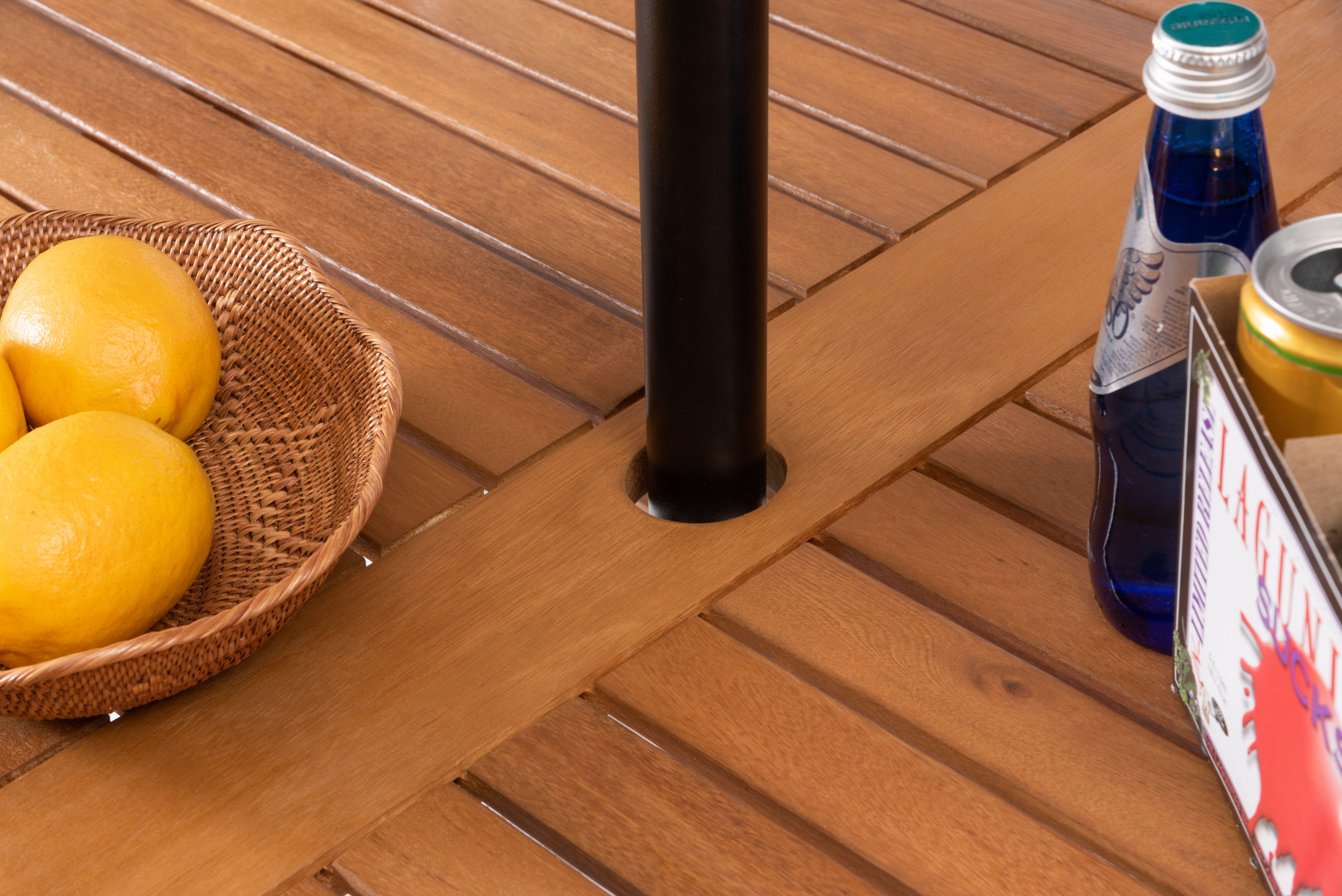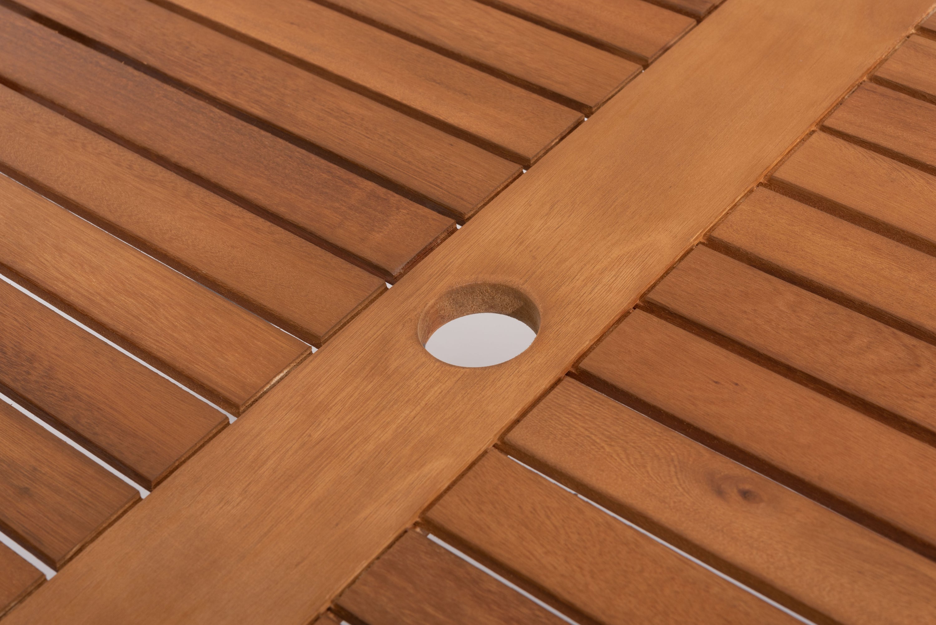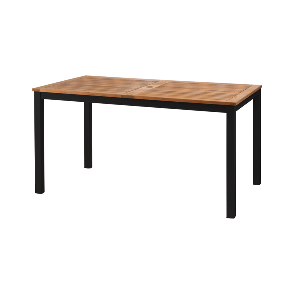 天然木の風合いと軽量なアルミの組み合わせ。 シャープなラインでシンプルにまとめたフォルムに天然木の表情を加え、スタイリッシュな中にあたたかみのあるシリーズ。 脚先にはアジャスターが付いているので、ガタツキ調整が可能。 天板中央にはガーデンパラソル用のパラソルホール付き。