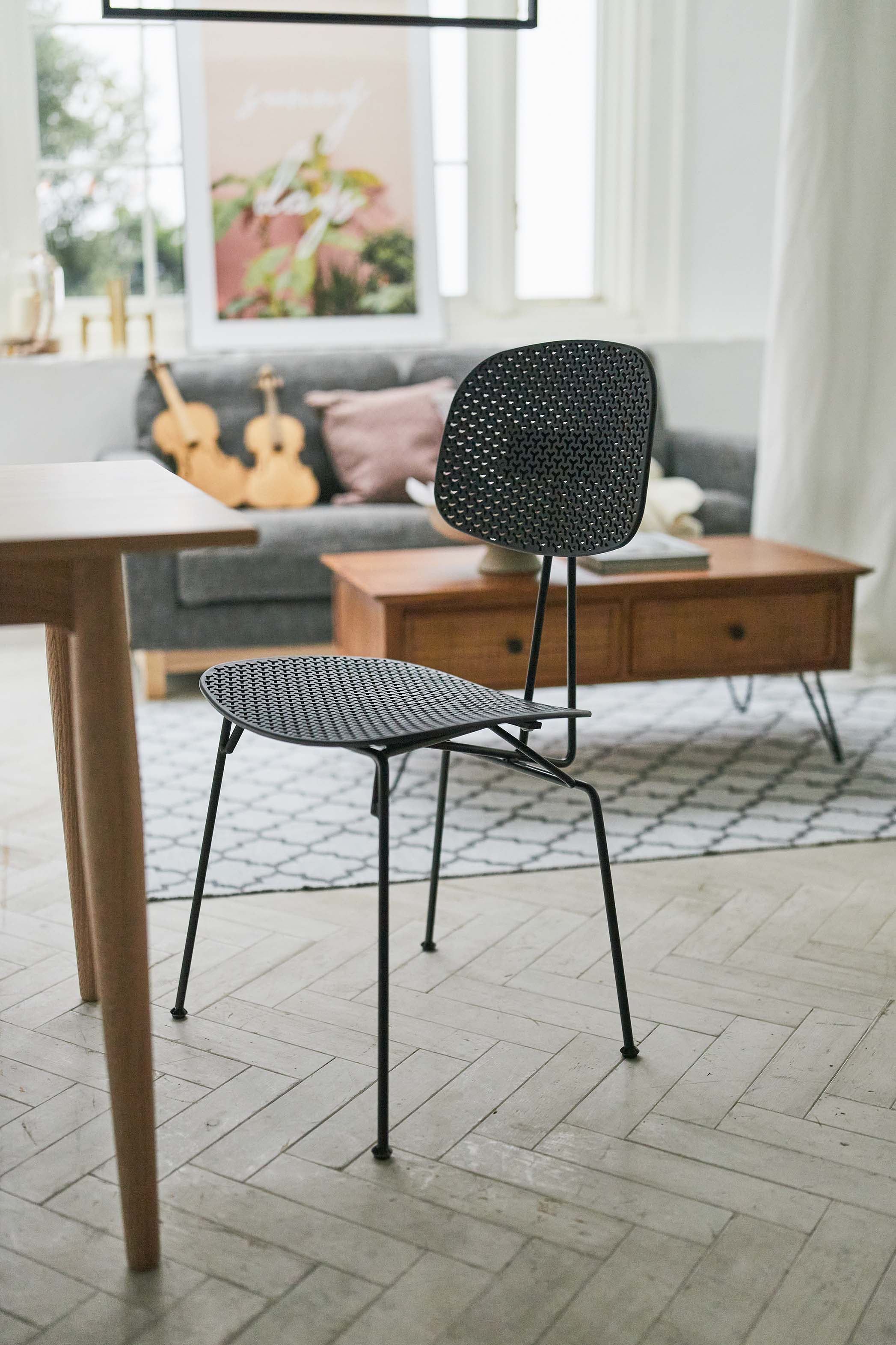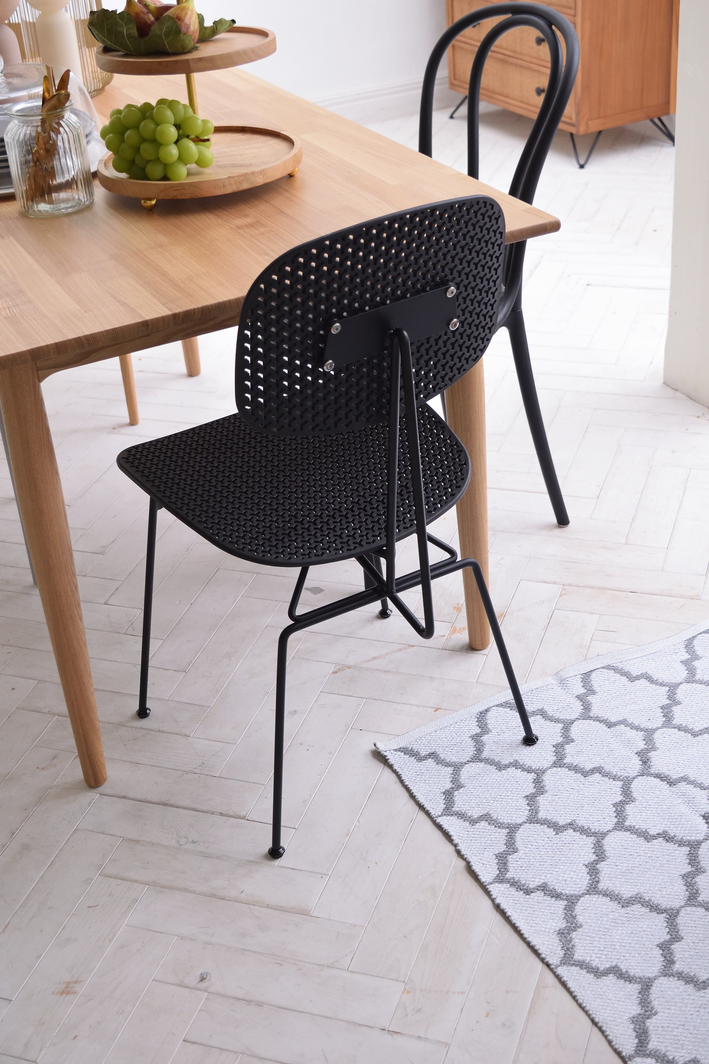 ROOMESSENCEのチェアブラックです。長時間でも快適な座り心地を備え、ダイニングやワークスペースに活躍します。ブランドの美意識を感じる佇まいで、日常づかいから来客時まで幅広く対応。品番:PC-681BK。暮らしに上質なアクセントを添える一品です。