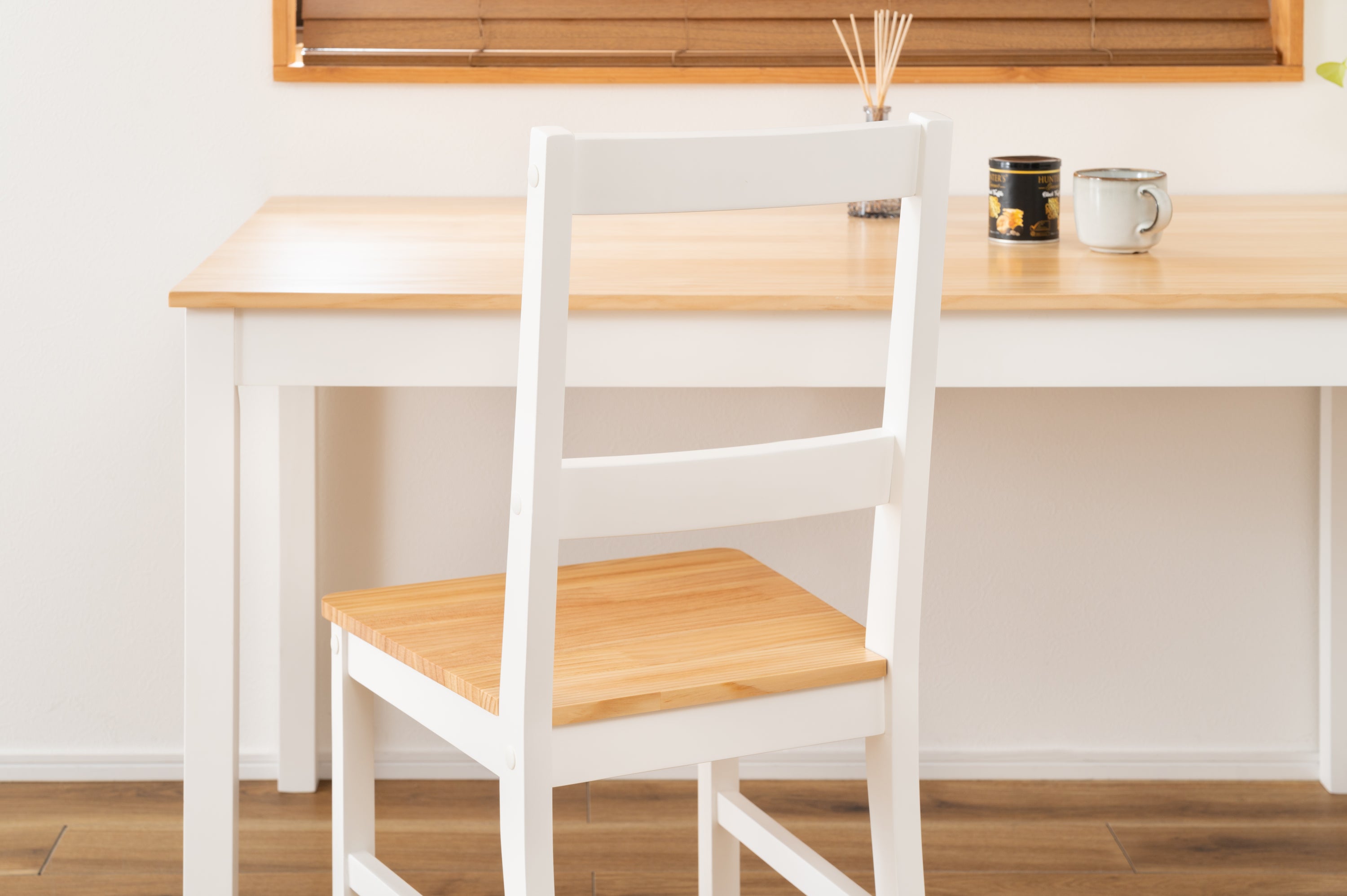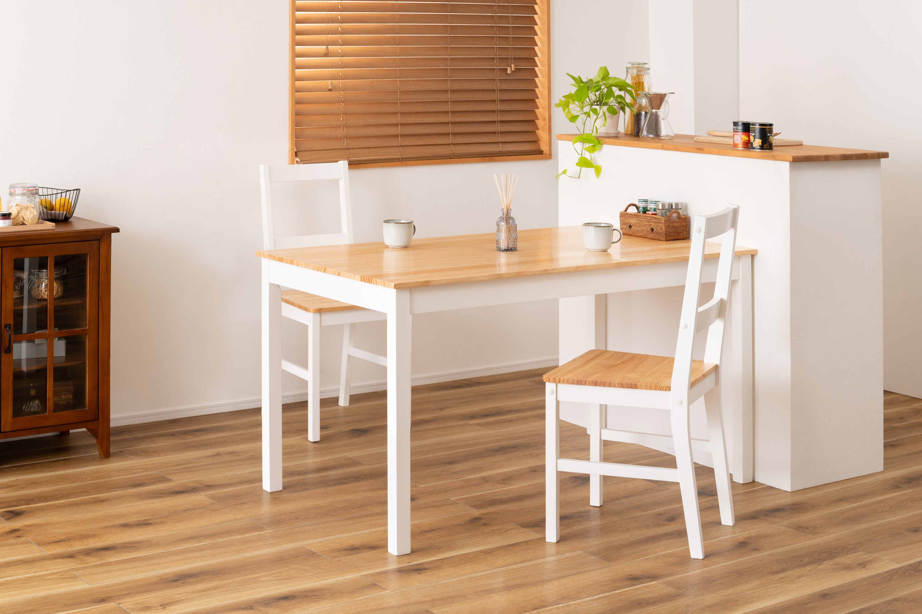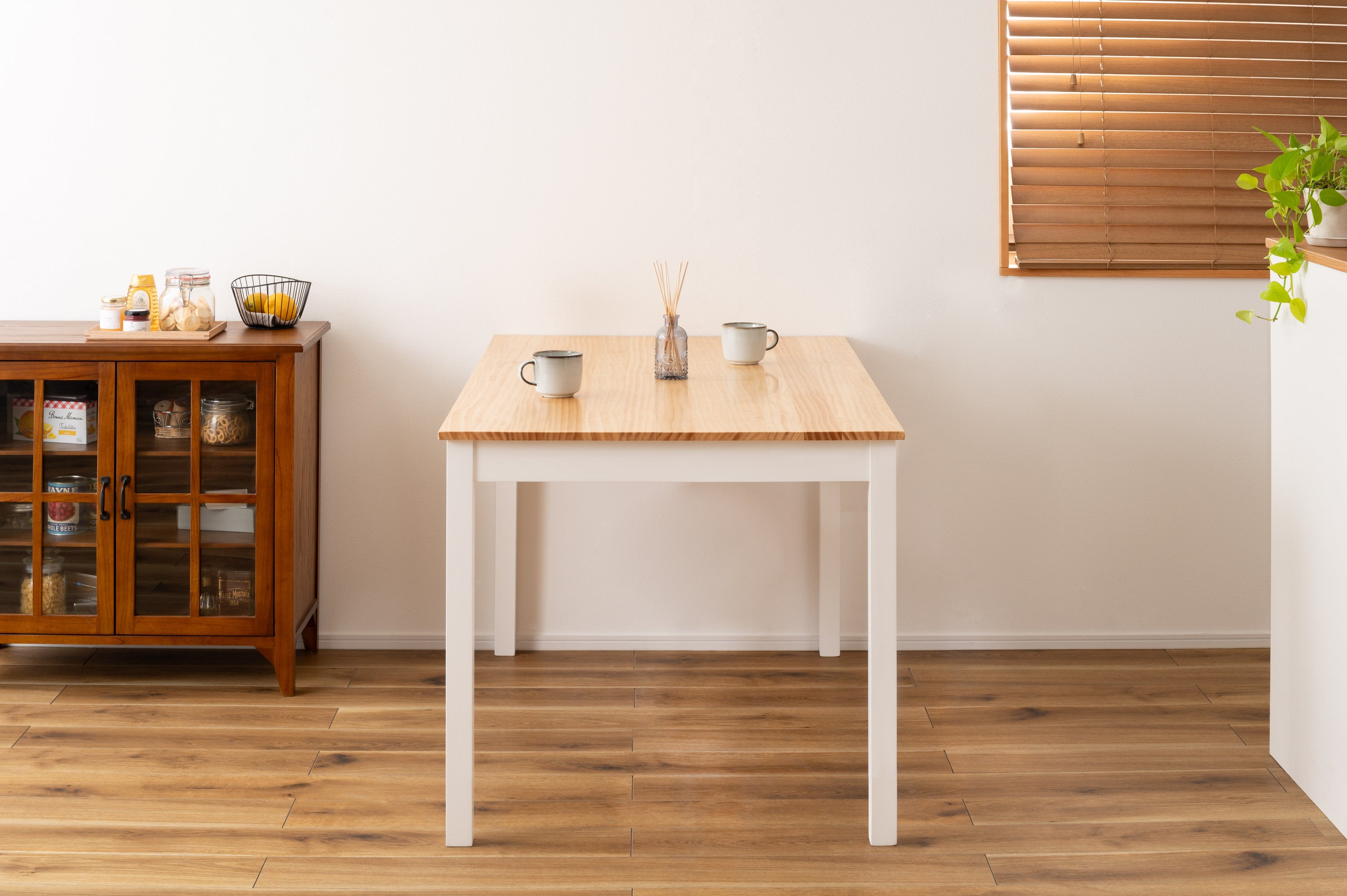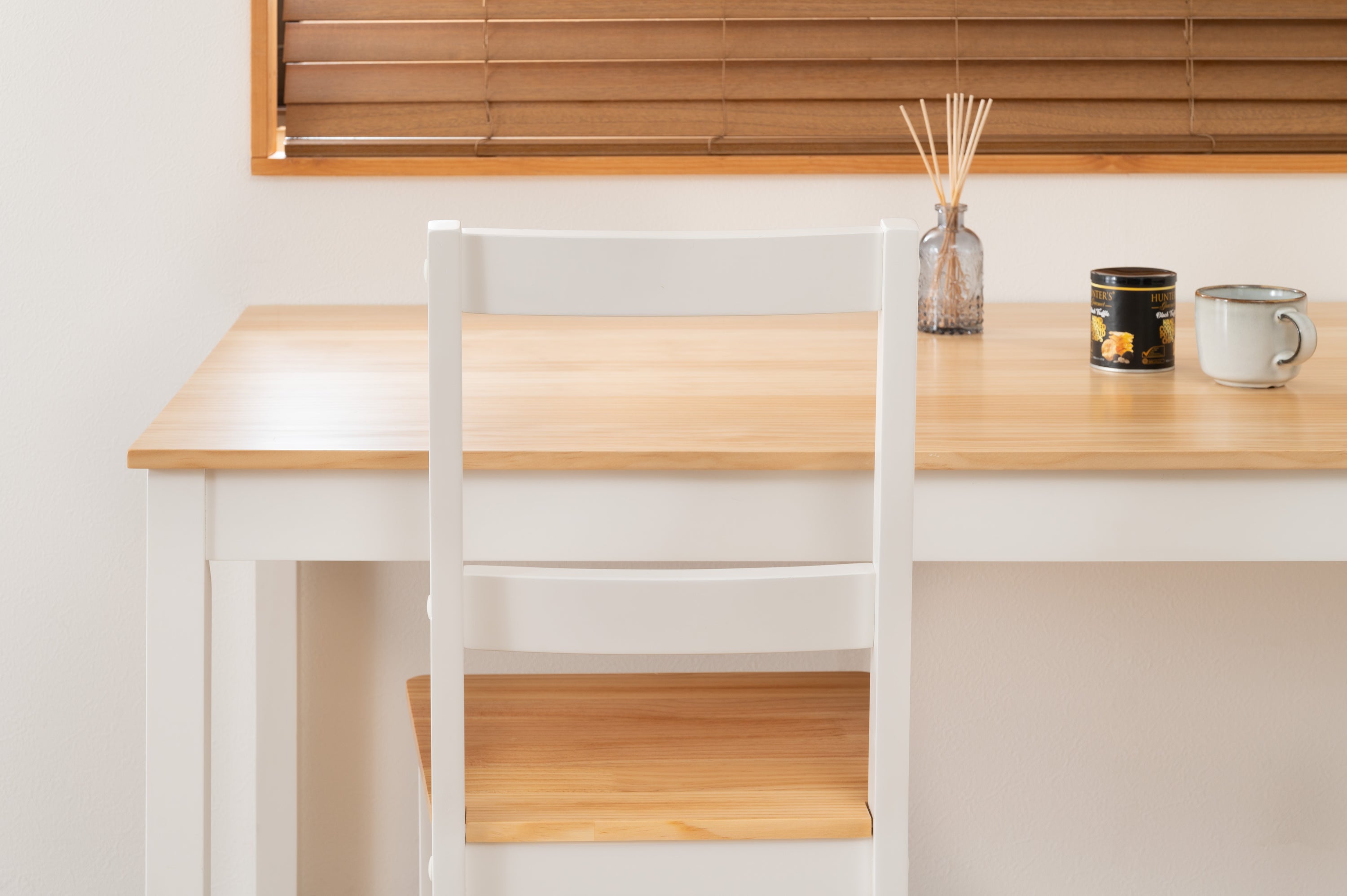あたたかみのある木目と真っ白な脚が爽やかで美しいナチュラルなダイニングテーブル。天然木を活かした落ち着きのある、上品な印象に仕上げました。シンプルなデザインのため空間に合わせやすく、優しい雰囲気を演出します。