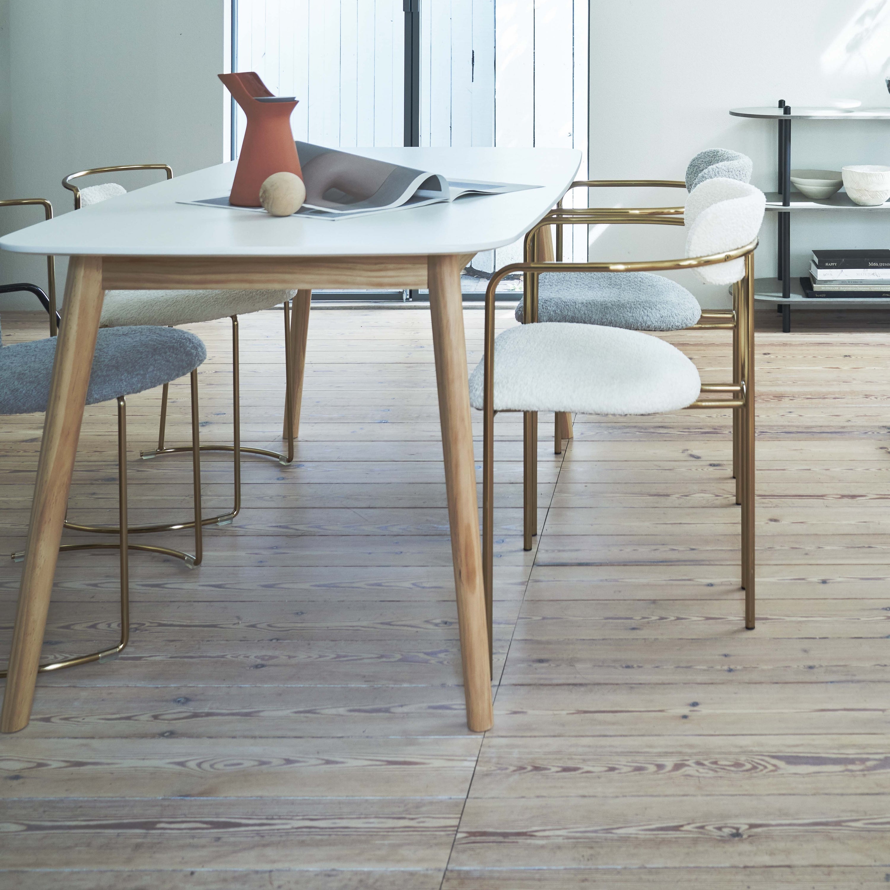 ROOMESSENCEのダイニングテーブルホワイトです。安定感のあるつくりを備え、ダイニングや作業台として活躍します。ブランドの美意識を感じる佇まいで、日常づかいから来客時まで幅広く対応。品番:TAP-320WH。暮らしに上質なアクセントを添える一品です。