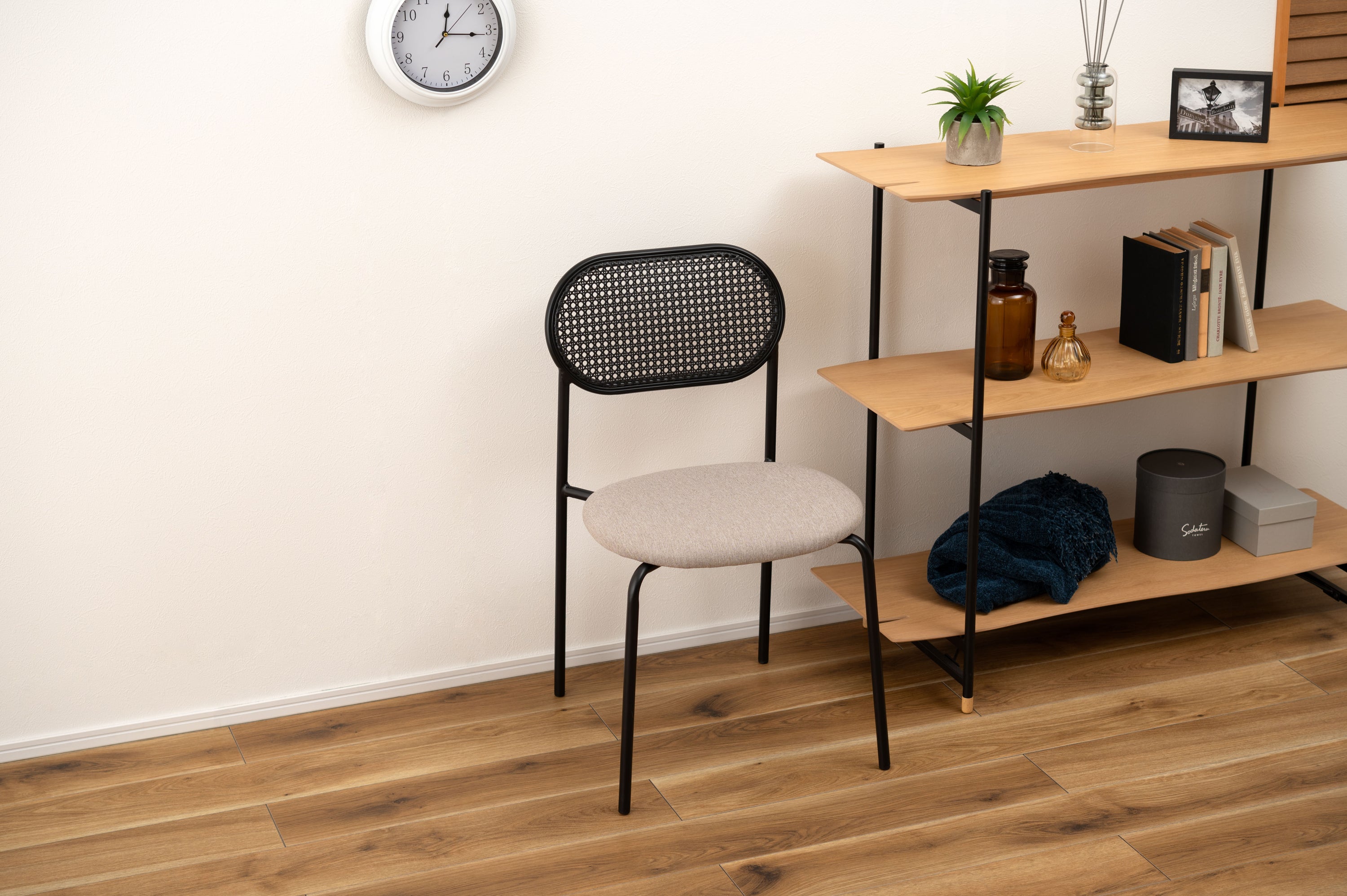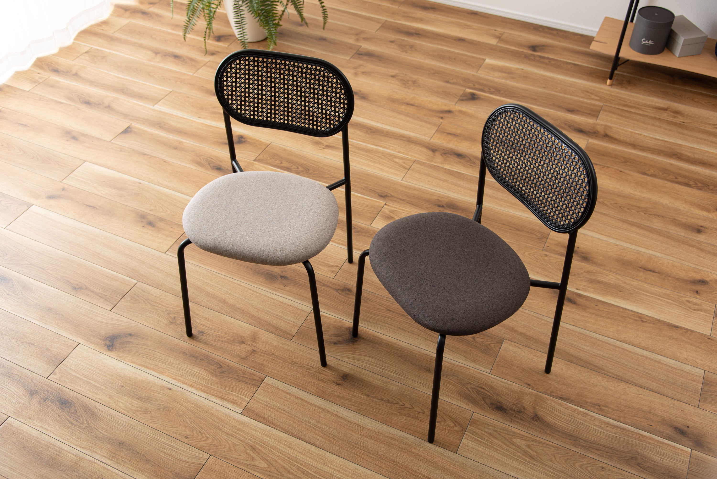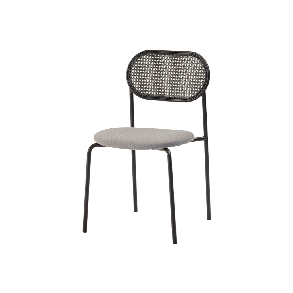 ラタン調×ブラックスチールのスタイリッシュなデザイン。シンプルながら目を引くかごめ編み調デザインを施した背面と、艶を抑えたブラックスチールの組み合わせがモダンなチェア。座面には落ち着いた、モノトーンカラーのファブリックを採用。締まった脚部がシャープな印象を与え、空間に上品さを加えます。