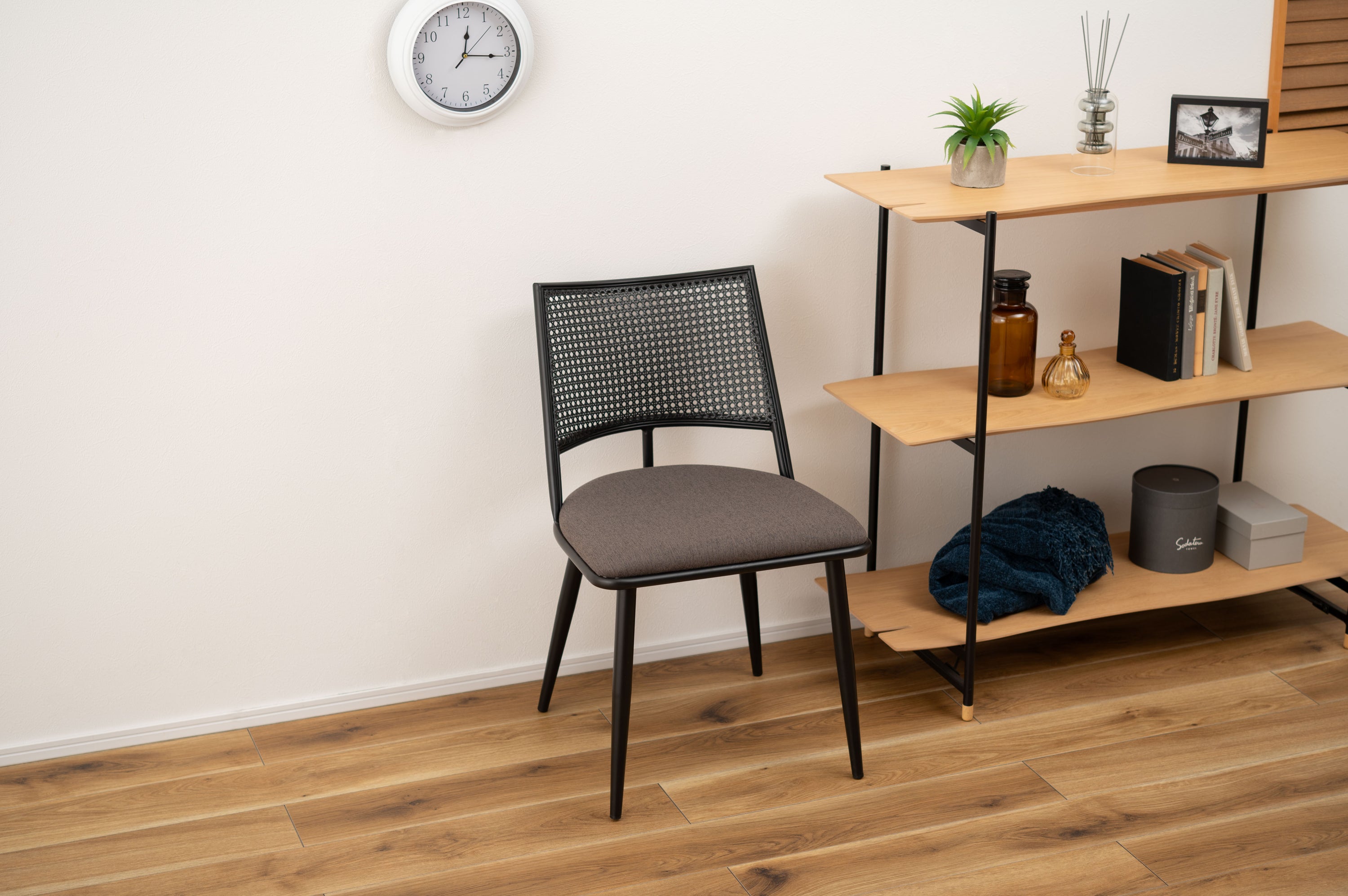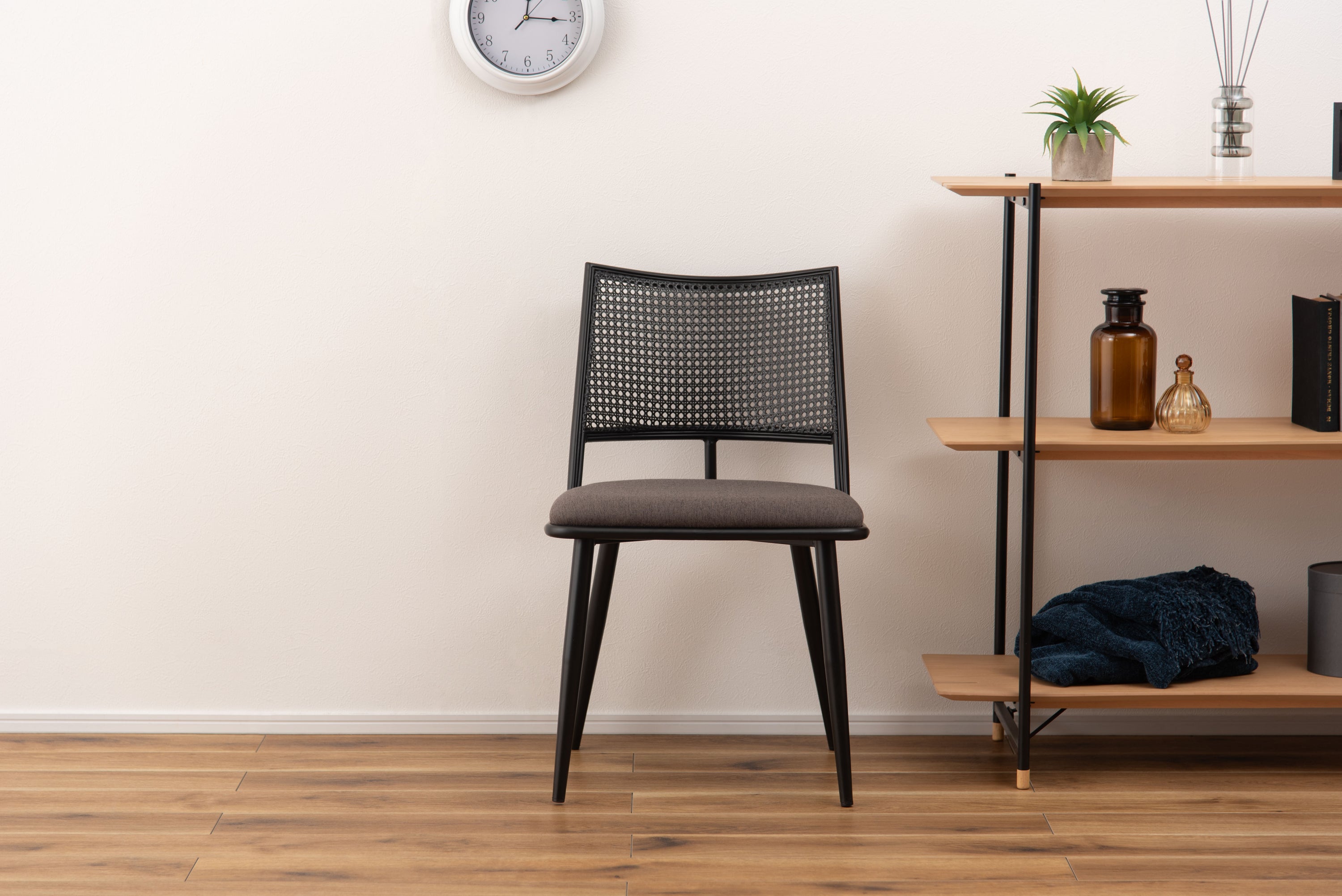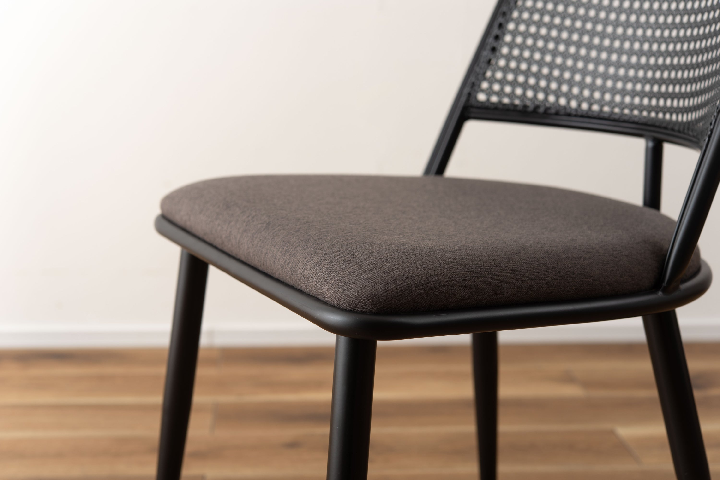 ラタン調×ブラックスチールのスタイリッシュなデザイン。シンプルながら目を引くかごめ編み調デザインを施した背面と、艶を抑えたブラックスチールの組み合わせがモダンなチェア。座面には落ち着いた、モノトーンカラーのファブリックを採用。締まった脚部がシャープな印象を与え、空間に上品さを加えます。