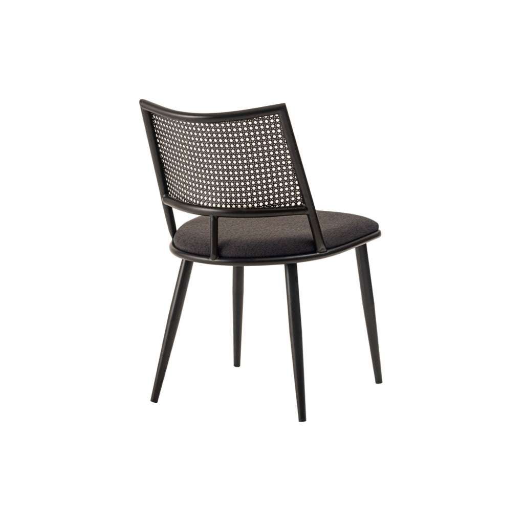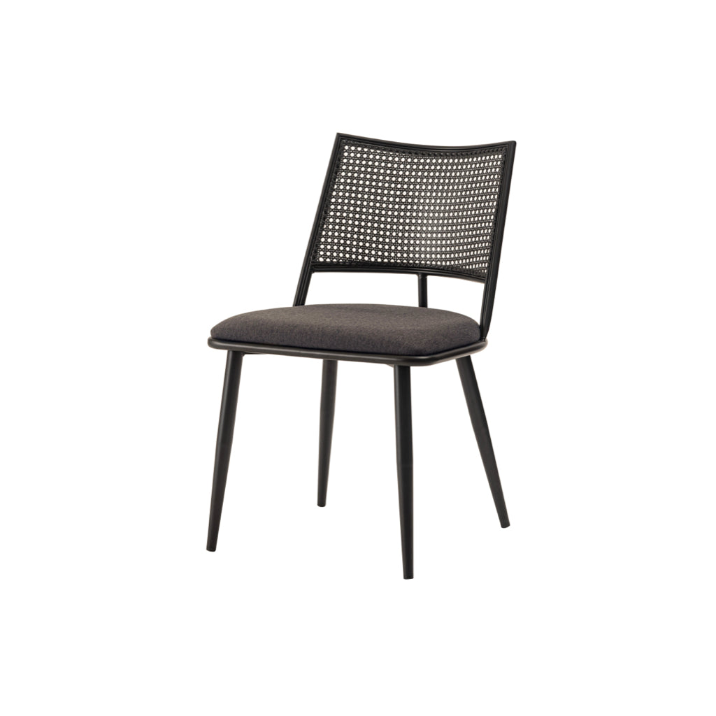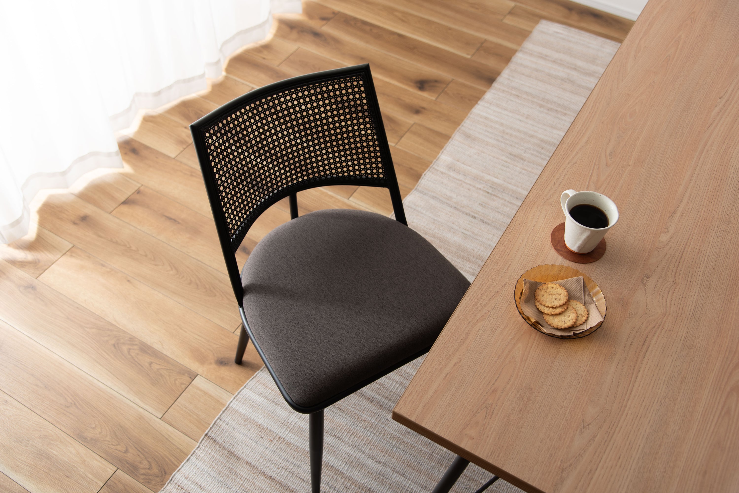 ラタン調×ブラックスチールのスタイリッシュなデザイン。シンプルながら目を引くかごめ編み調デザインを施した背面と、艶を抑えたブラックスチールの組み合わせがモダンなチェア。座面には落ち着いた、モノトーンカラーのファブリックを採用。締まった脚部がシャープな印象を与え、空間に上品さを加えます。