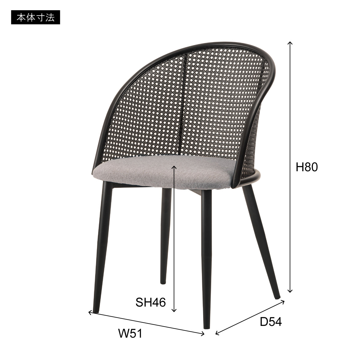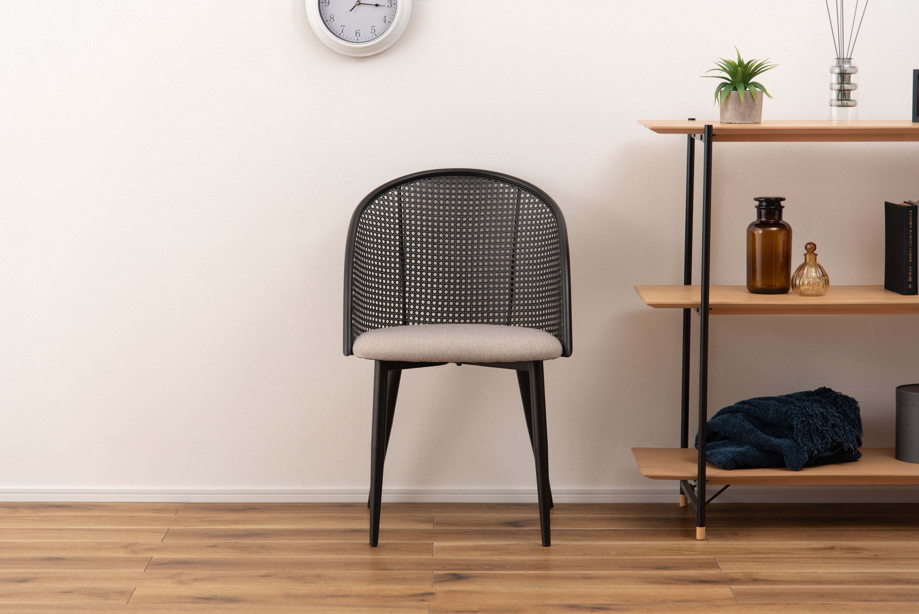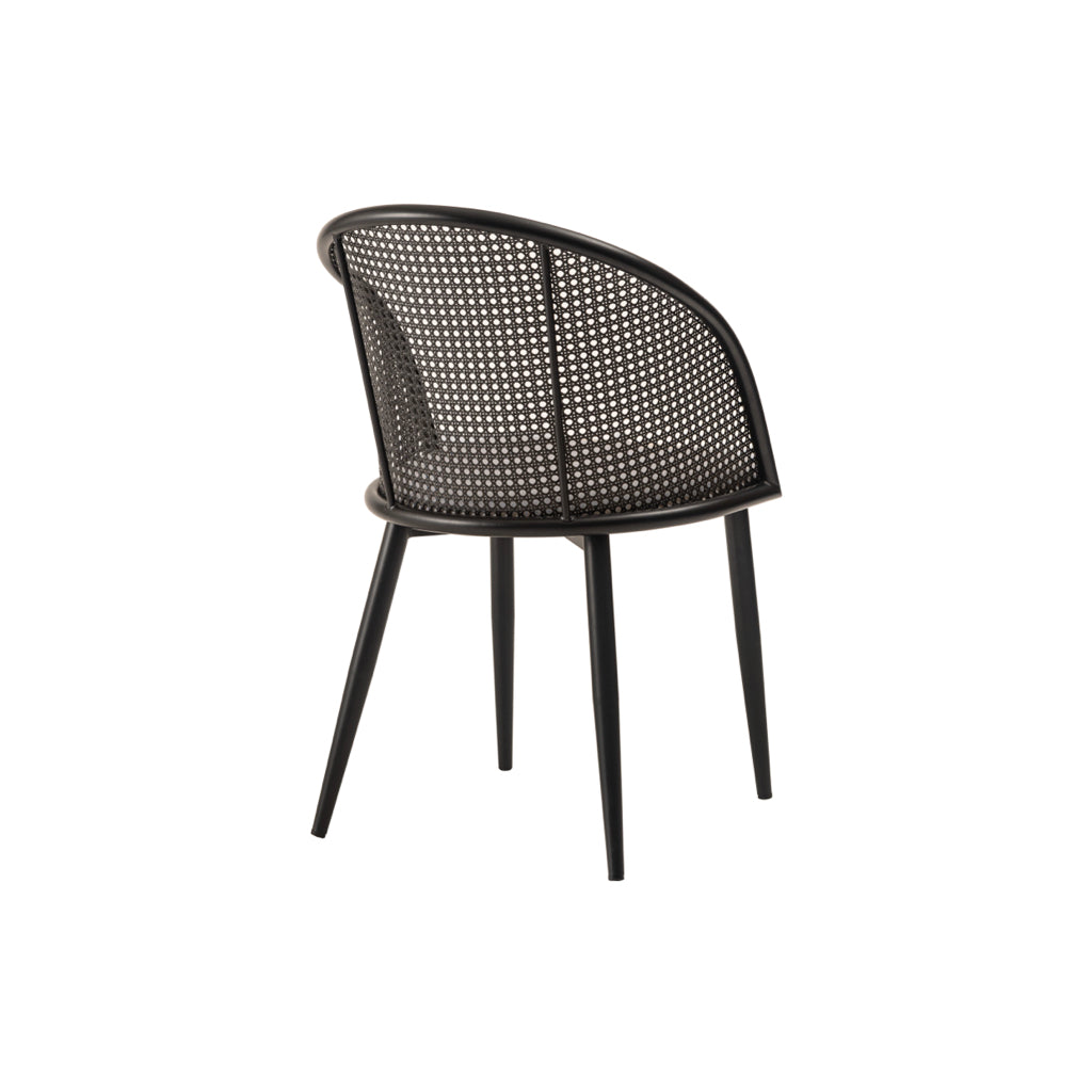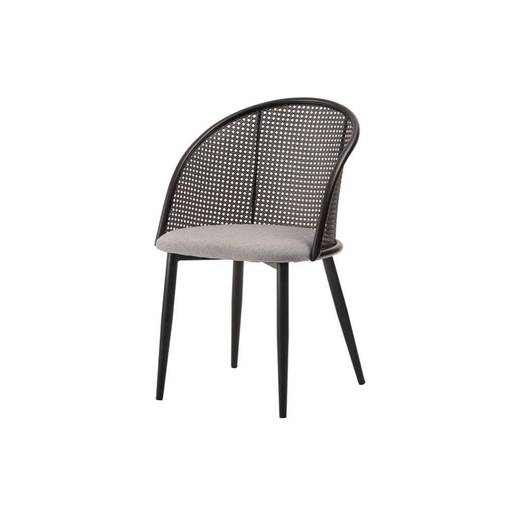 ラタン調×ブラックスチールのスタイリッシュなデザイン。シンプルながら目を引くかごめ編み調デザインを施した背面と、艶を抑えたブラックスチールの組み合わせがモダンなチェア。座面には落ち着いた、モノトーンカラーのファブリックを採用。締まった脚部がシャープな印象を与え、空間に上品さを加えます。