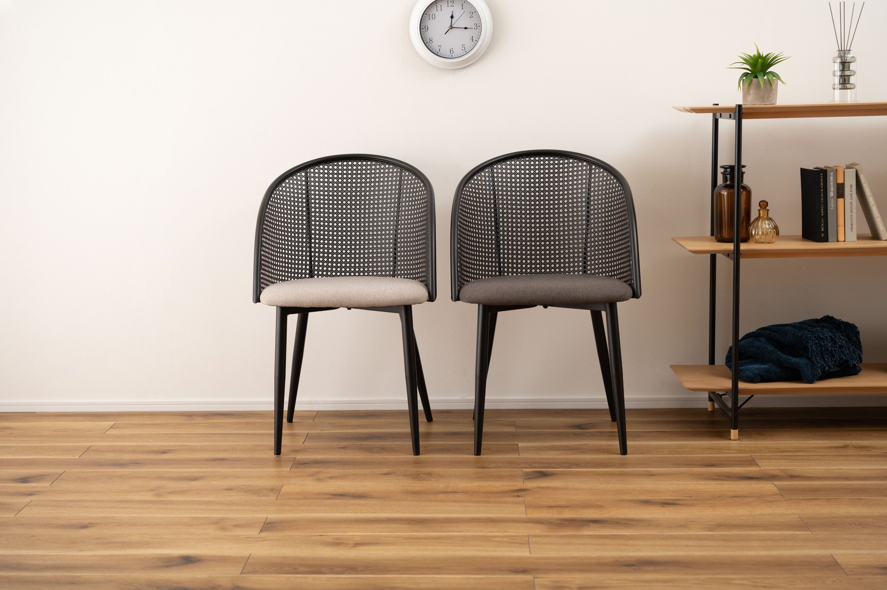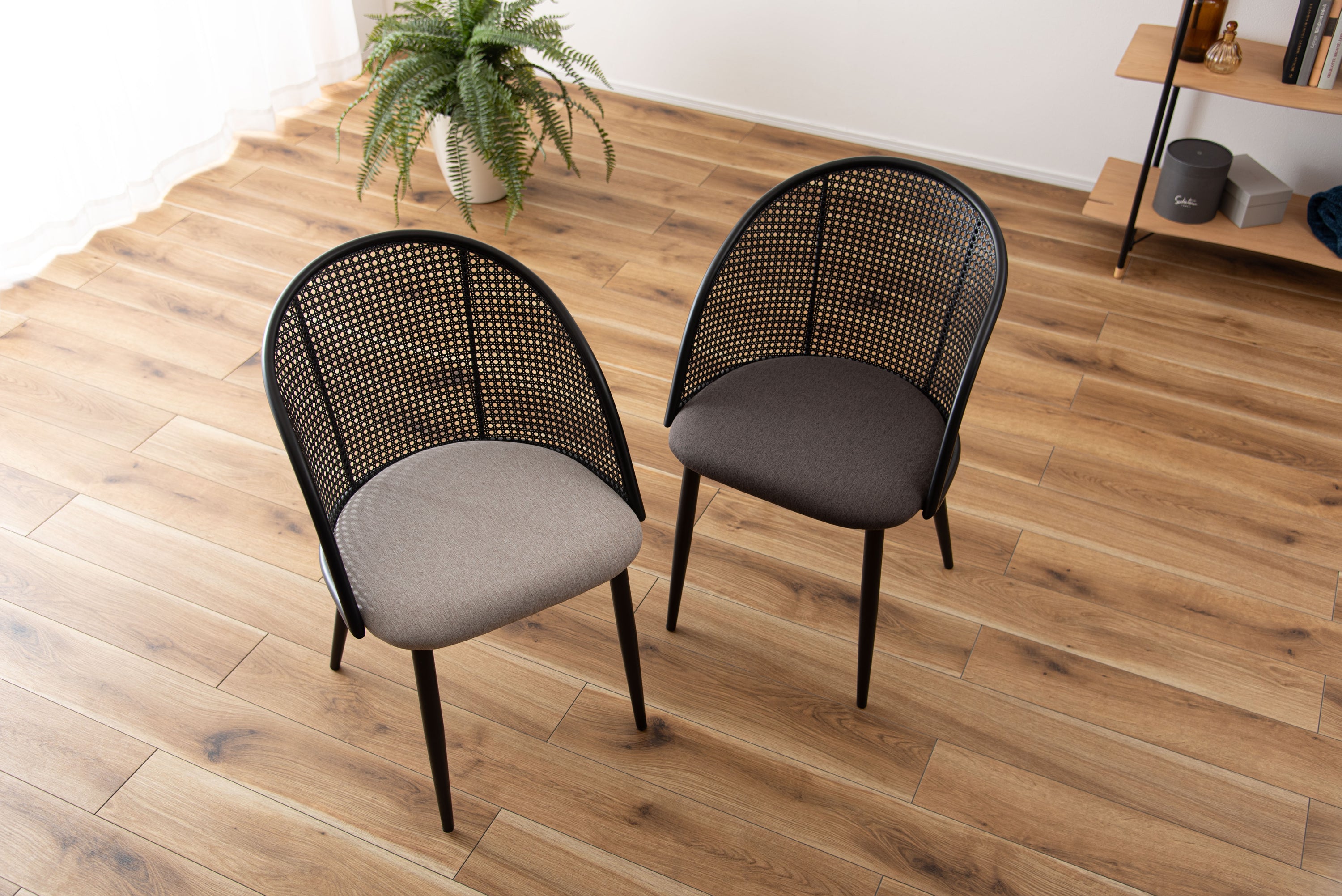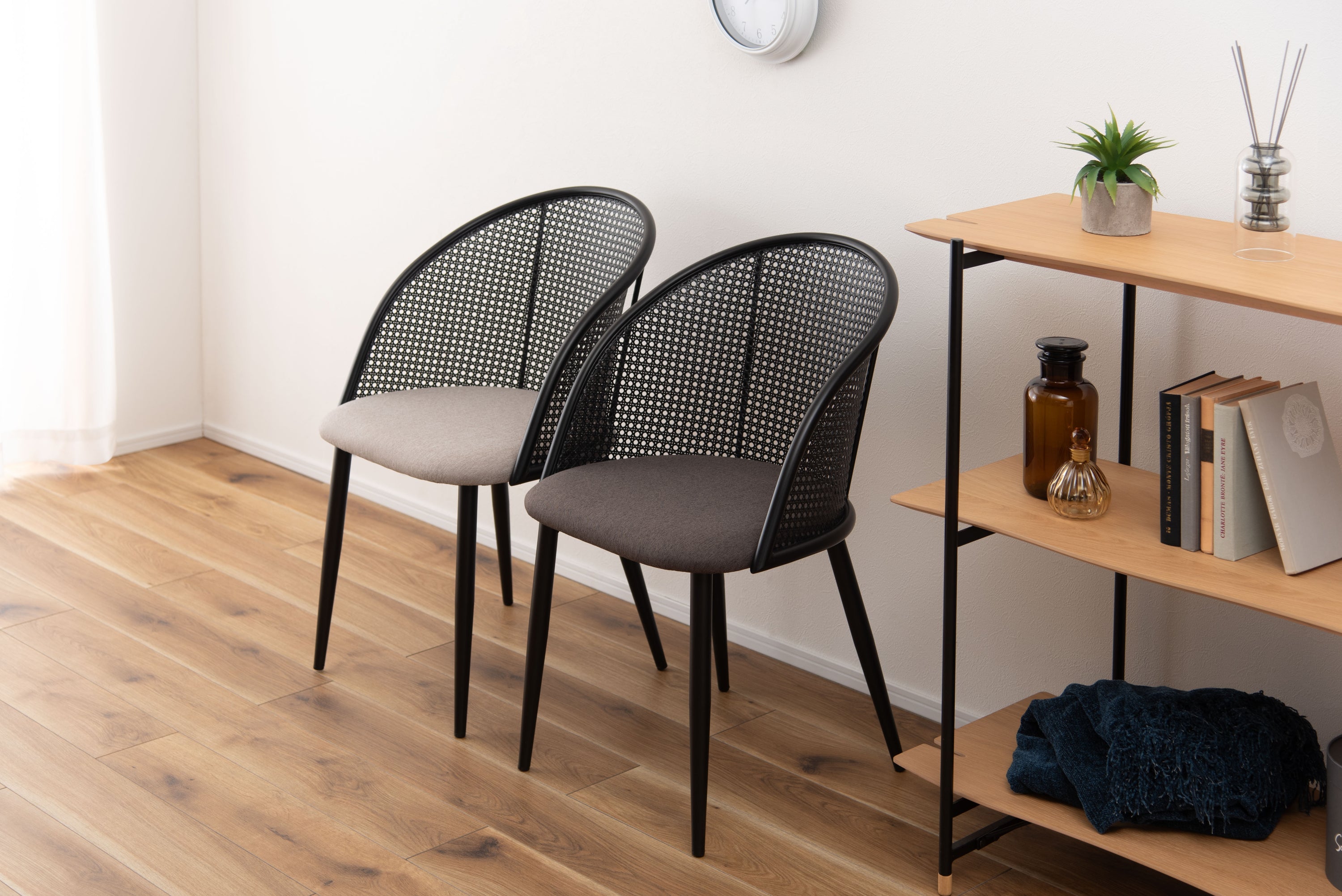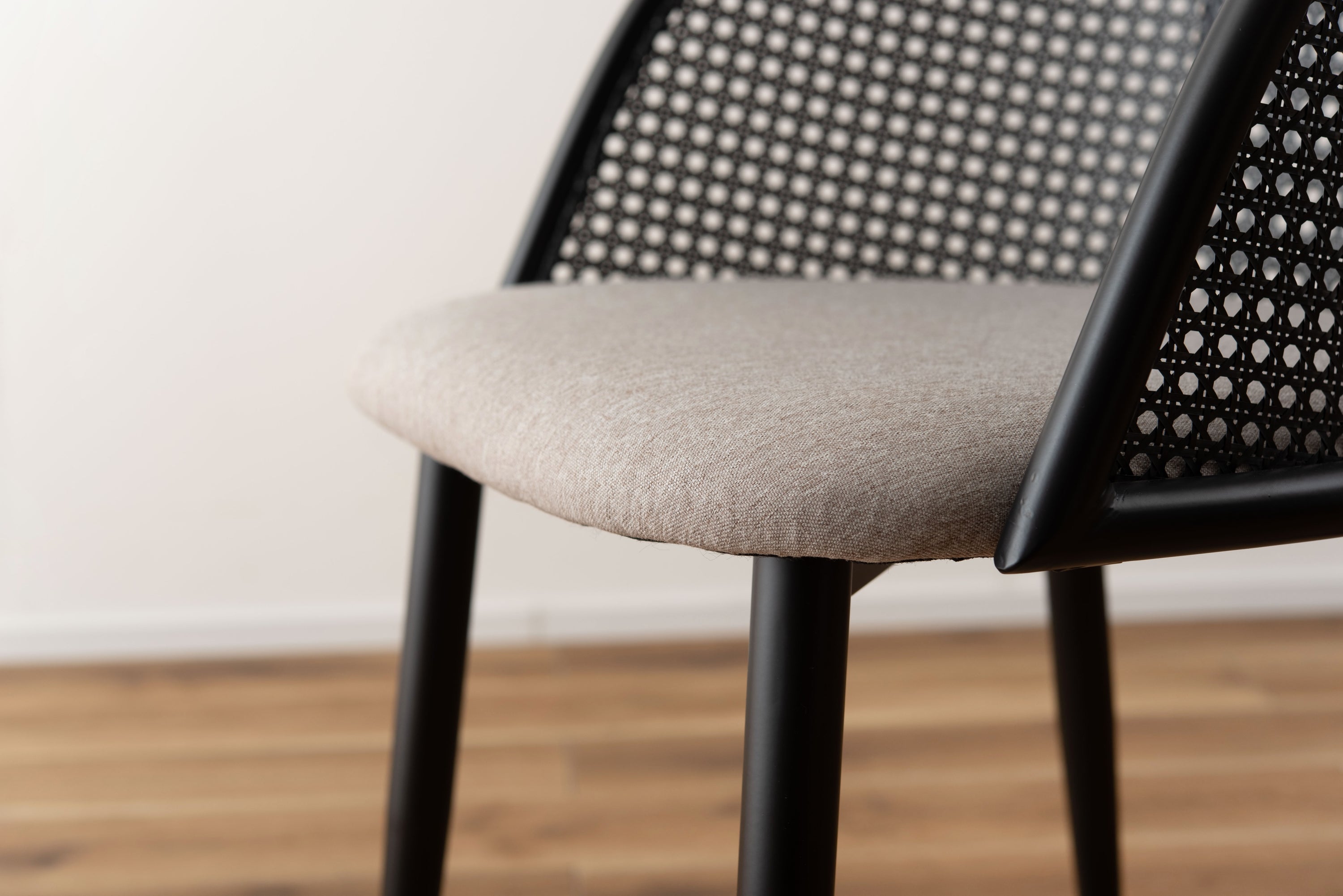 ラタン調×ブラックスチールのスタイリッシュなデザイン。シンプルながら目を引くかごめ編み調デザインを施した背面と、艶を抑えたブラックスチールの組み合わせがモダンなチェア。座面には落ち着いた、モノトーンカラーのファブリックを採用。締まった脚部がシャープな印象を与え、空間に上品さを加えます。