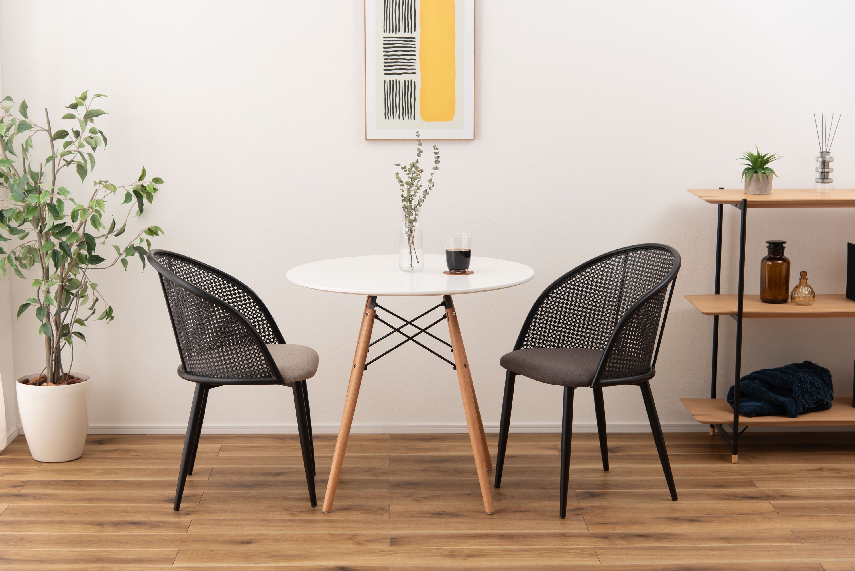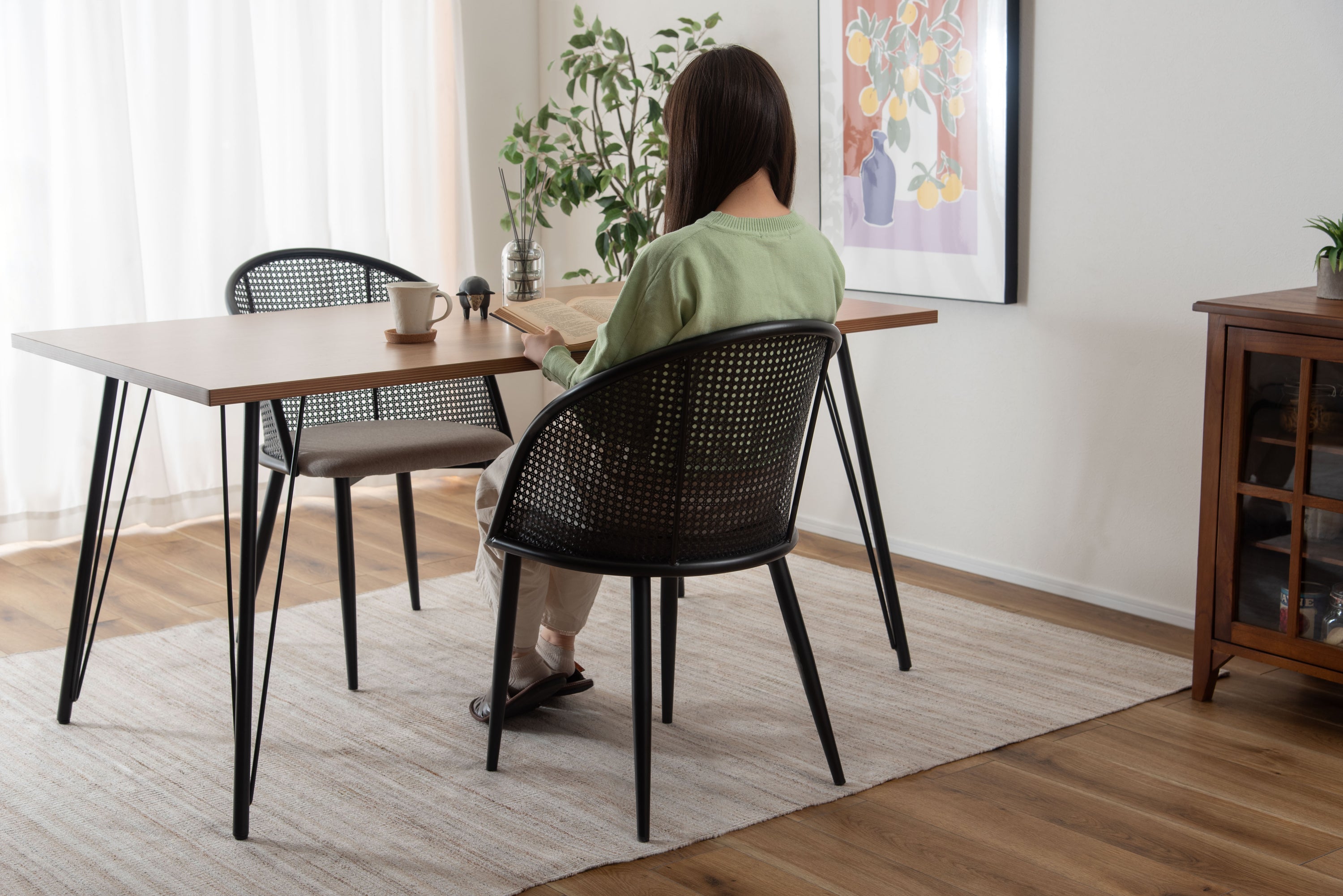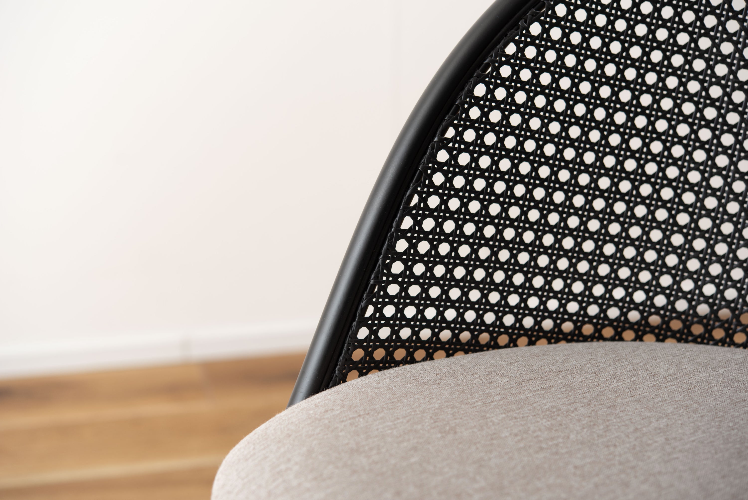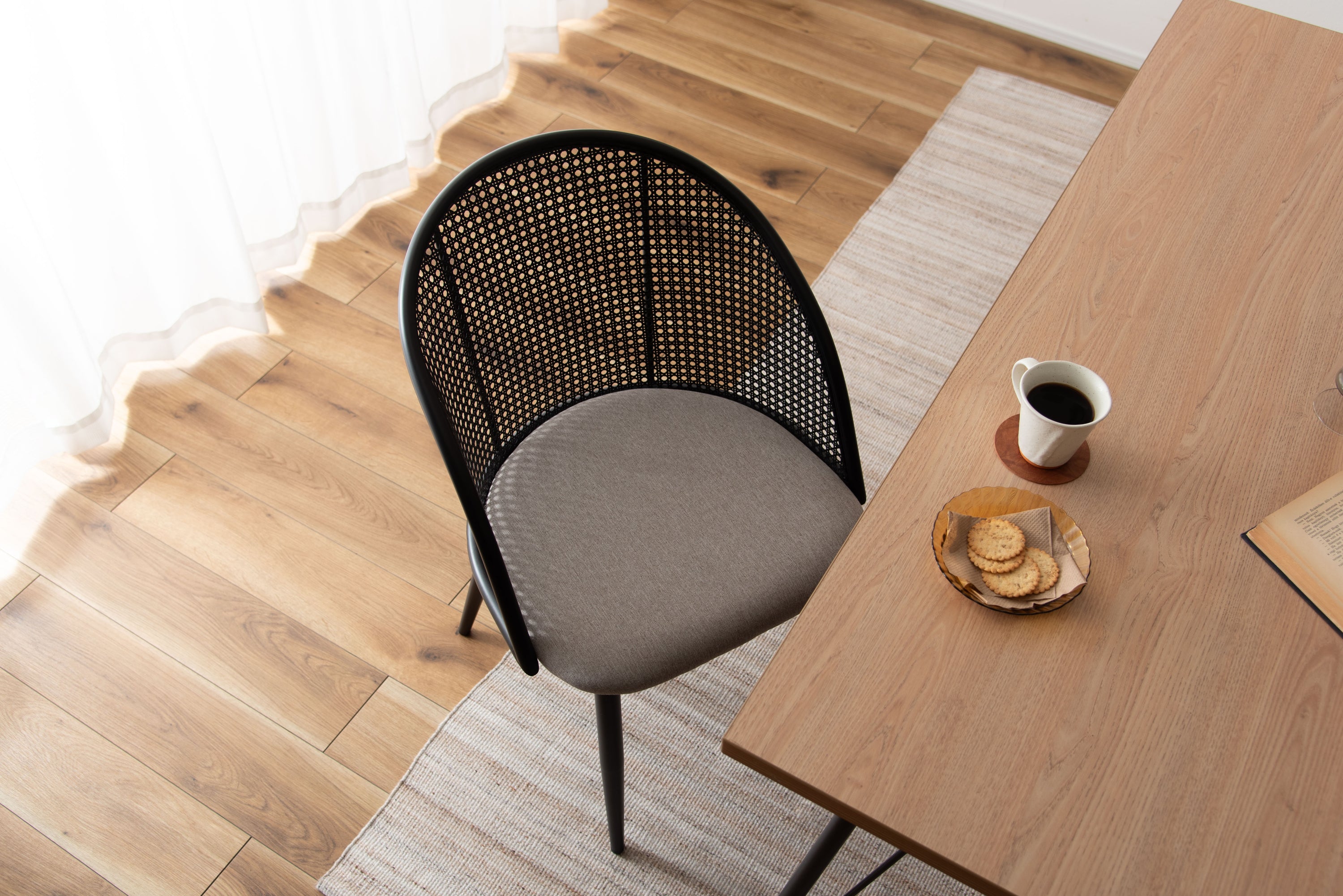ラタン調×ブラックスチールのスタイリッシュなデザイン。シンプルながら目を引くかごめ編み調デザインを施した背面と、艶を抑えたブラックスチールの組み合わせがモダンなチェア。座面には落ち着いた、モノトーンカラーのファブリックを採用。締まった脚部がシャープな印象を与え、空間に上品さを加えます。