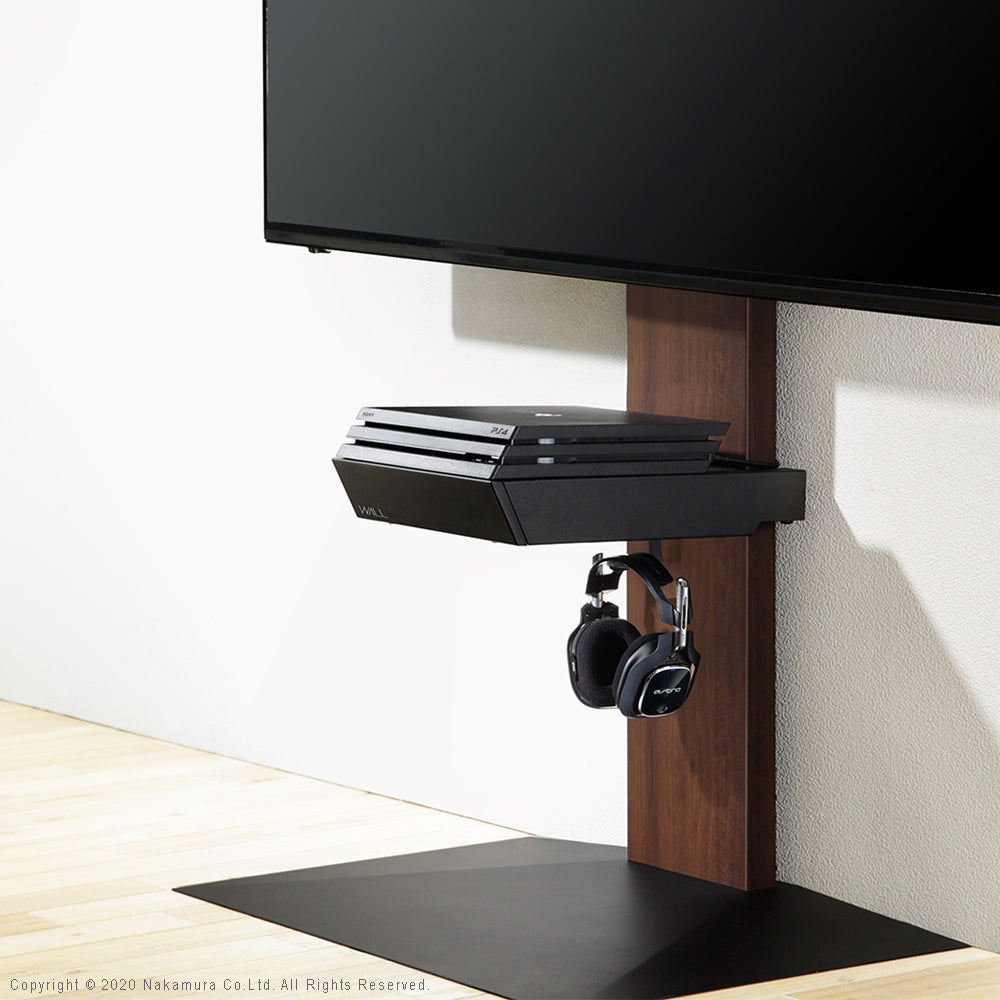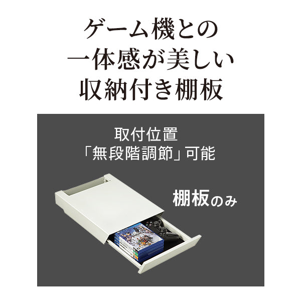 ゲーム機との一体感が美しい収納付き棚板です。シンプルで美しいフォルムかつ、強力なジェルシート付きで機器のズレを防止する機能的なアイテムです。付属の2段フックで引き出し下部にヘッドセットなどを収納することができます。
