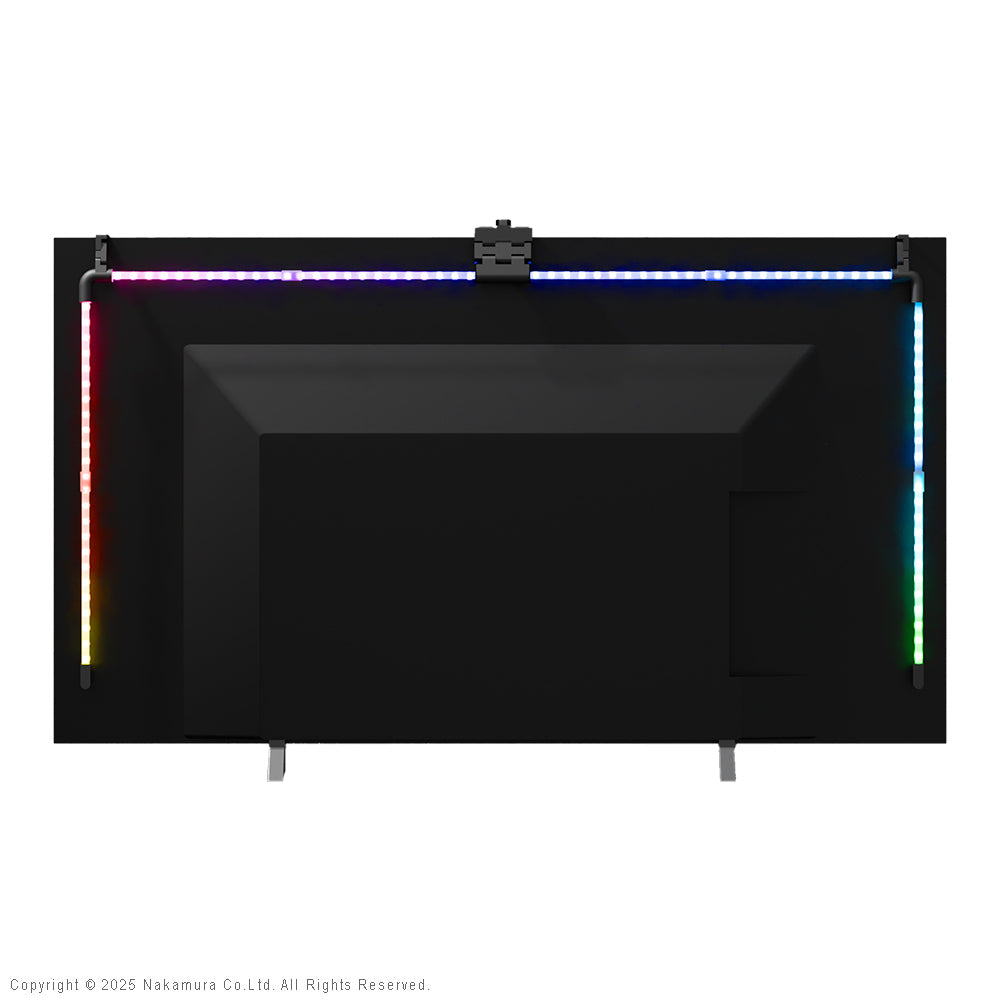 映像の世界が空間に溢れ出すテレビと光が連動する間接照明です。フック式でテレビ背面に取り付けるだけで、かつてない没入感を得られます。上部に設置されたカメラが画面の色味を読み取り、映像とシンクロしてLEDを光らせます。画面を超えて光が広がることで、映像がお部屋に広がったような効果を演出します。