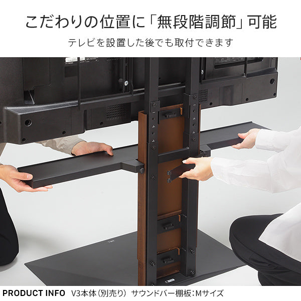 テレビに接続するオーディオ機器をベストポジションにセットできるサウンドバー棚板です。こだわりの位置に無段階で調整可能です。美しさにこだわったシンプルなデザインで、サテン塗装を施しているので傷も目立ちません。