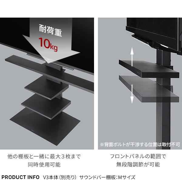 テレビに接続するオーディオ機器をベストポジションにセットできるサウンドバー棚板です。こだわりの位置に無段階で調整可能です。美しさにこだわったシンプルなデザインで、サテン塗装を施しているので傷も目立ちません。