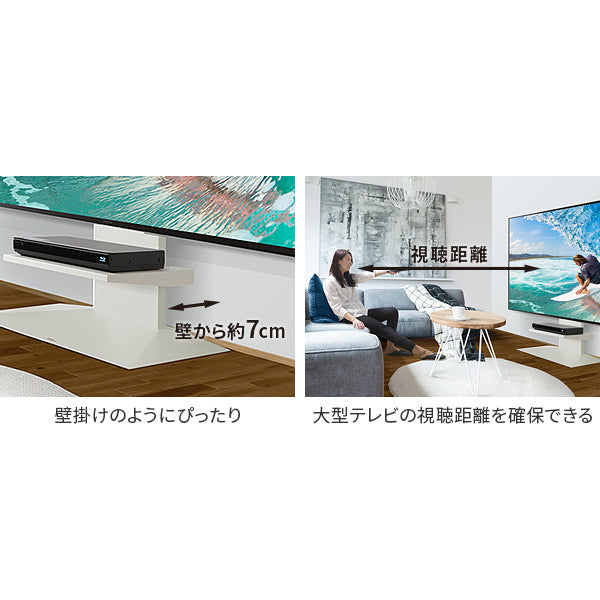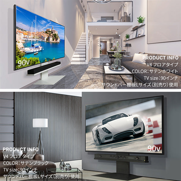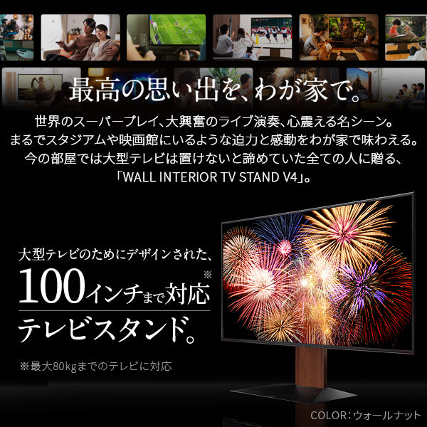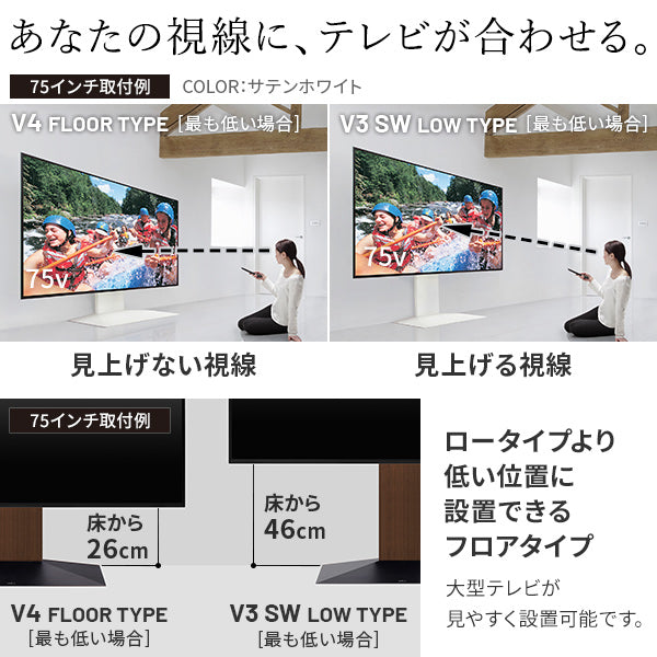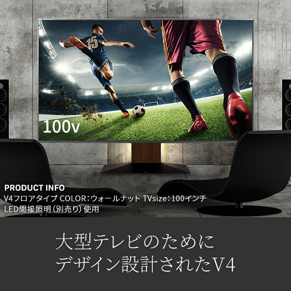 大型テレビ用に設計されたテレビスタンドです。100インチまで対応しており、最大80kgまで設置可能です。大型テレビをより美しく見せる重厚で大きなベースと、低くあなたの目線にある設計になっています。