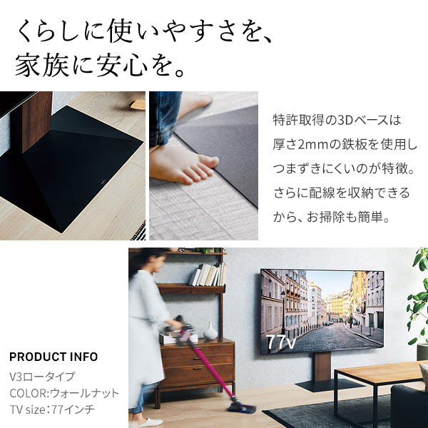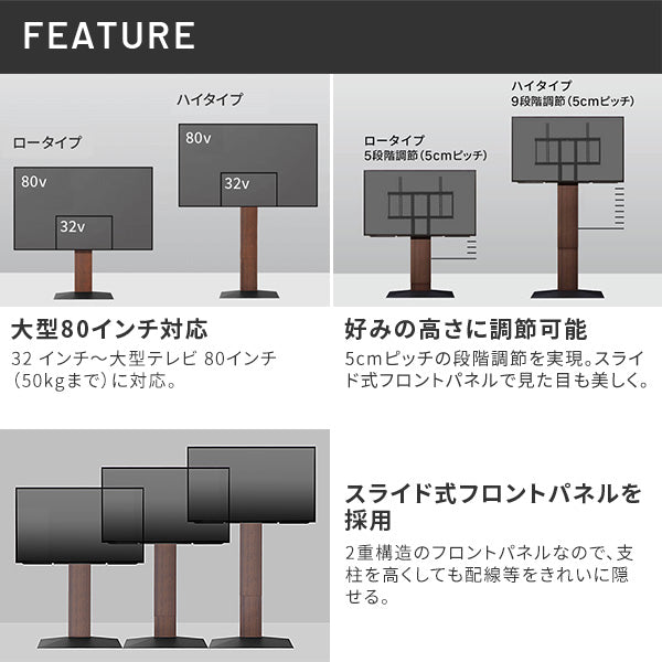 視界が広がるスイングタイプのテレビスタンドです。壁際に設置しても窓からの光を避けたり利用シーンによって角度を変更して使用することができます。床や壁に溶け込むカラーバリエーションが豊富でお部屋の中でも目立たず綺麗にテレビを設置することが可能です。