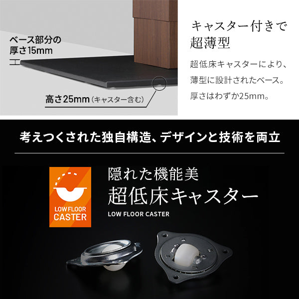 キャスターとグリップで大型テレビを移動、回転できるハイタイプのテレビスタンドです。置き場所も自由自在で、家族で見やすいコーナーや窓際にも置くことが可能です。目立たない超低床キャスターなので、キャスターの印象もなく、スタイリッシュに空間に馴染みます。
